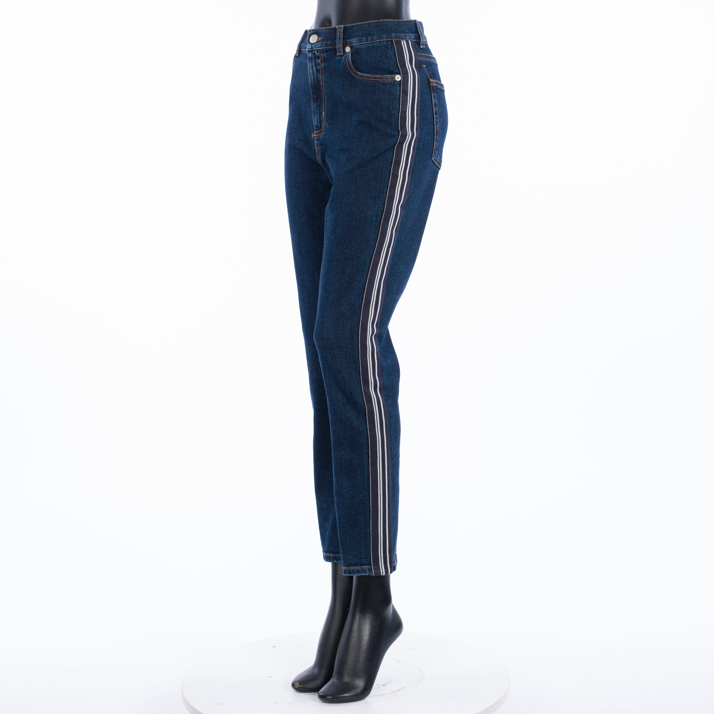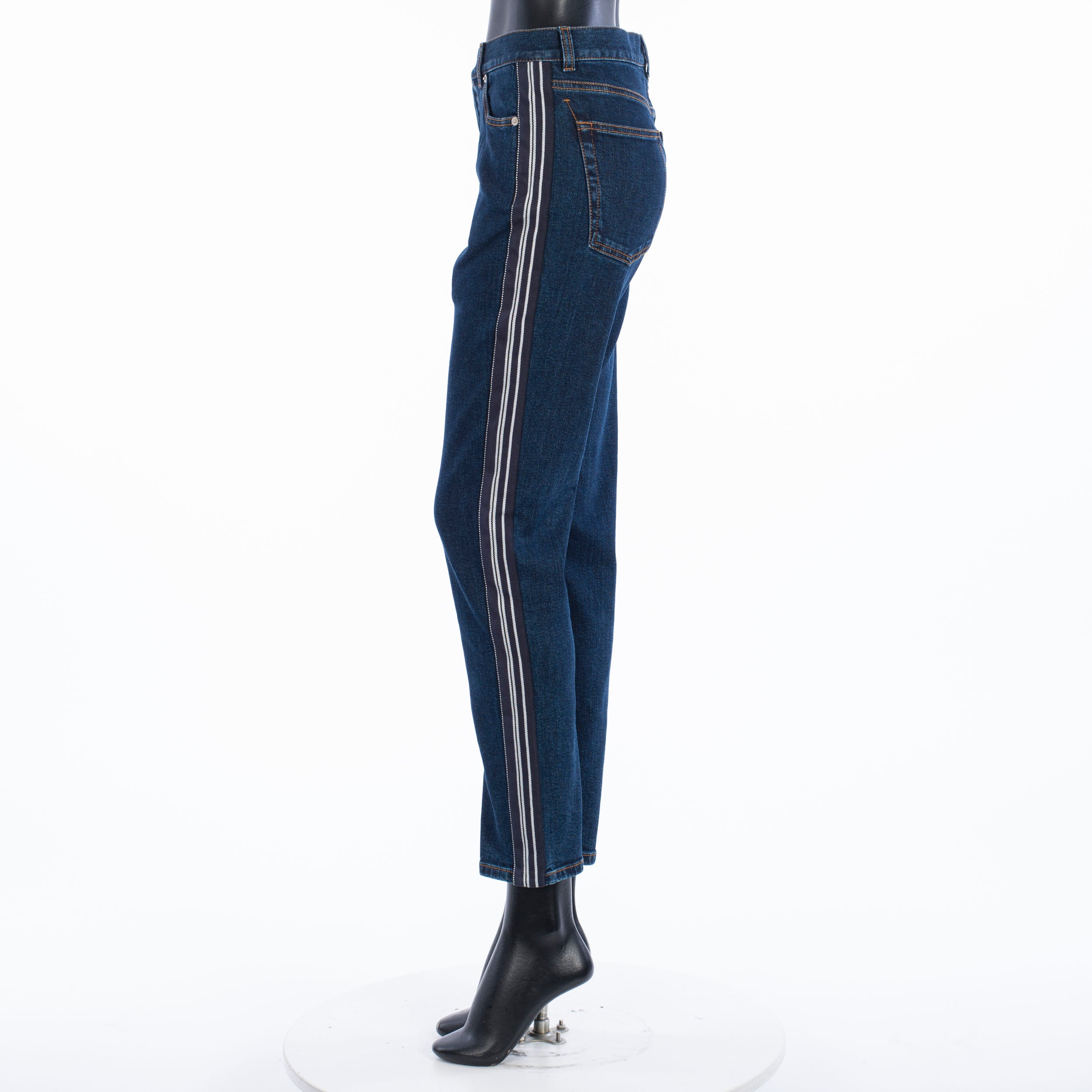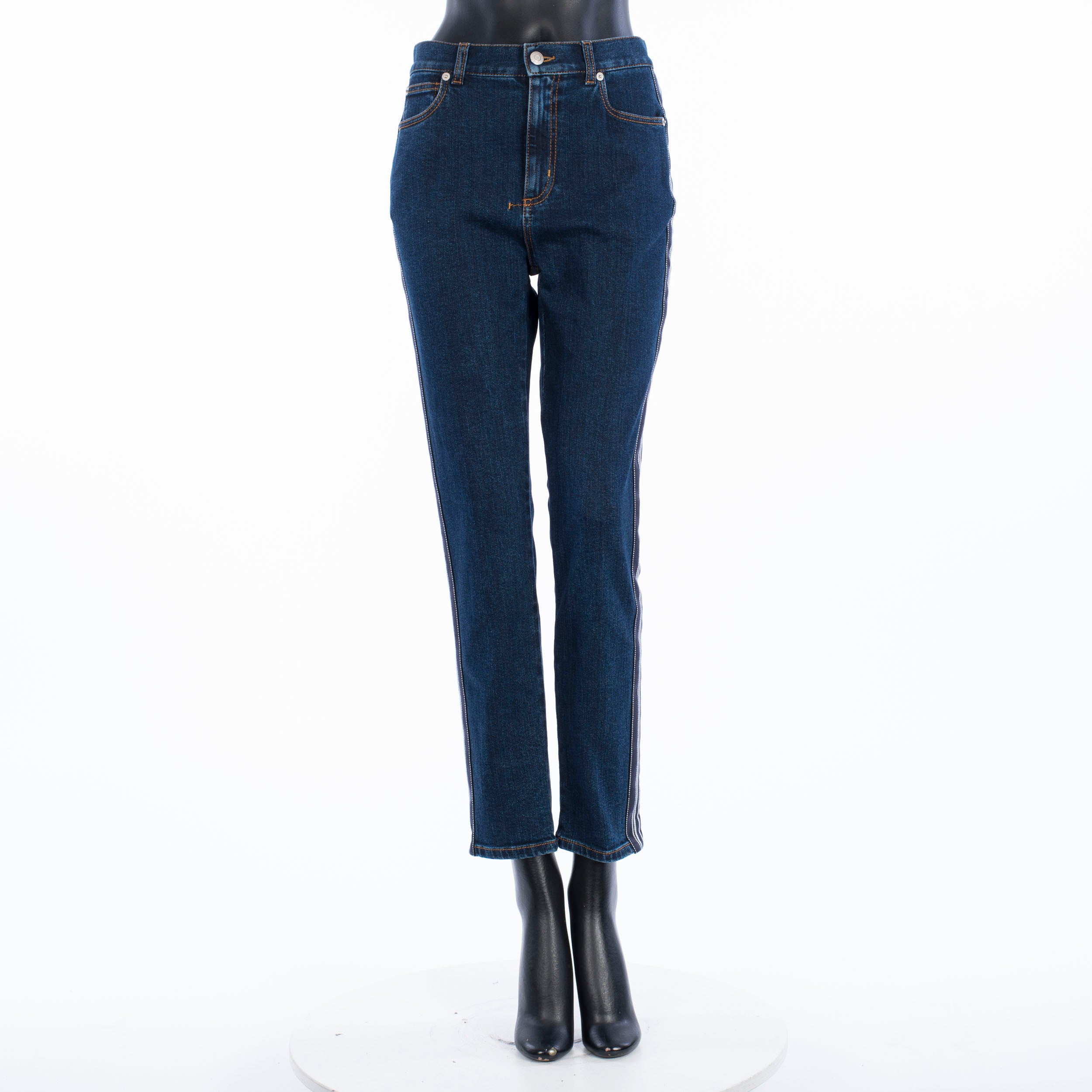 Fitted stretch mid-rise skinny jeans with contrast side band detailFabric: 98% Cotton; 2% ElastanMade in: ItalyModel no.: 650649-QMAA8-4089
