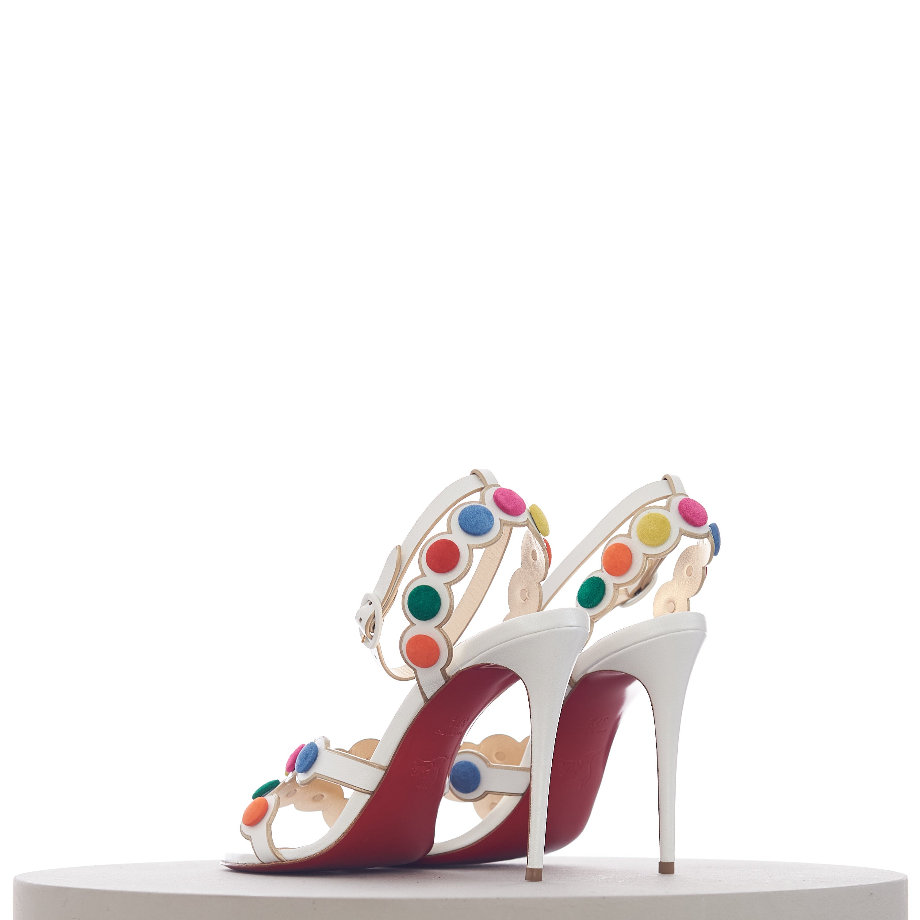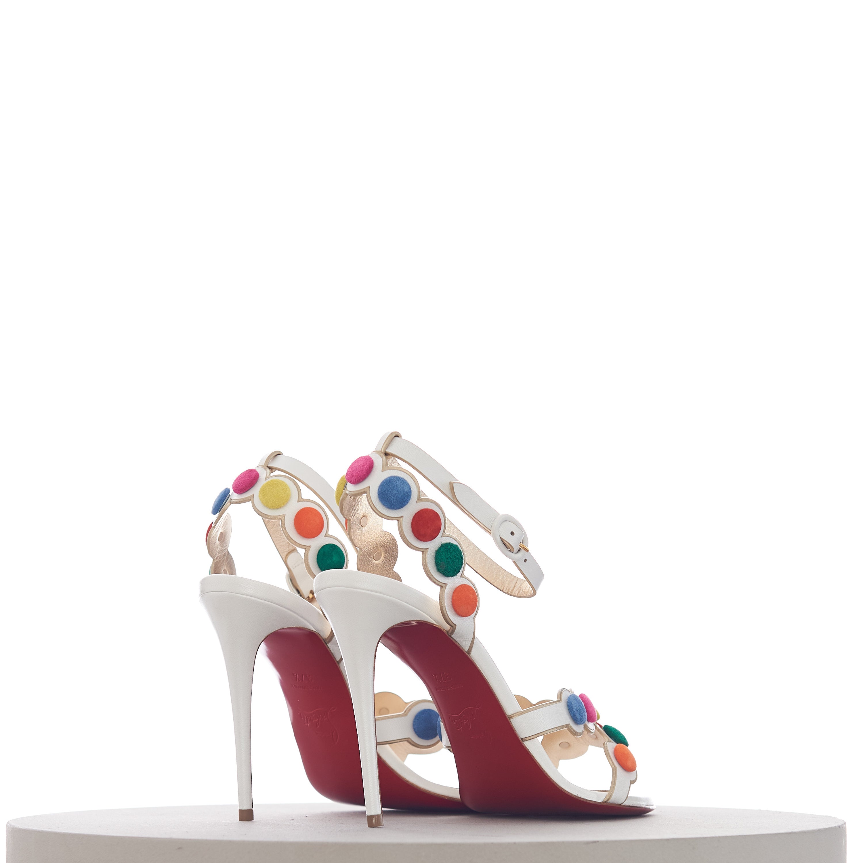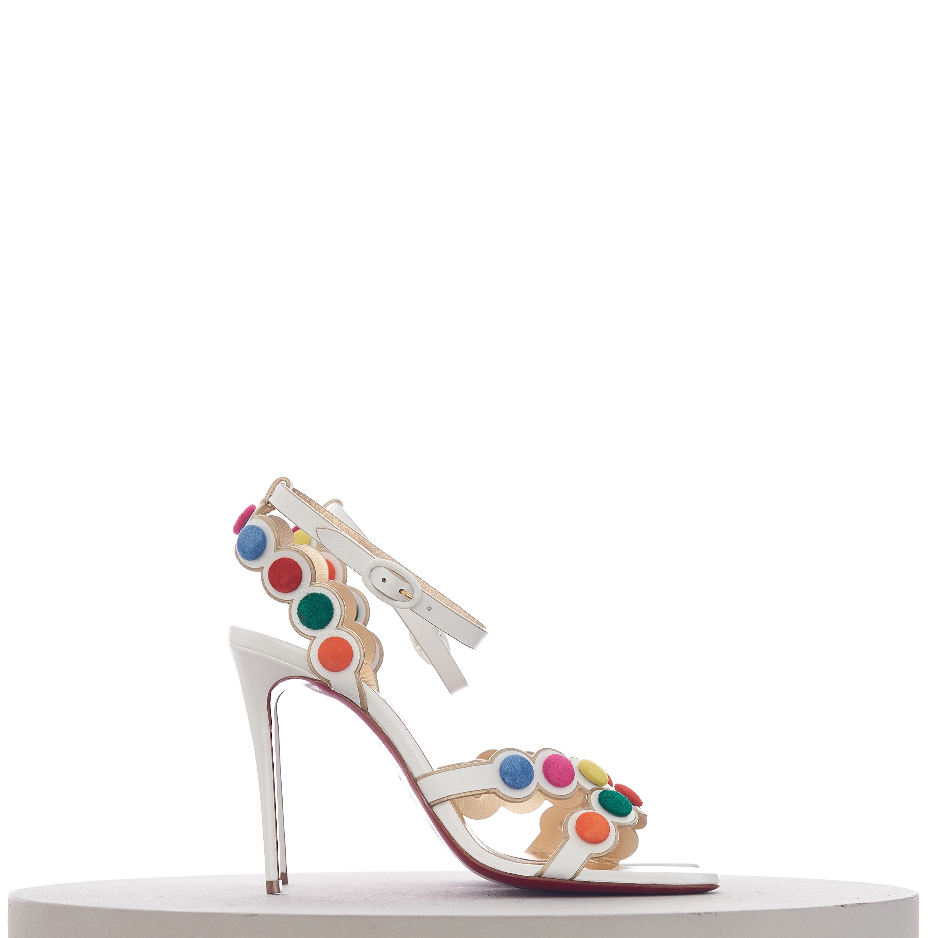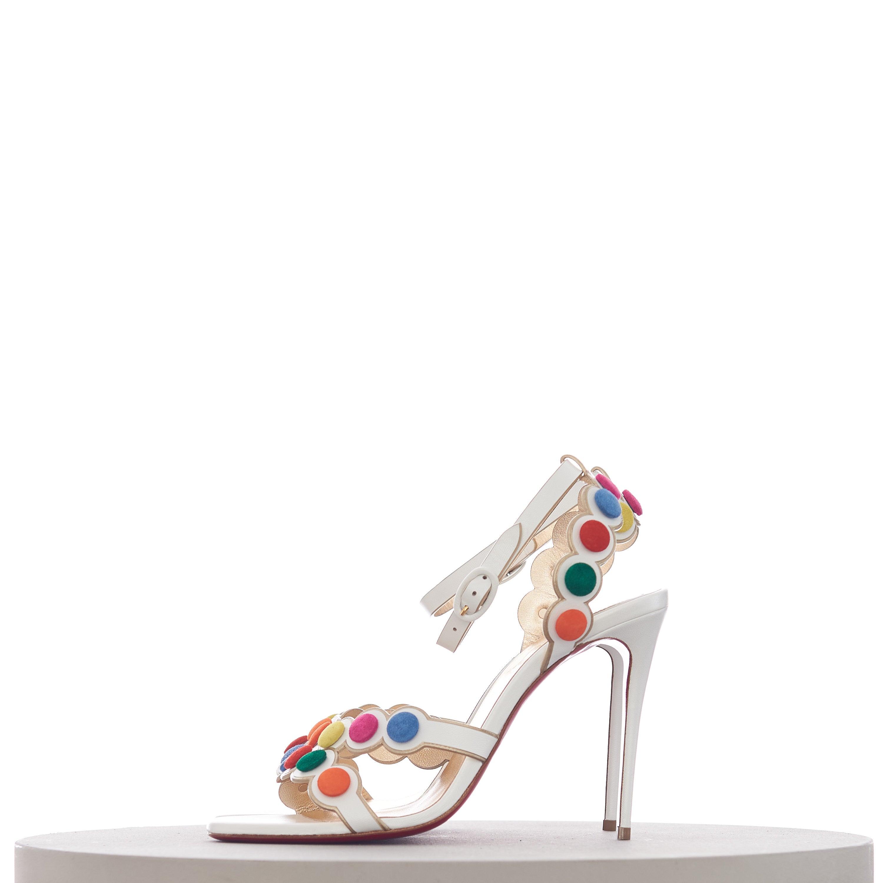 The Smartissima is a fun take on the strappy sandal. In a playful nod to the iconic Smarties sweets from Great Britain, the subtly iridescent white Kid Irisé upper features a circle pattern, mounted with multi-coloured disks that look just like these cris