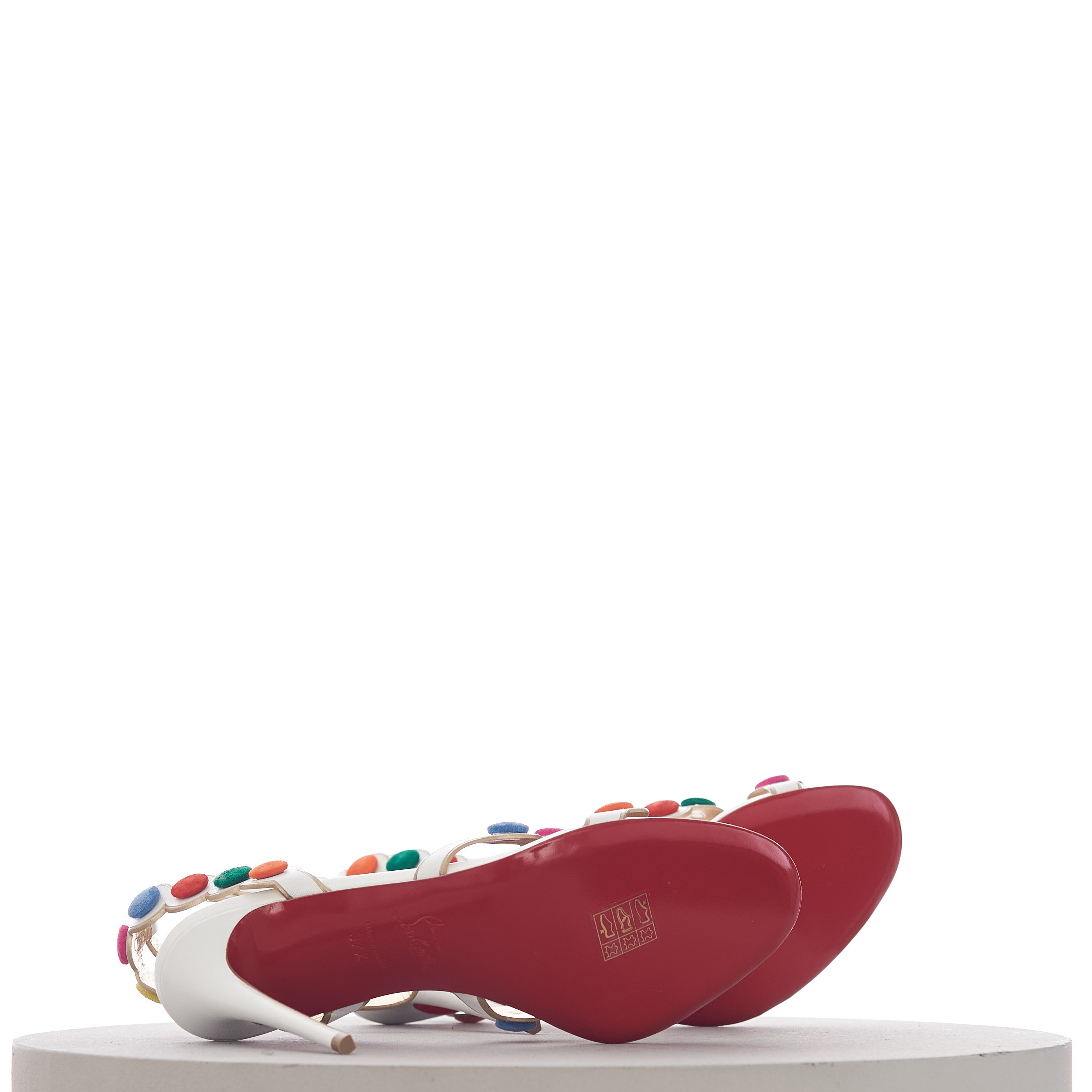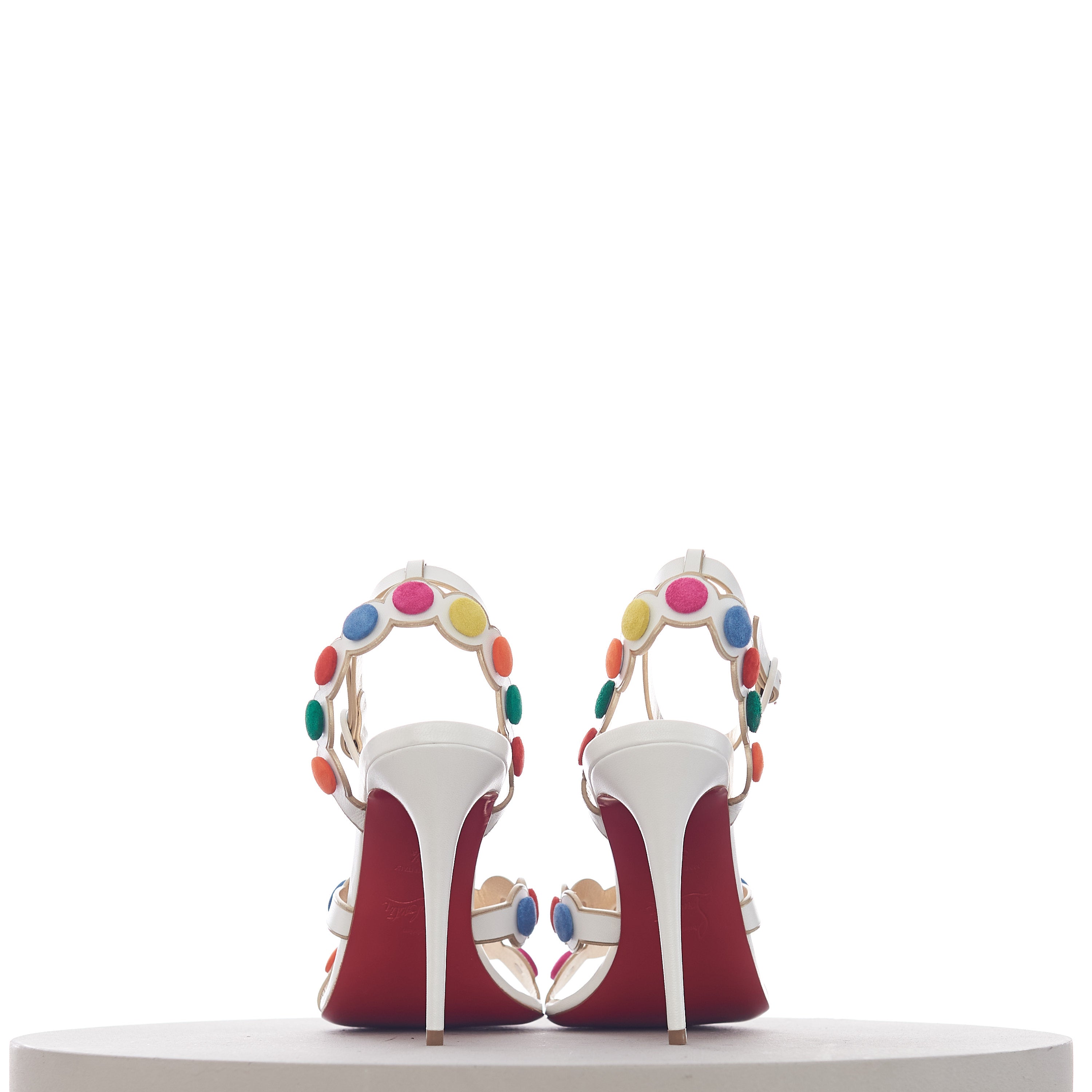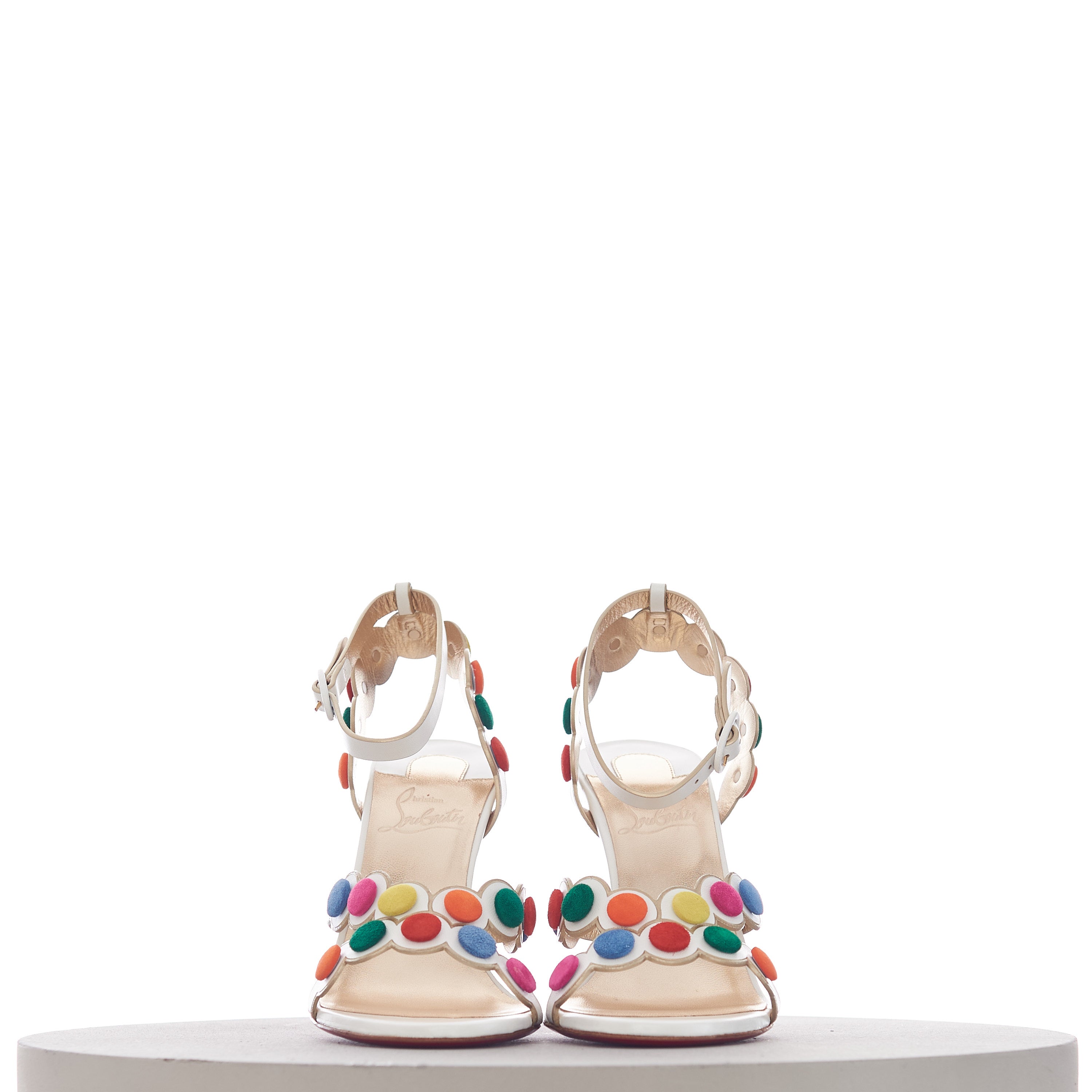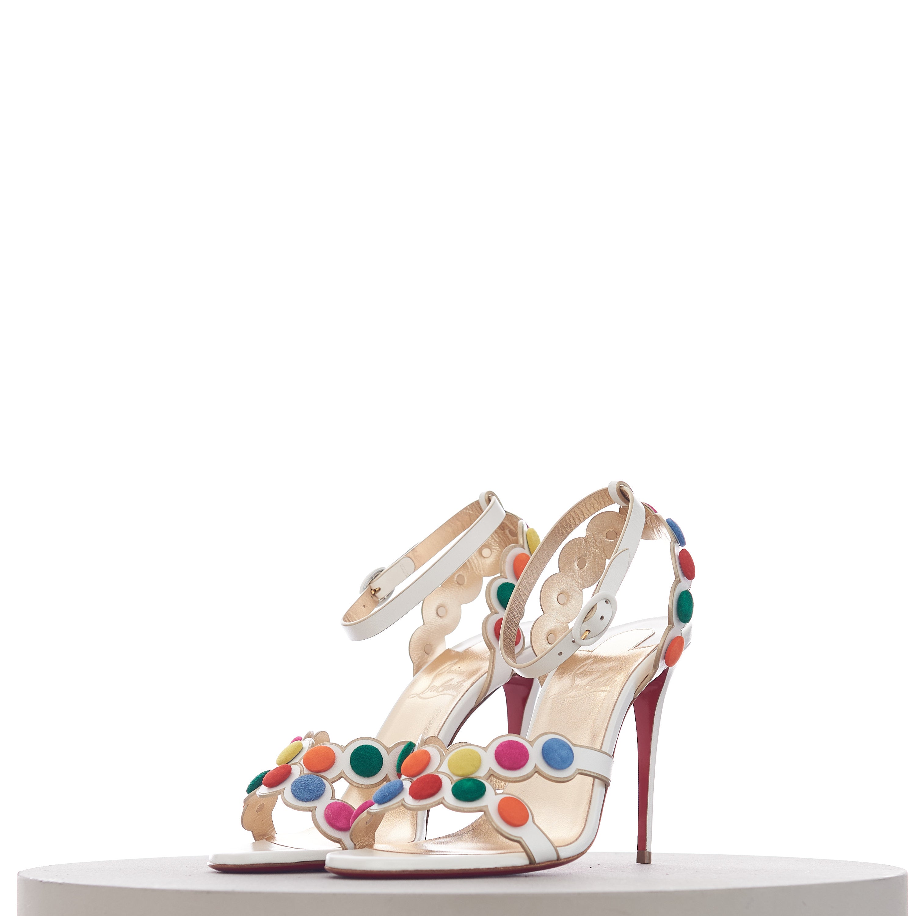 The Smartissima is a fun take on the strappy sandal. In a playful nod to the iconic Smarties sweets from Great Britain, the subtly iridescent white Kid Irisé upper features a circle pattern, mounted with multi-coloured disks that look just like these cris