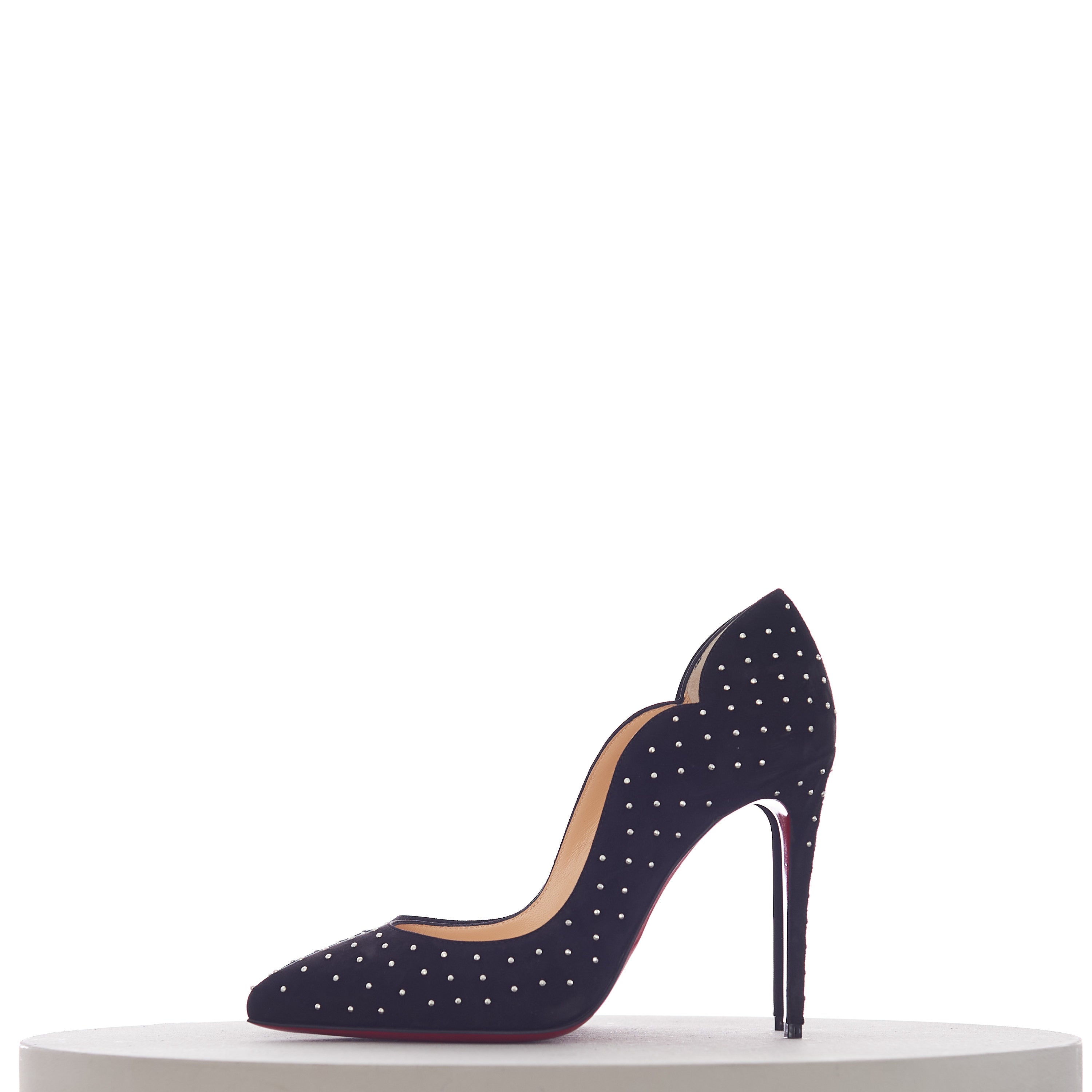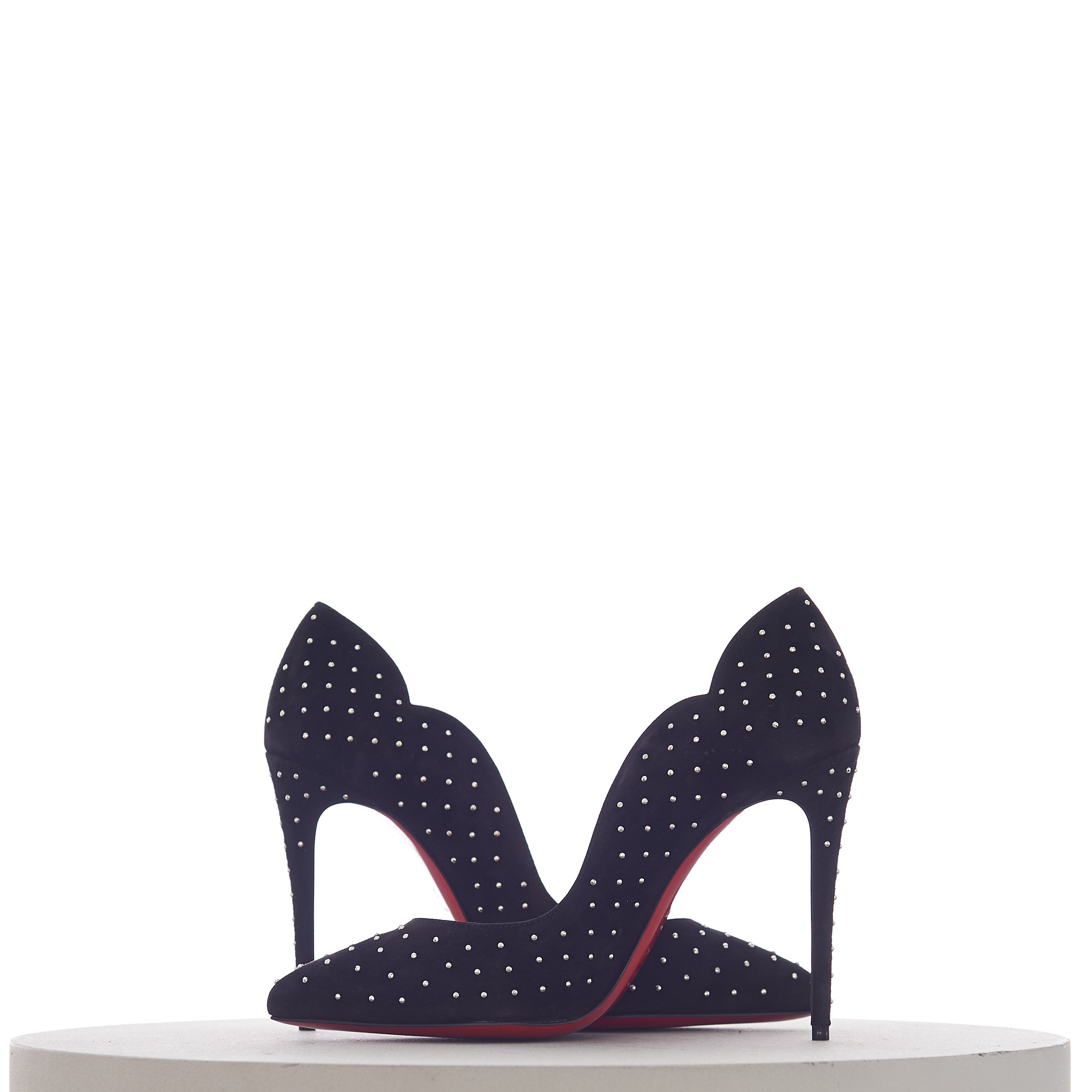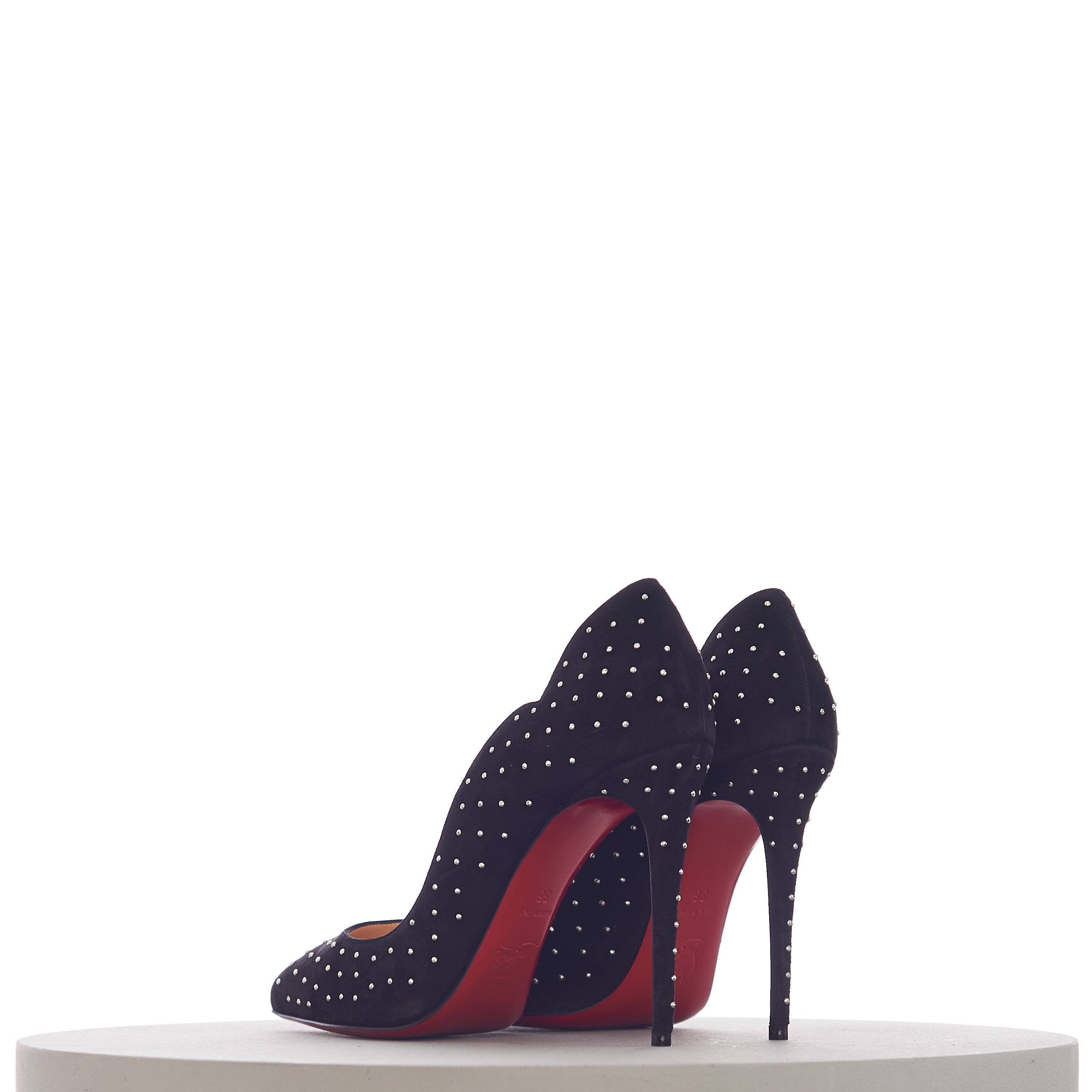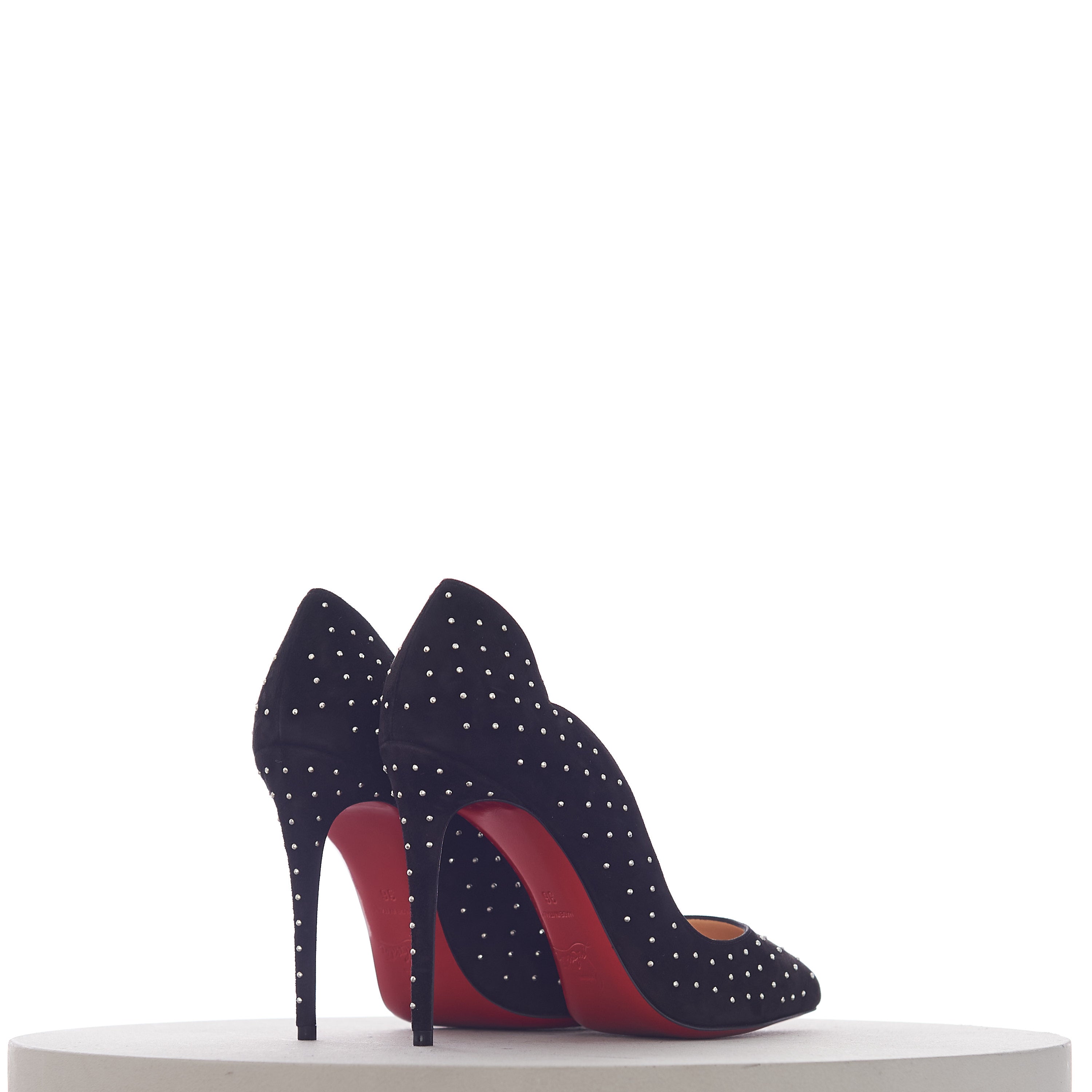 The modern and sophisticated design of the Hot Chick stiletto pump comes in black suede calfskin dressed in a silver-coloured plumetis effect. The pointed toe and original curved openings of this shoe boldly reveal the foot, while its 100 mm heel elegantl