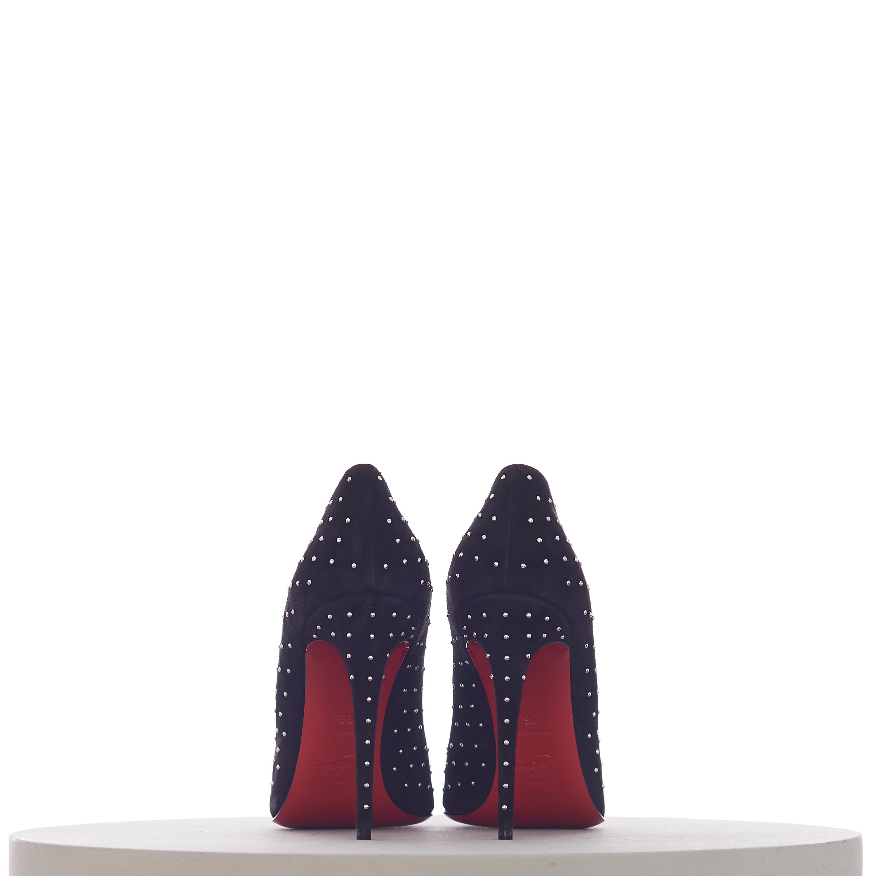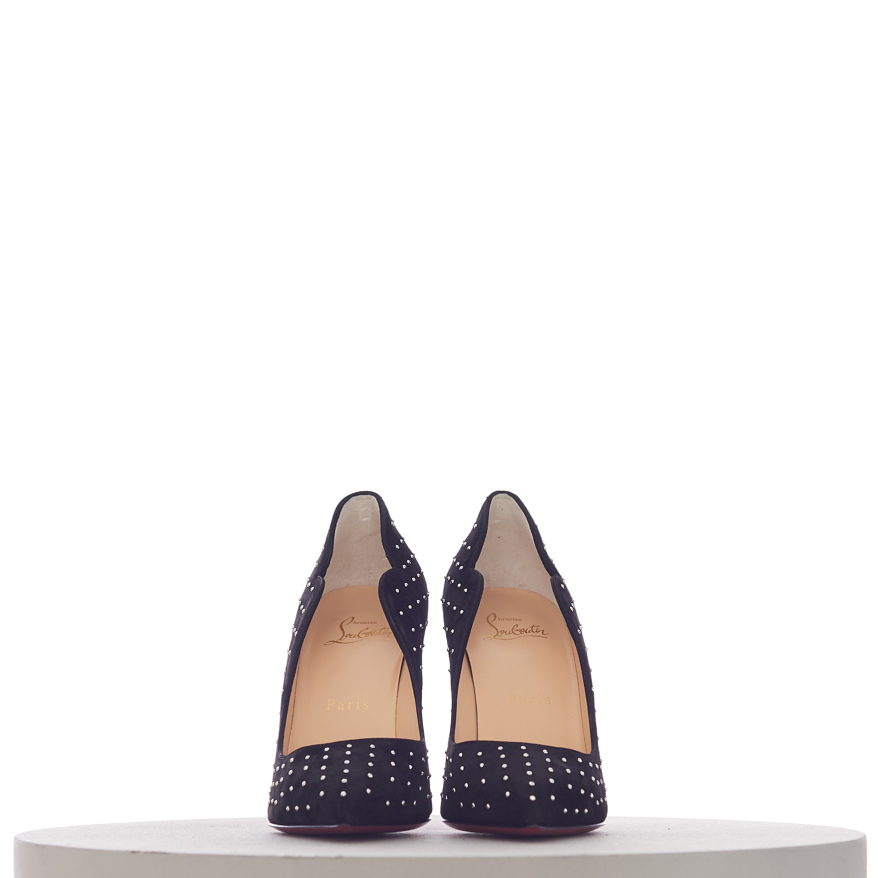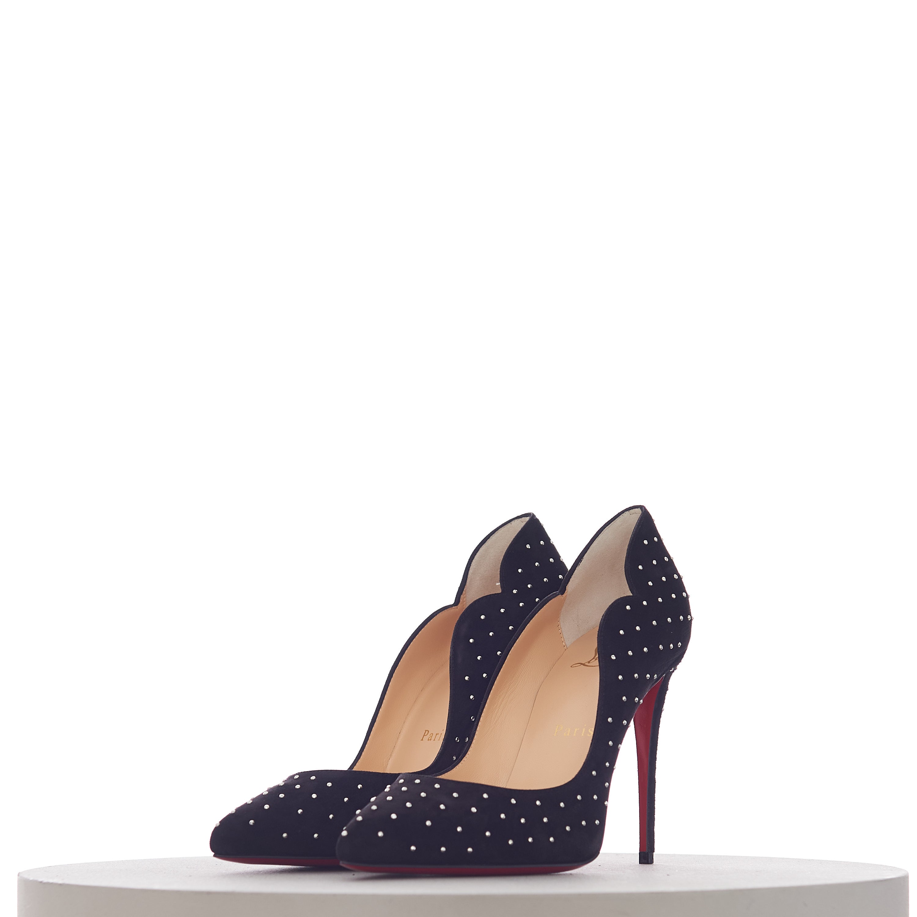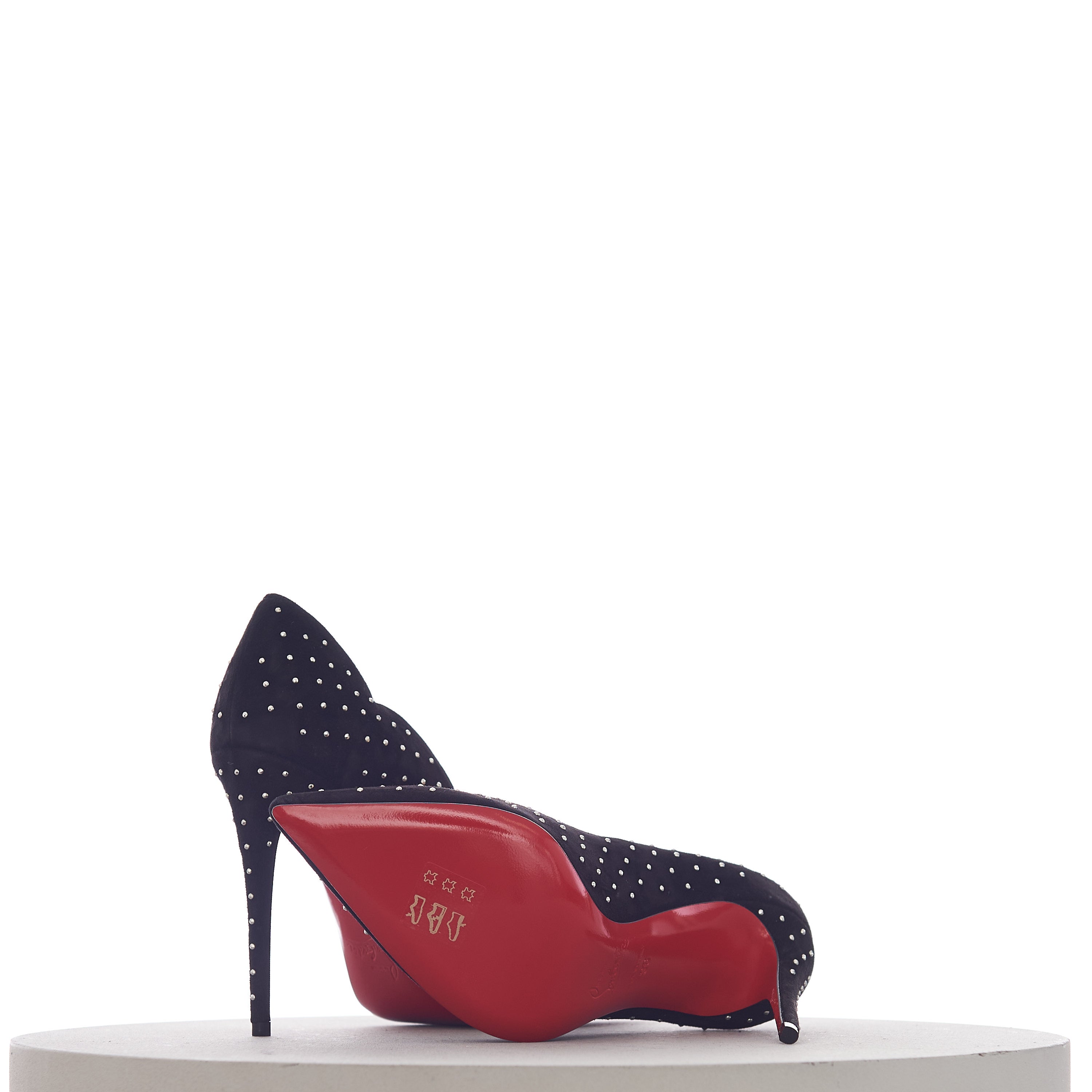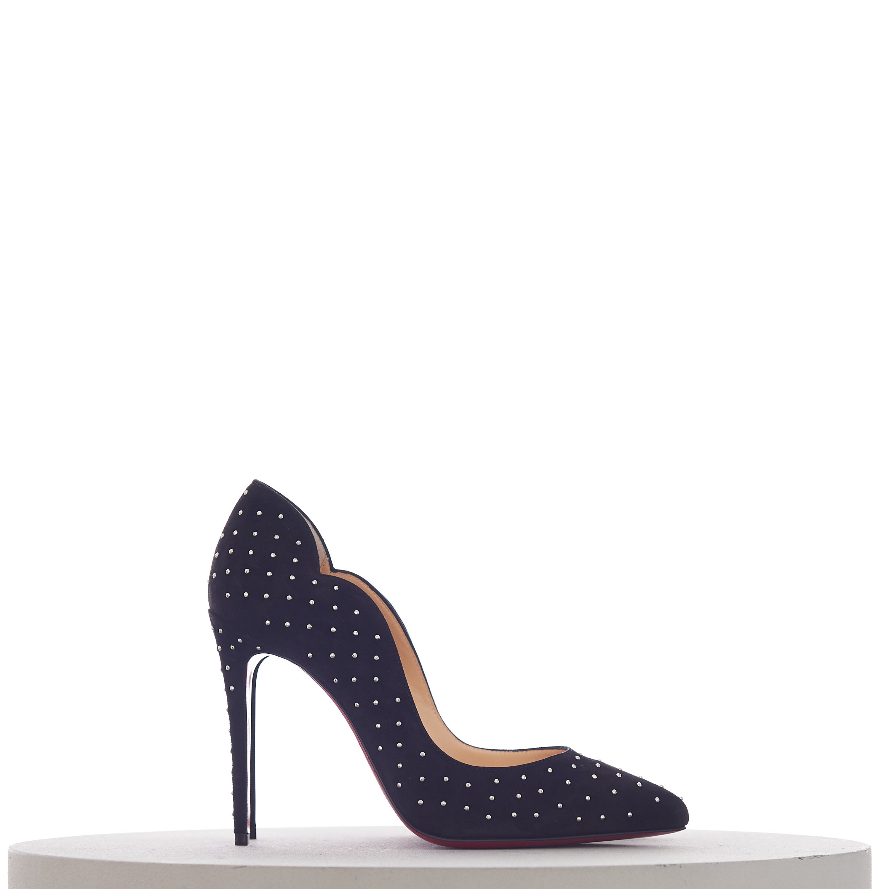The modern and sophisticated design of the Hot Chick stiletto pump comes in black suede calfskin dressed in a silver-coloured plumetis effect. The pointed toe and original curved openings of this shoe boldly reveal the foot, while its 100 mm heel elegantl