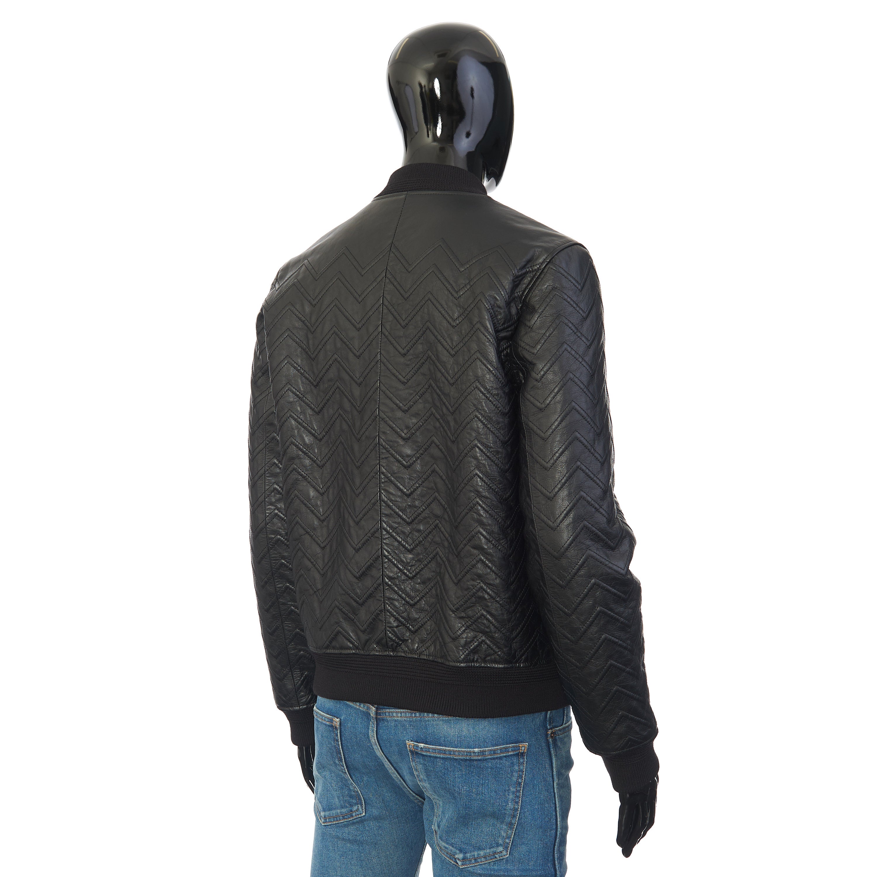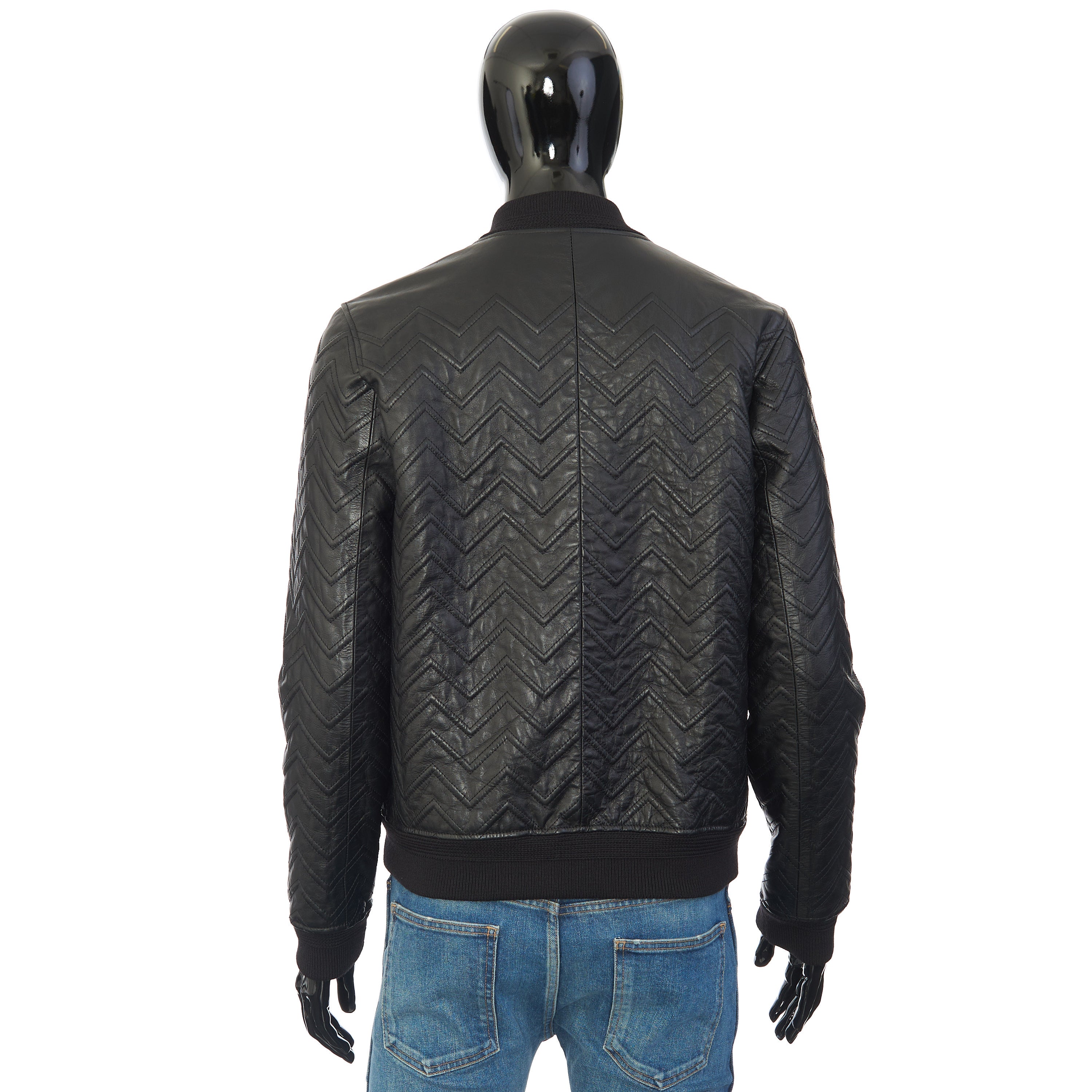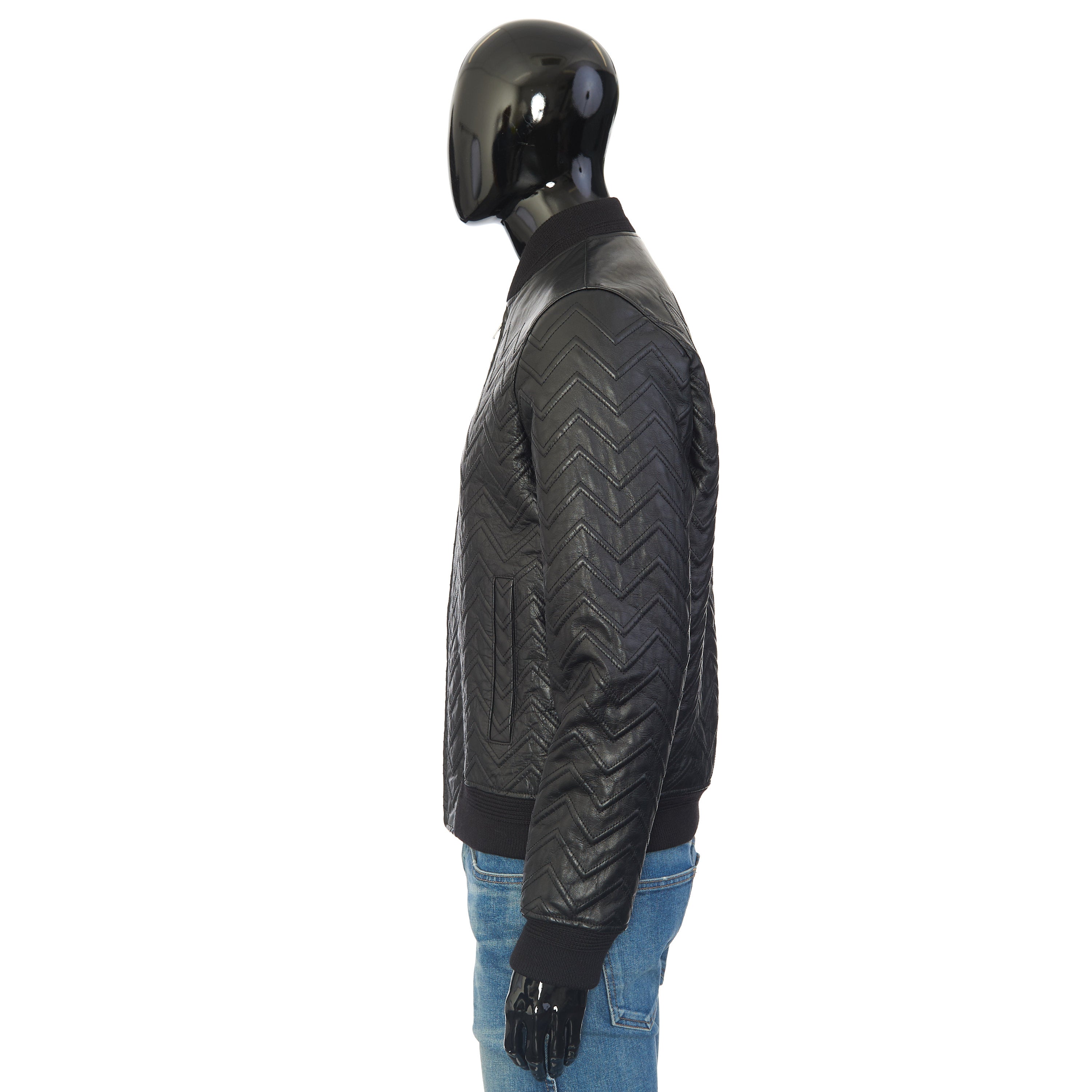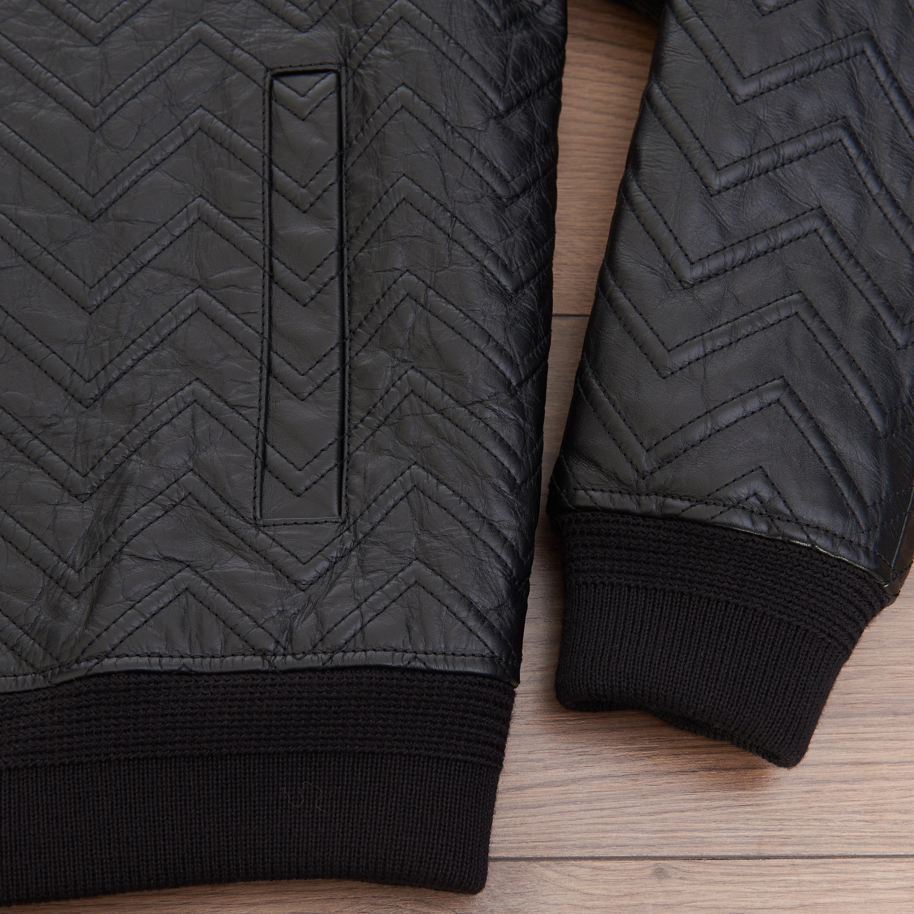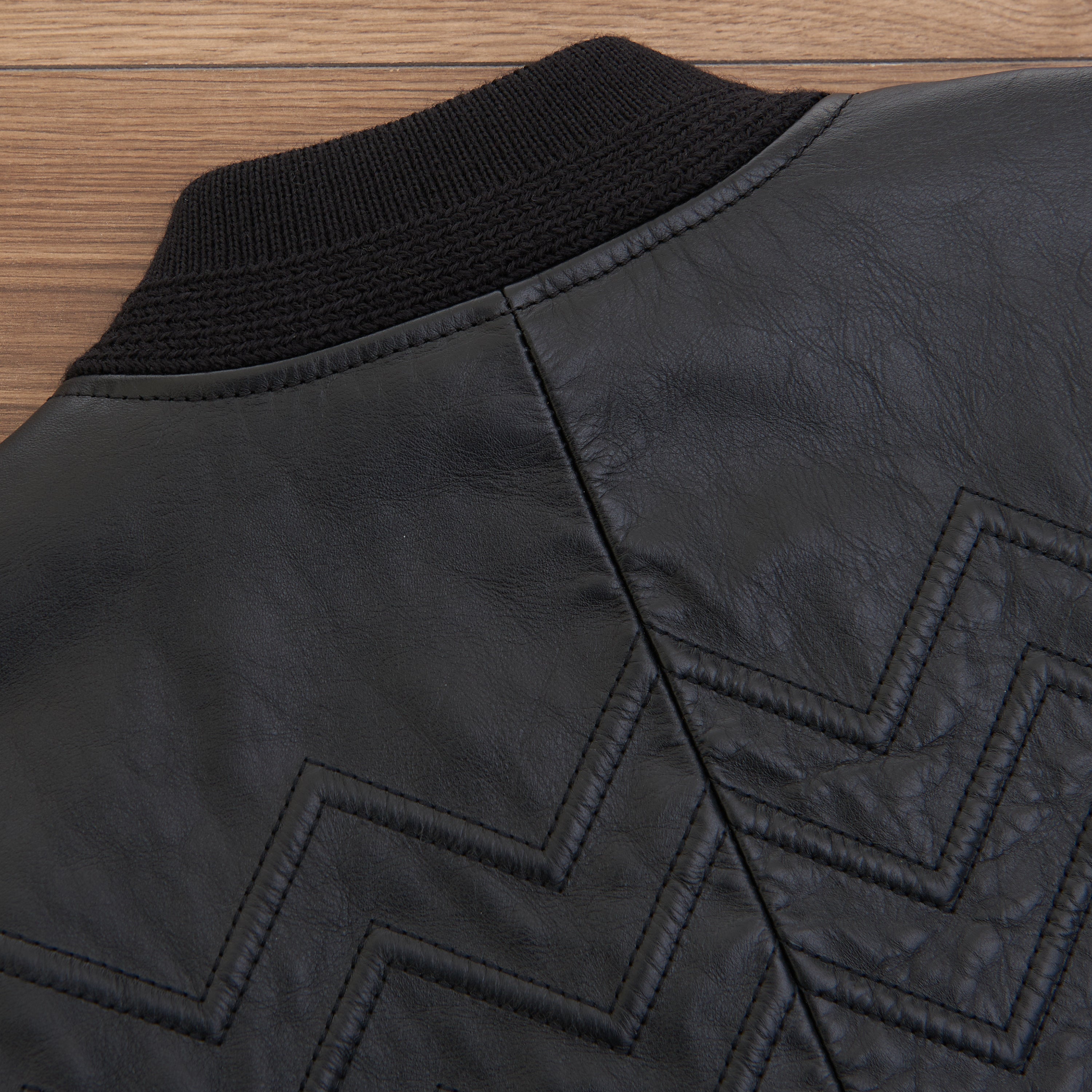 Oversized bomber jacket made with metal-free tanned leather with a zip front closure, decorated in an all-over chevron motif and featuring rib-knit collar, cuffs and waistband.