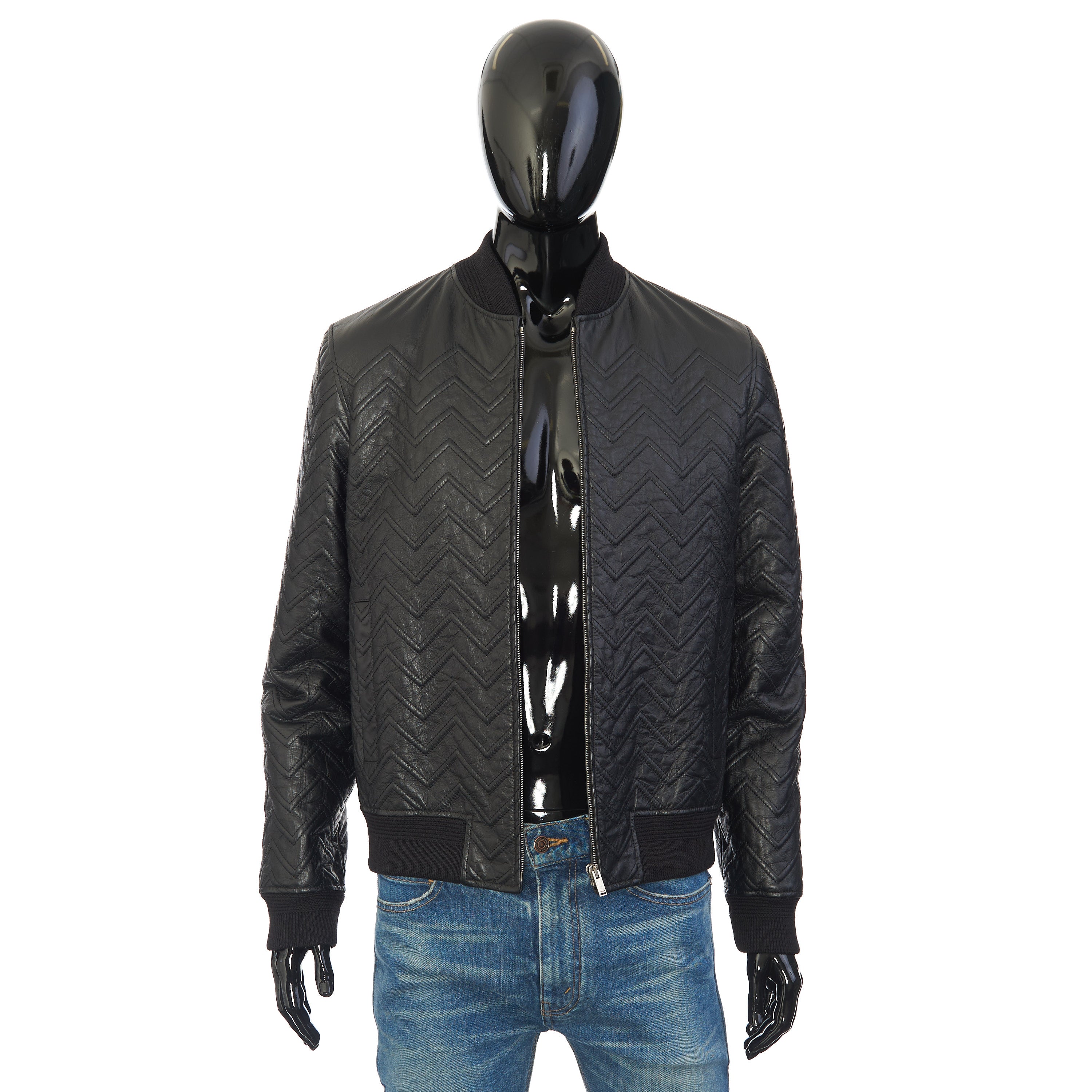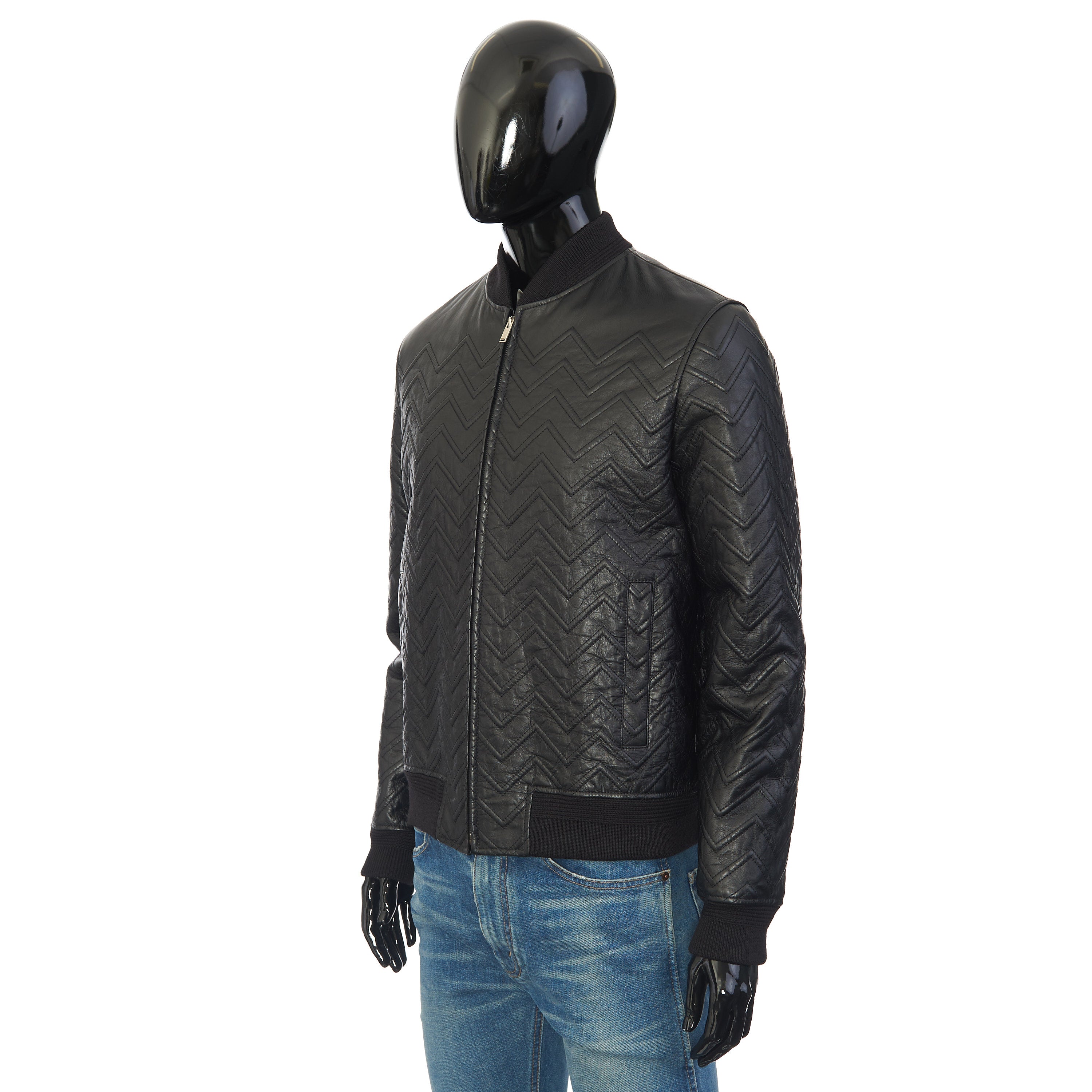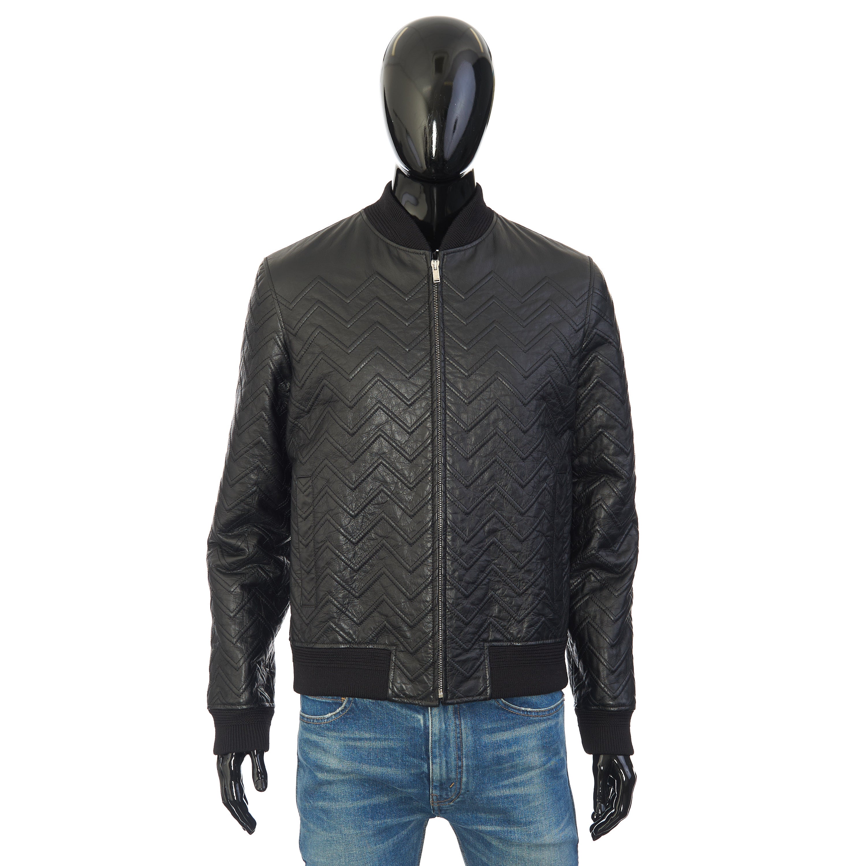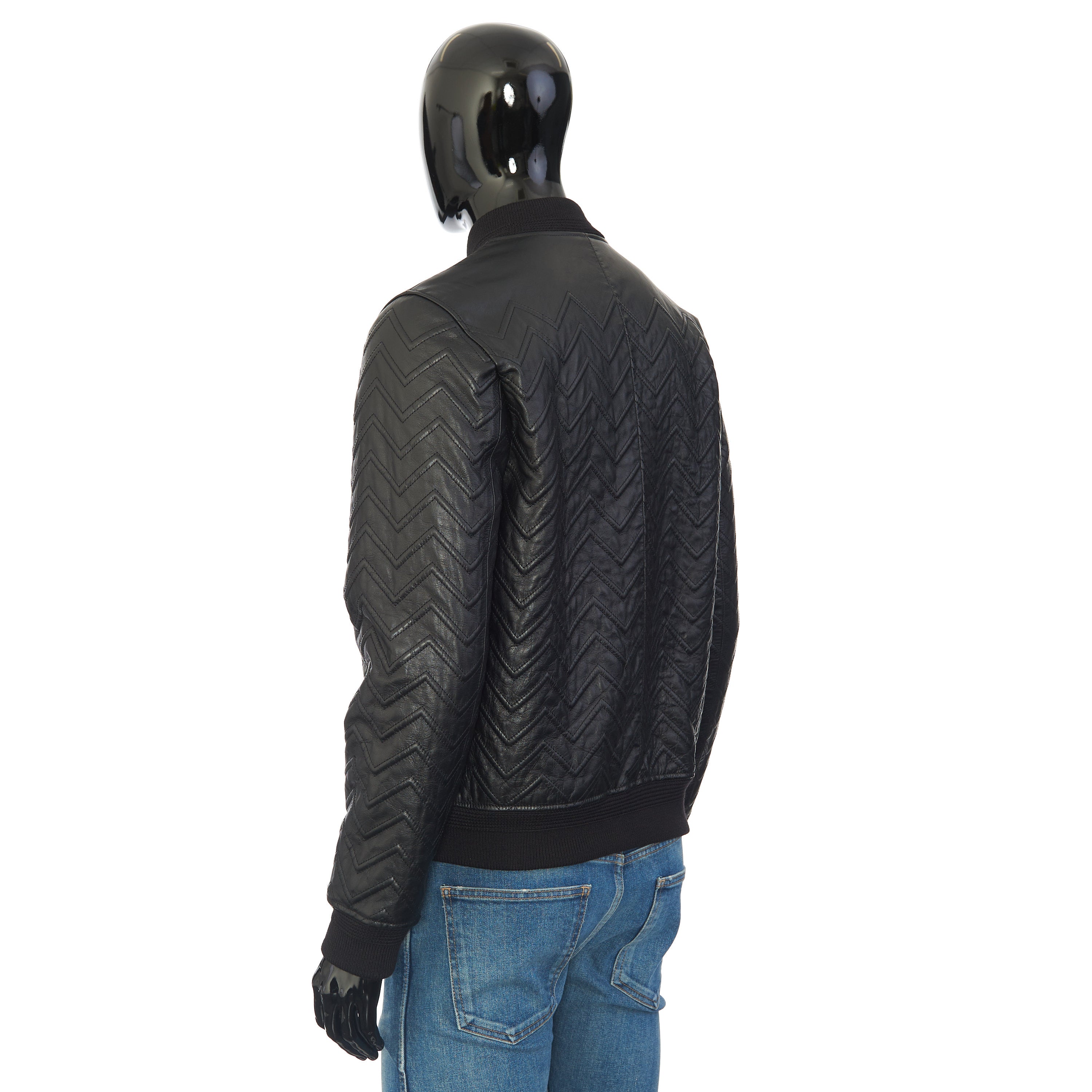 Oversized bomber jacket made with metal-free tanned leather with a zip front closure, decorated in an all-over chevron motif and featuring rib-knit collar, cuffs and waistband.