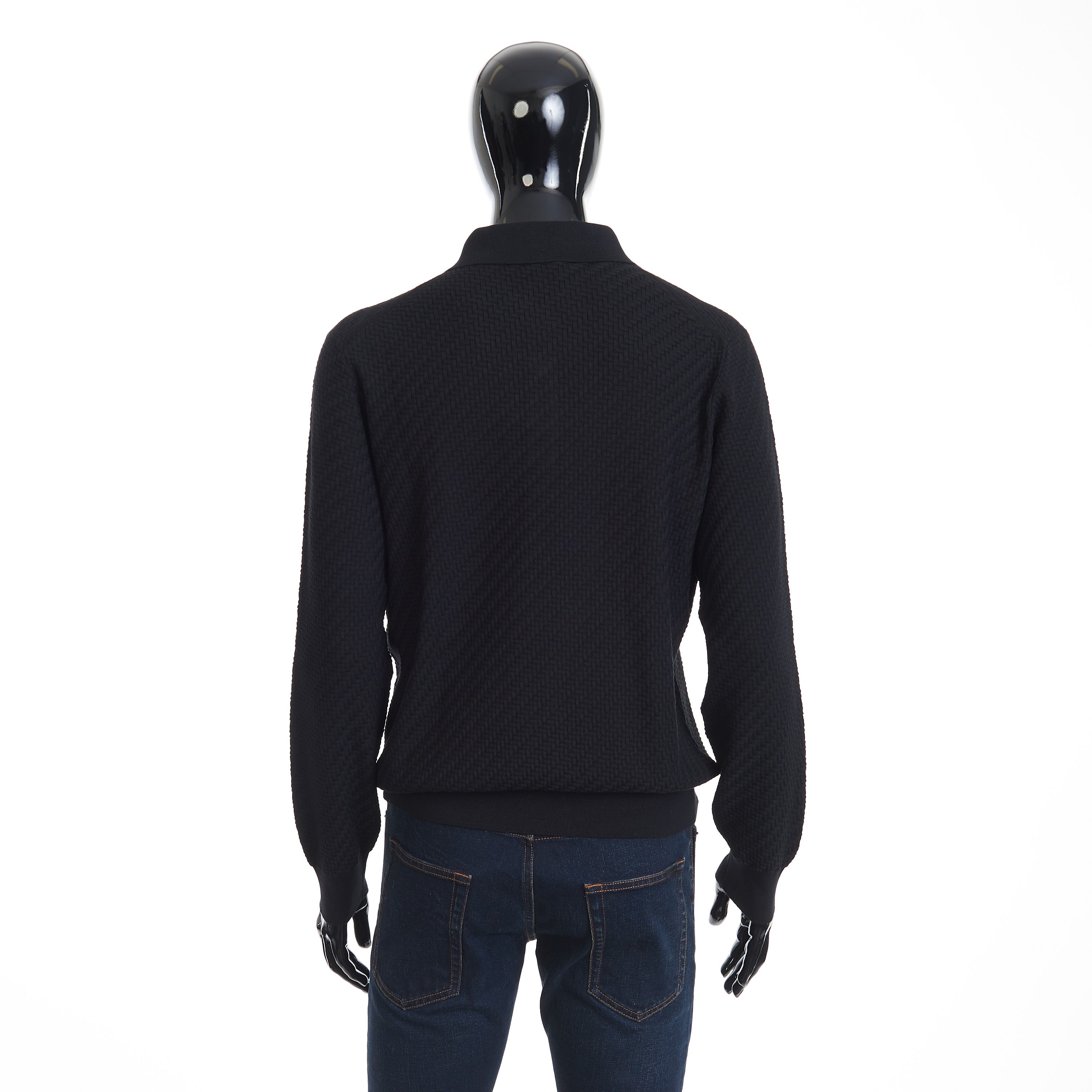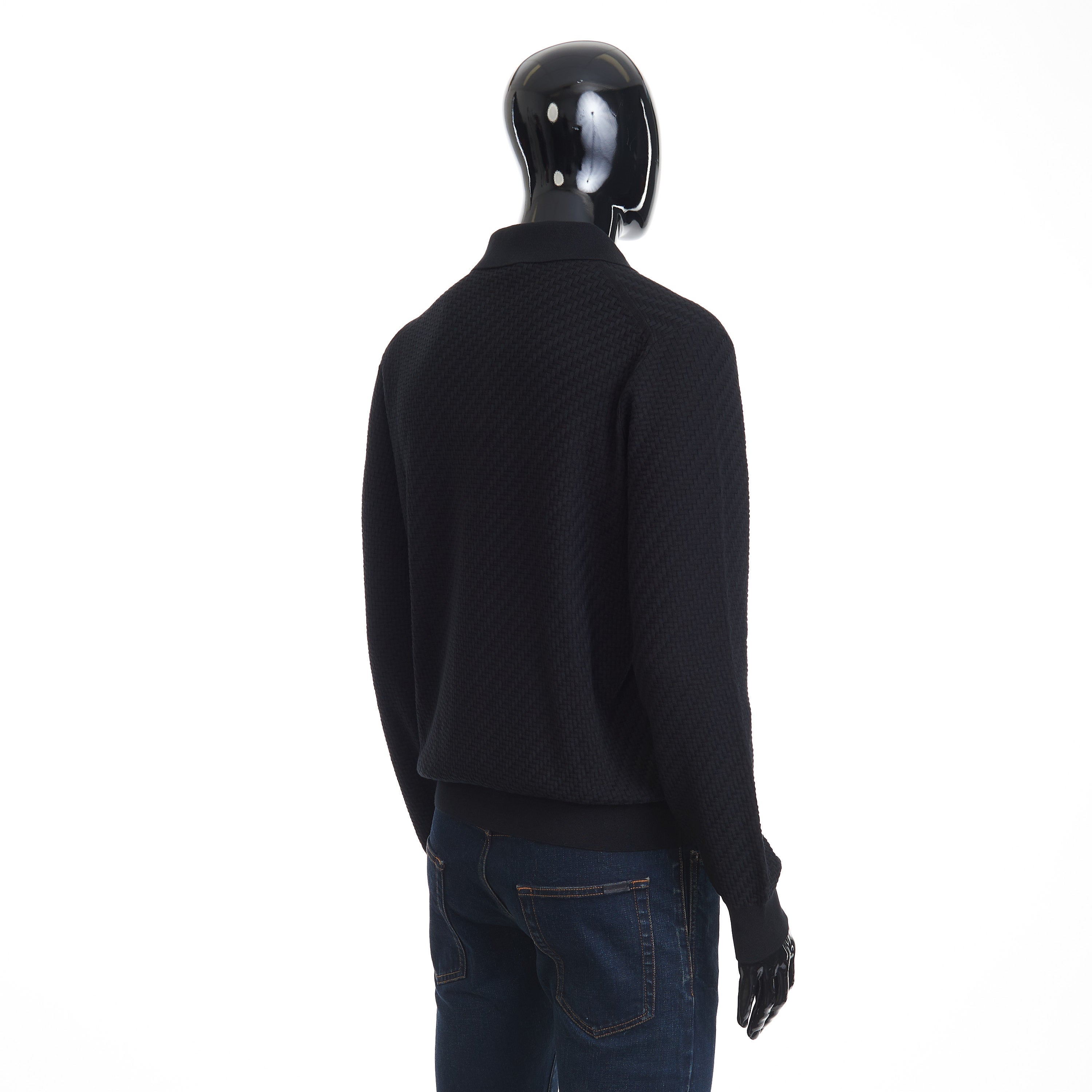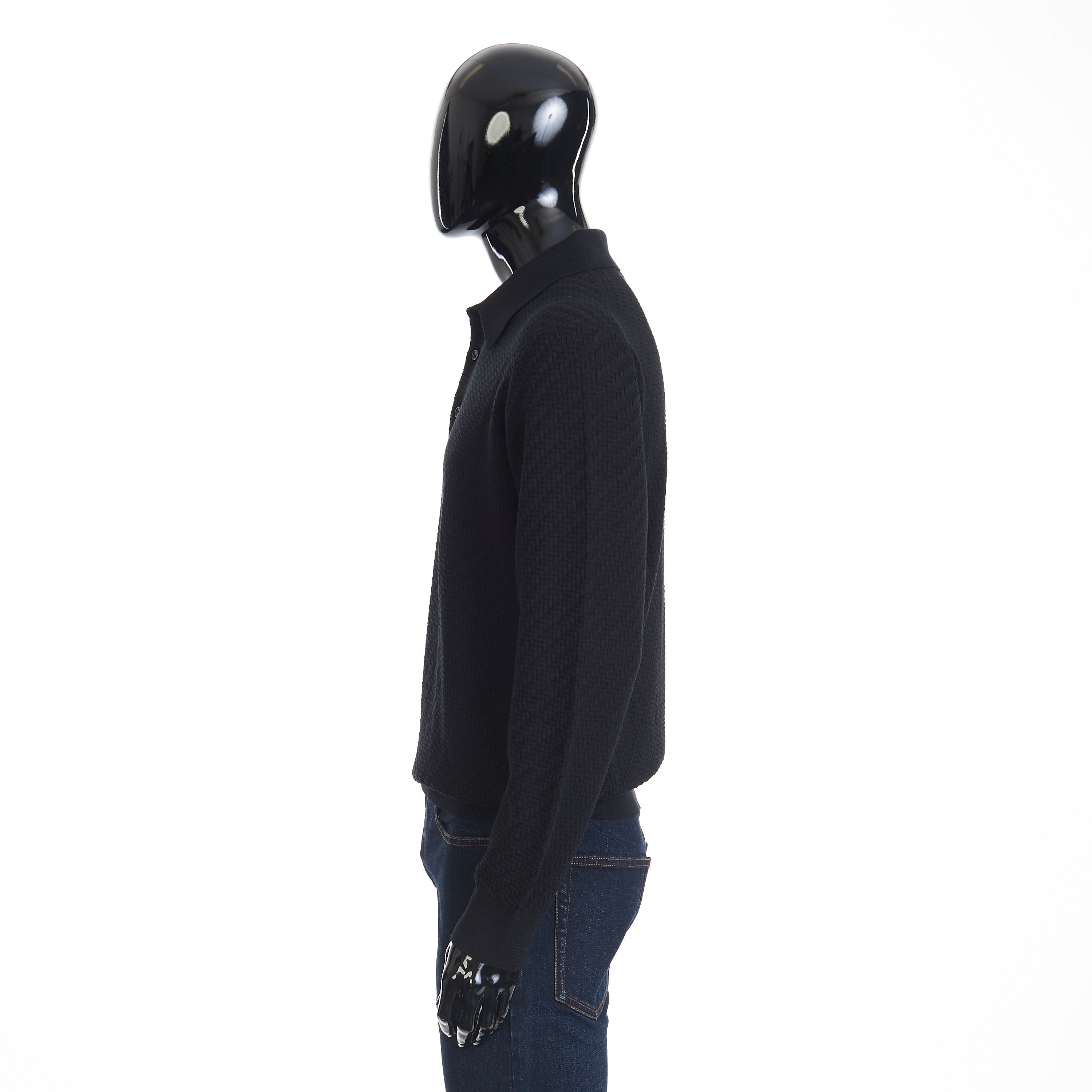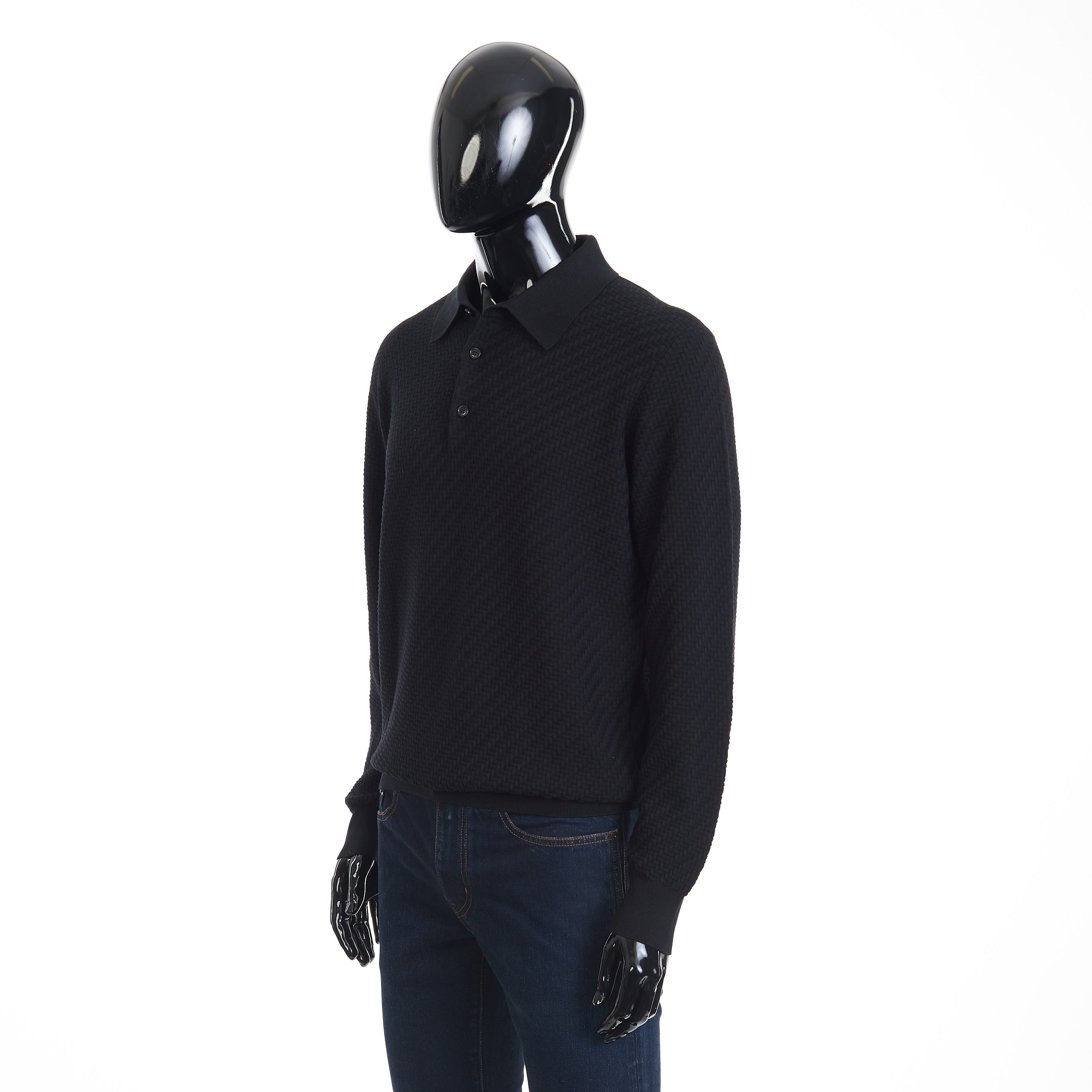 Black long-sleeved polo sweater in cotton, silk and cashmere with three mother of pearl buttons. Its comfortable fit and soft knit make it perfect for year-round use. It matches perfectly with formal and semi-formal attire. The trama weave features tone-o