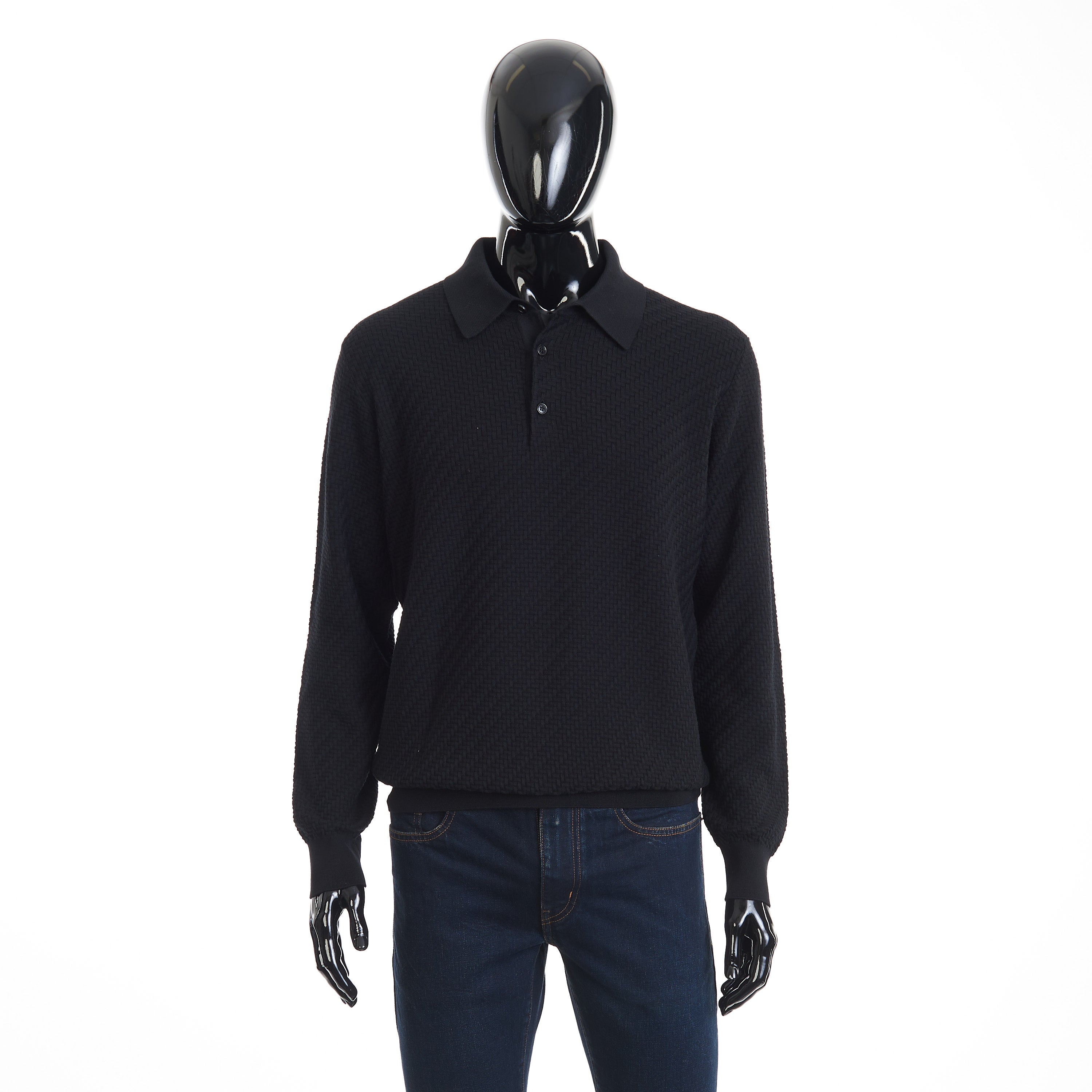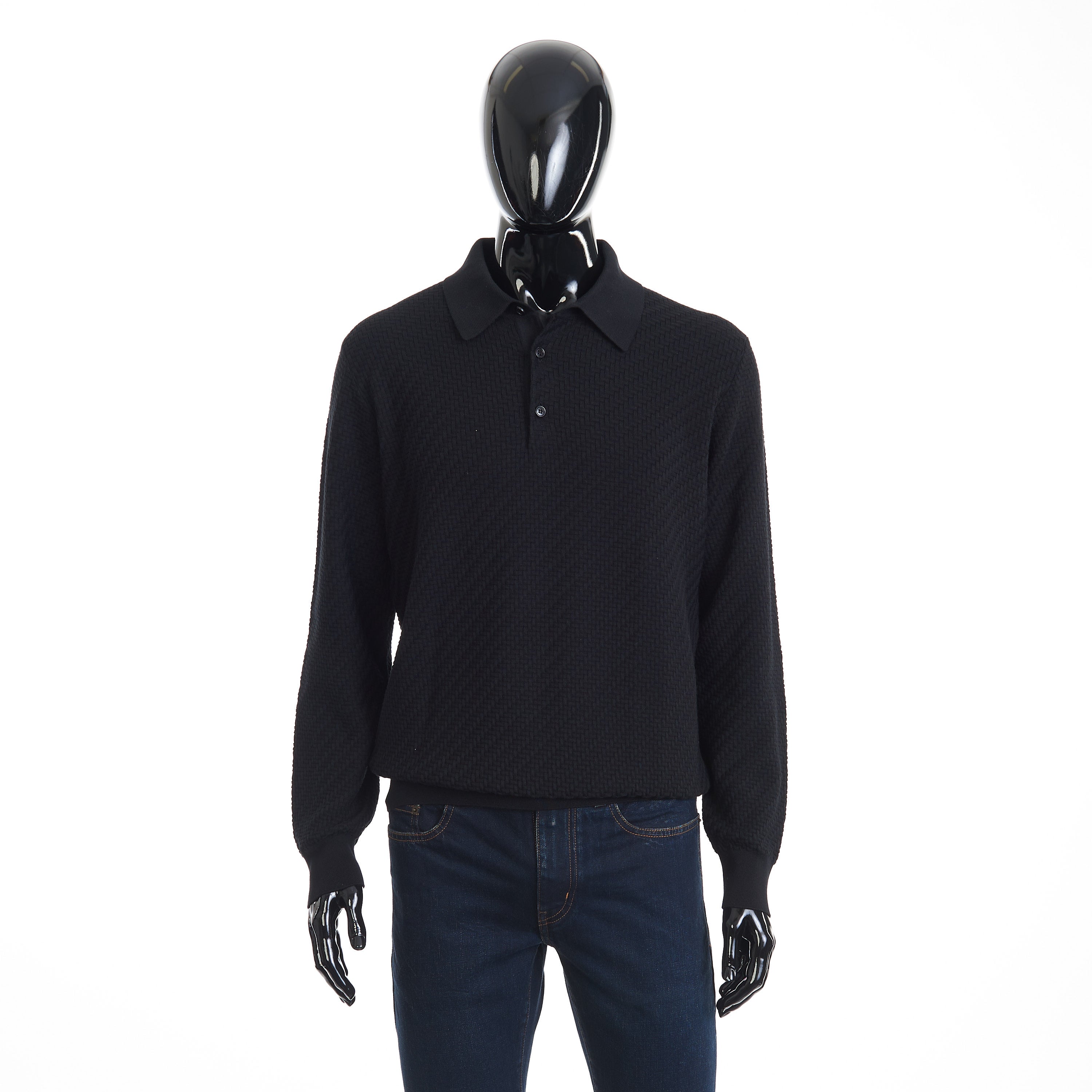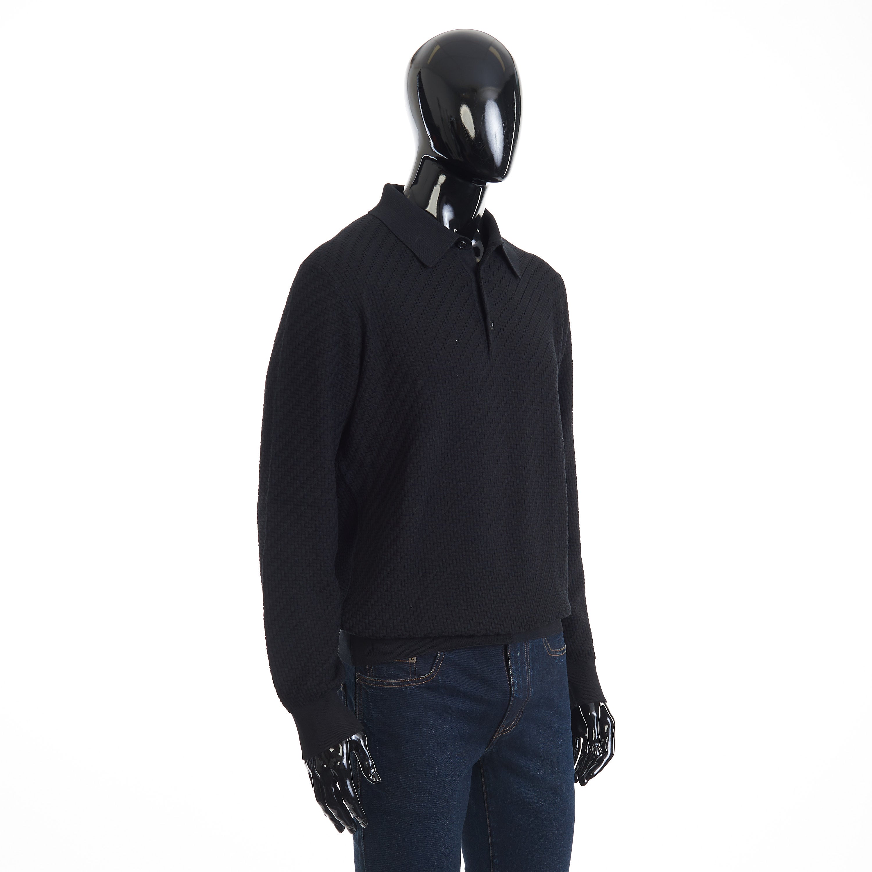 Black long-sleeved polo sweater in cotton, silk and cashmere with three mother of pearl buttons. Its comfortable fit and soft knit make it perfect for year-round use. It matches perfectly with formal and semi-formal attire. The trama weave features tone-o