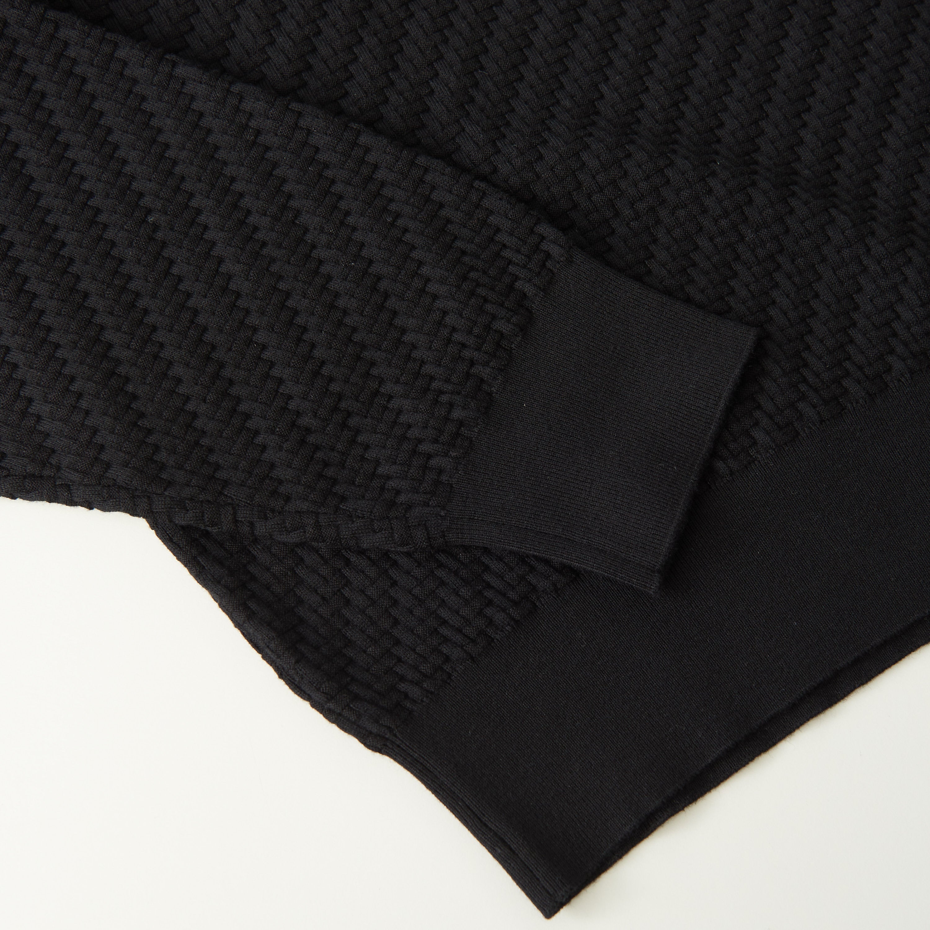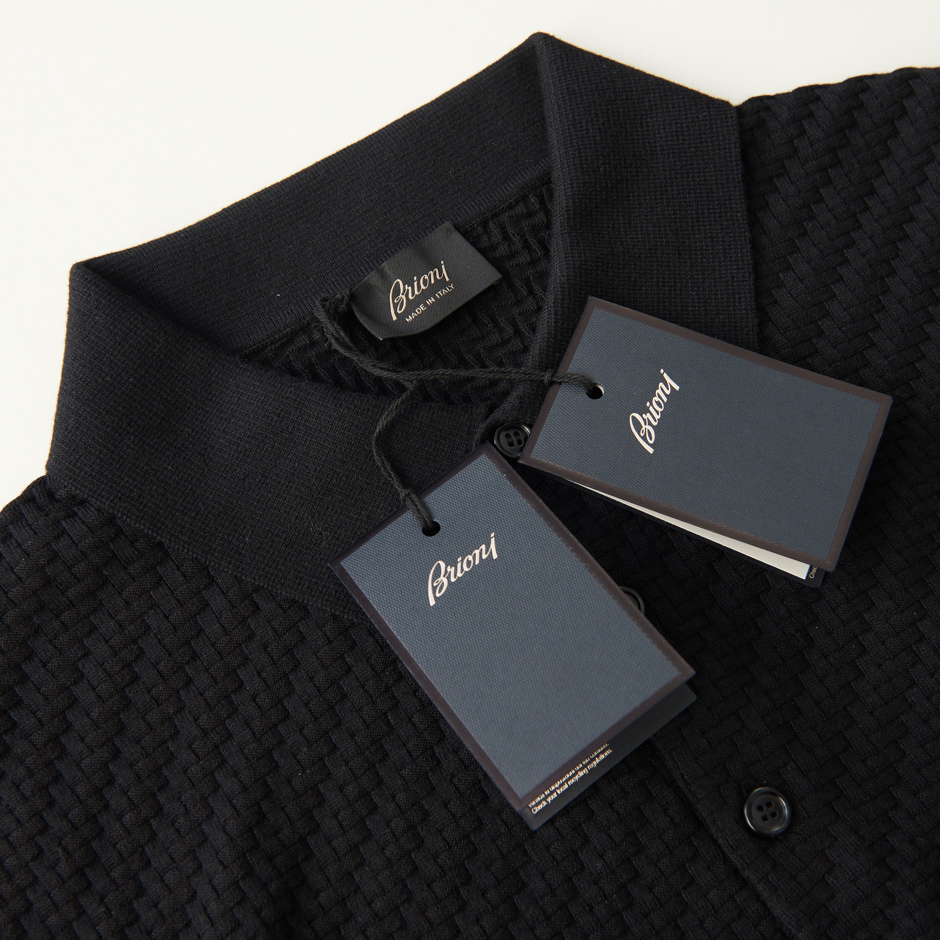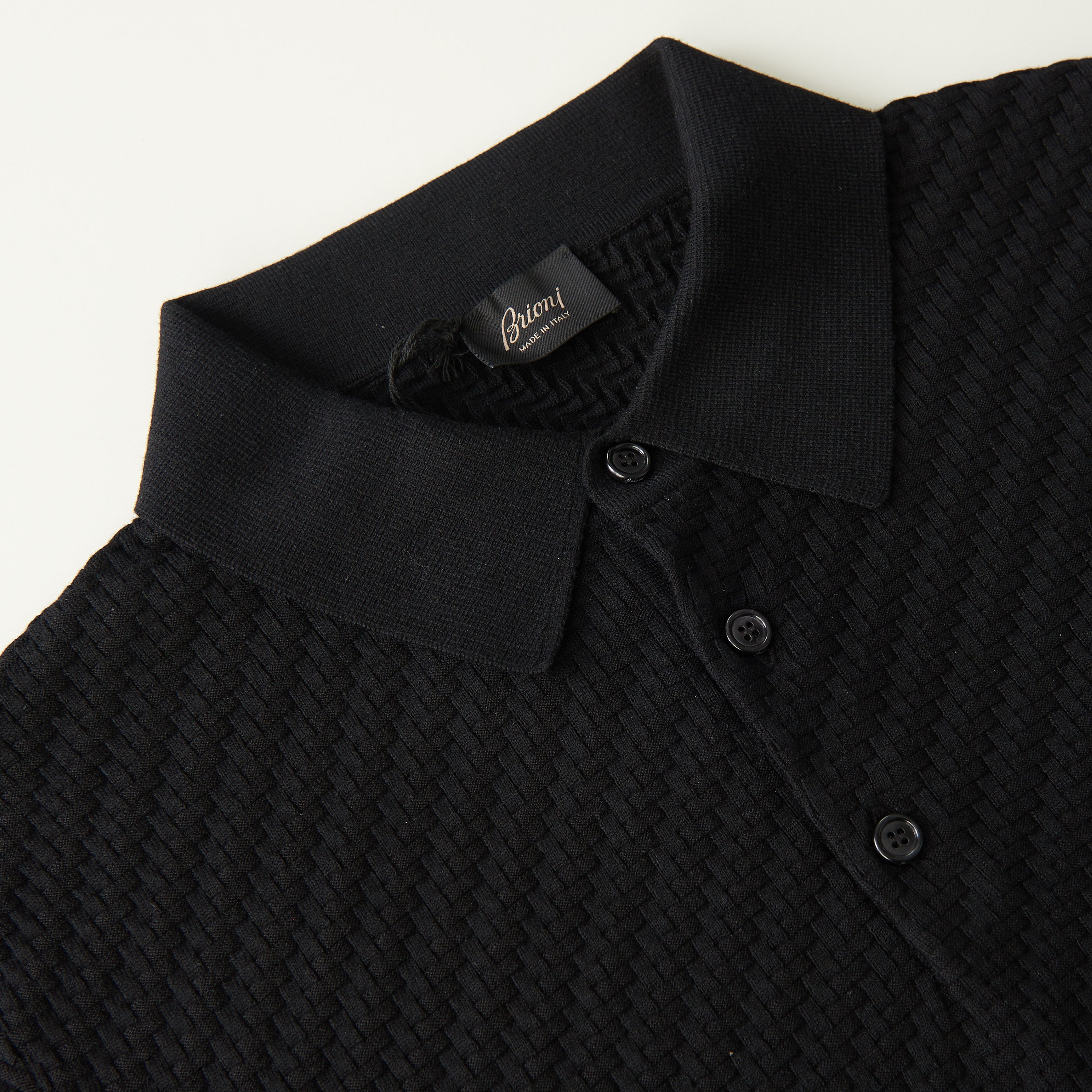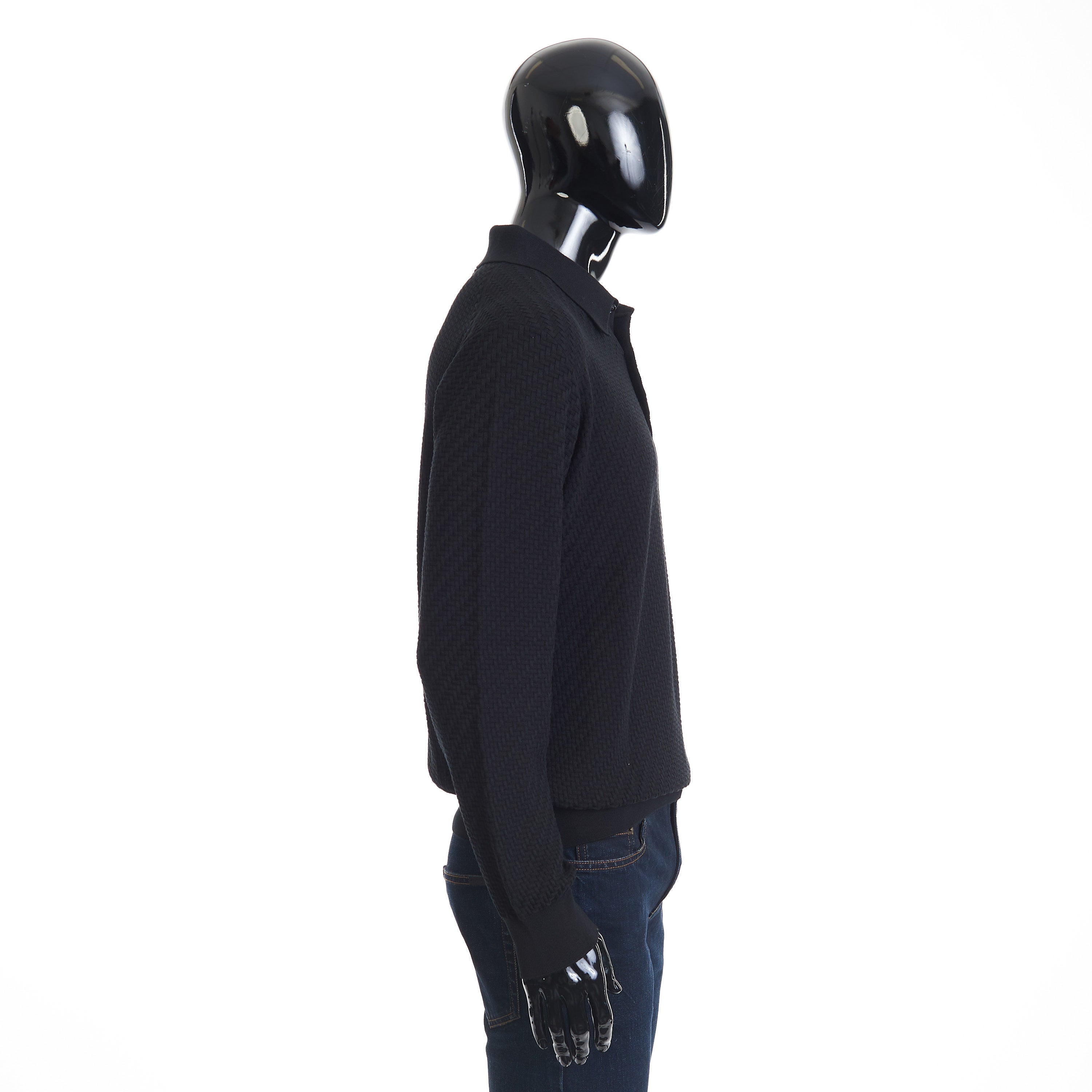 Black long-sleeved polo sweater in cotton, silk and cashmere with three mother of pearl buttons. Its comfortable fit and soft knit make it perfect for year-round use. It matches perfectly with formal and semi-formal attire. The trama weave features tone-o