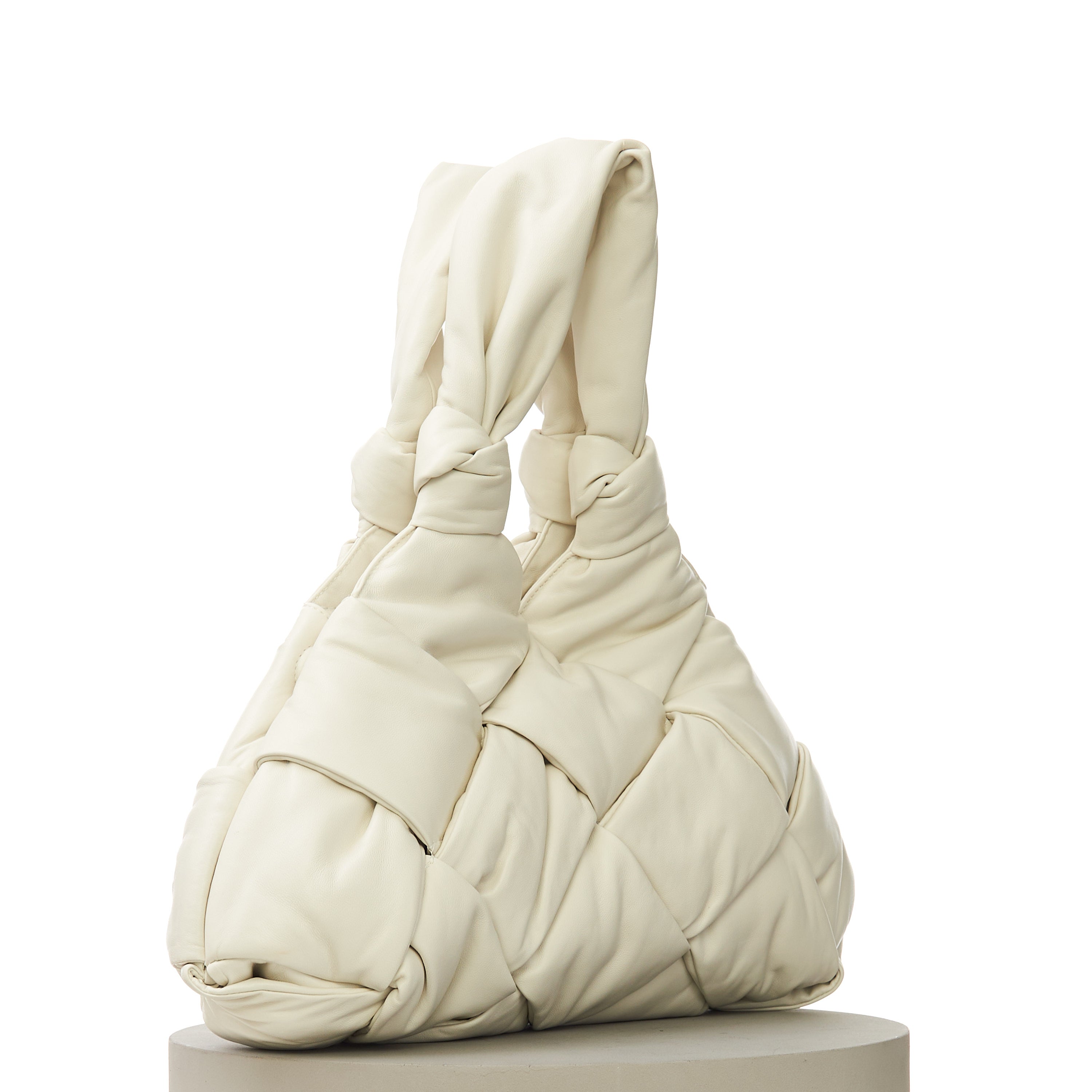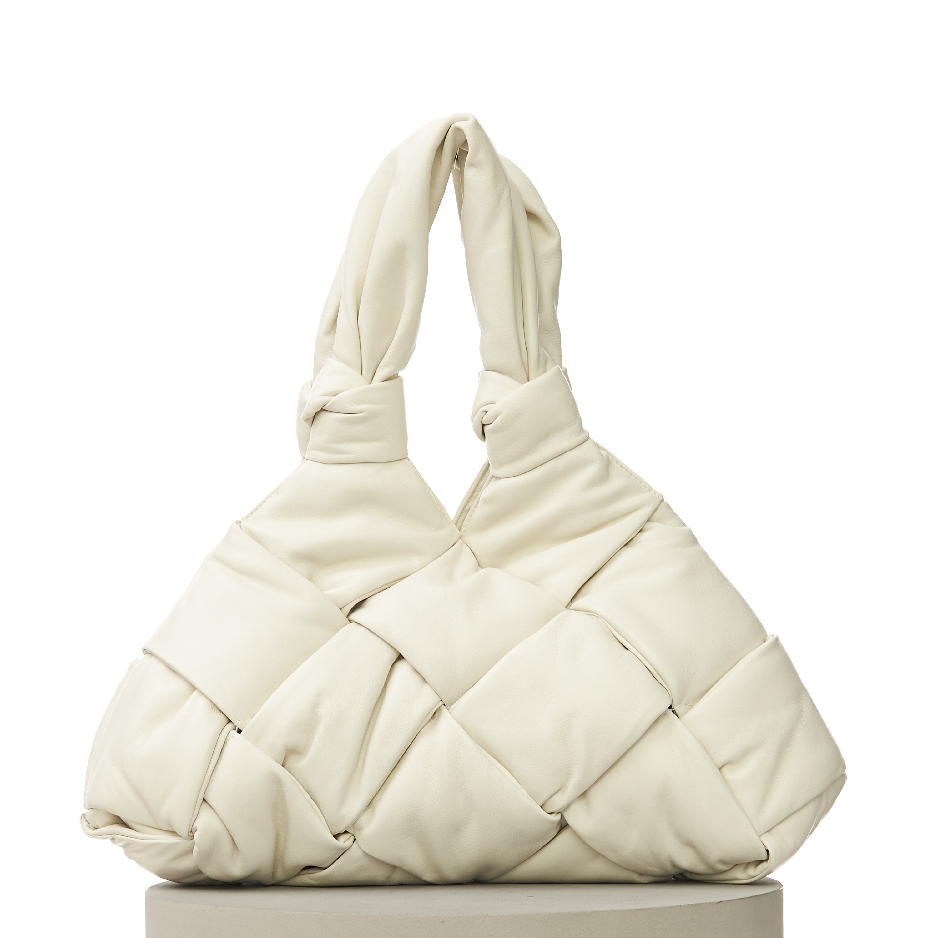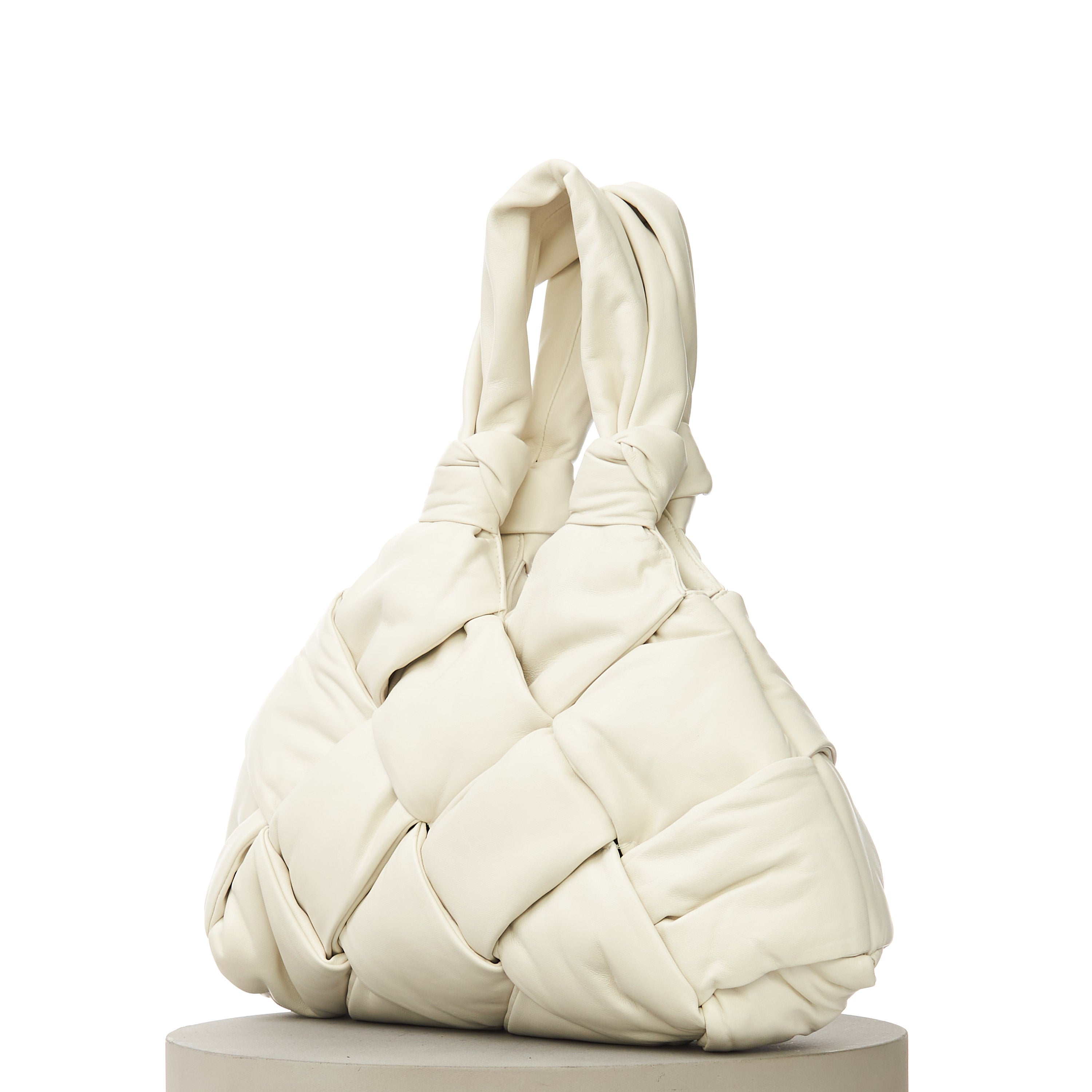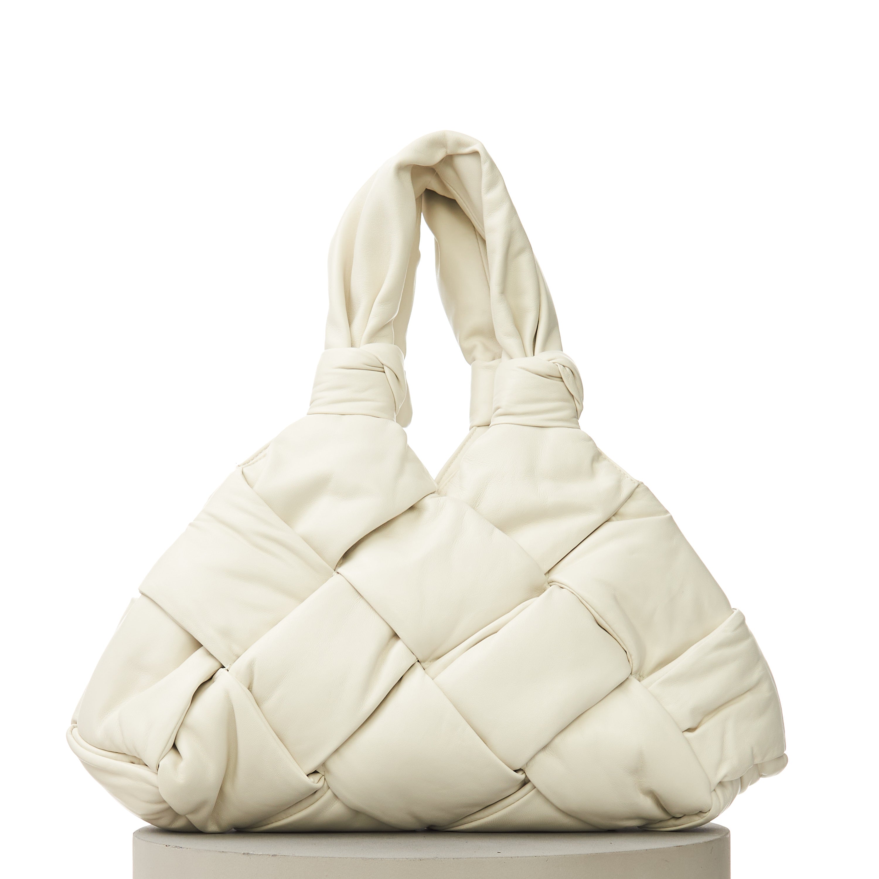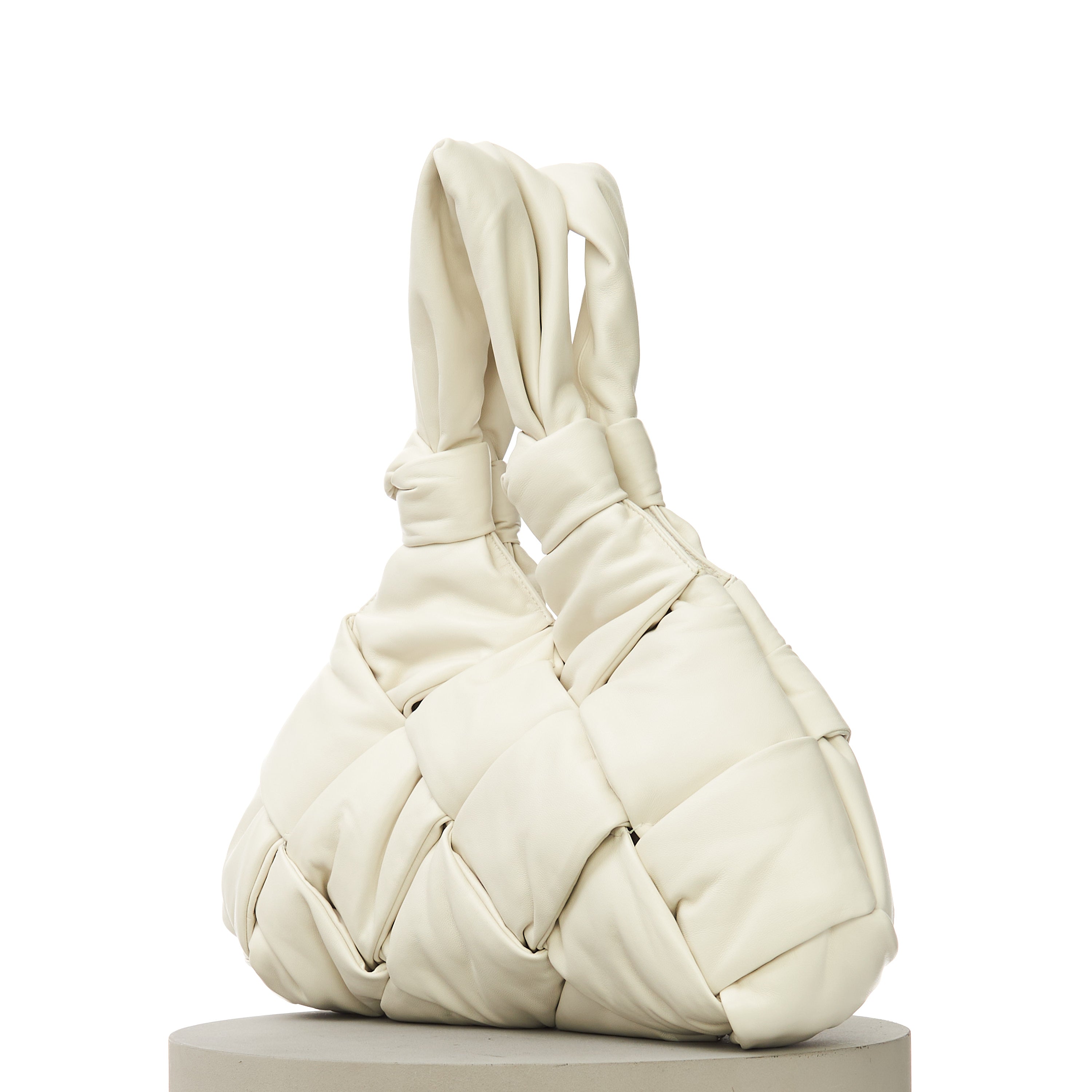 Small padded intreccio leather shoulder bagSingle compartmentMagnetic closureMade in ItalyFabric: Material: 100% lambskin; Lining: bonded lambskinMade in: ItalyModel no.: 680163-V1F20-9000