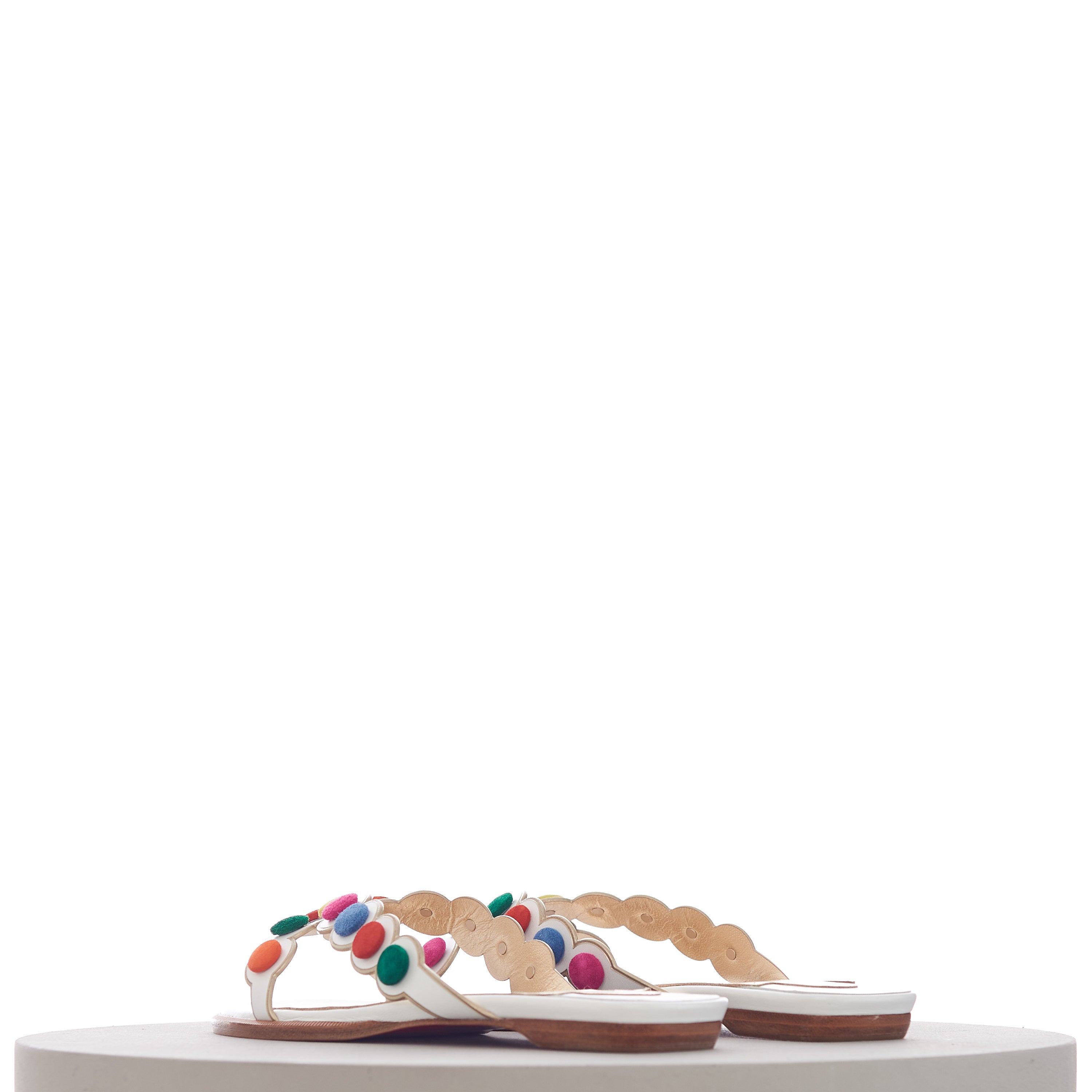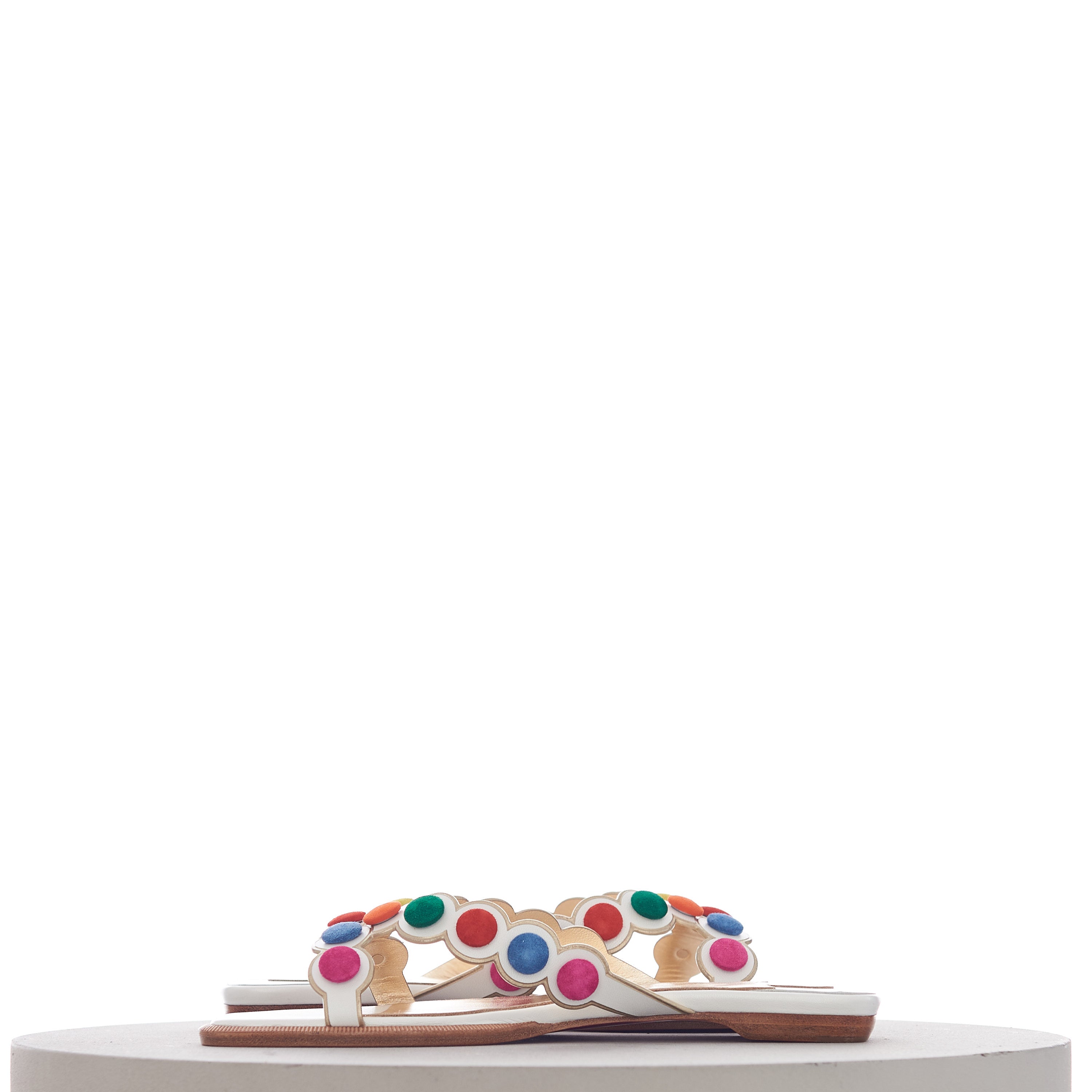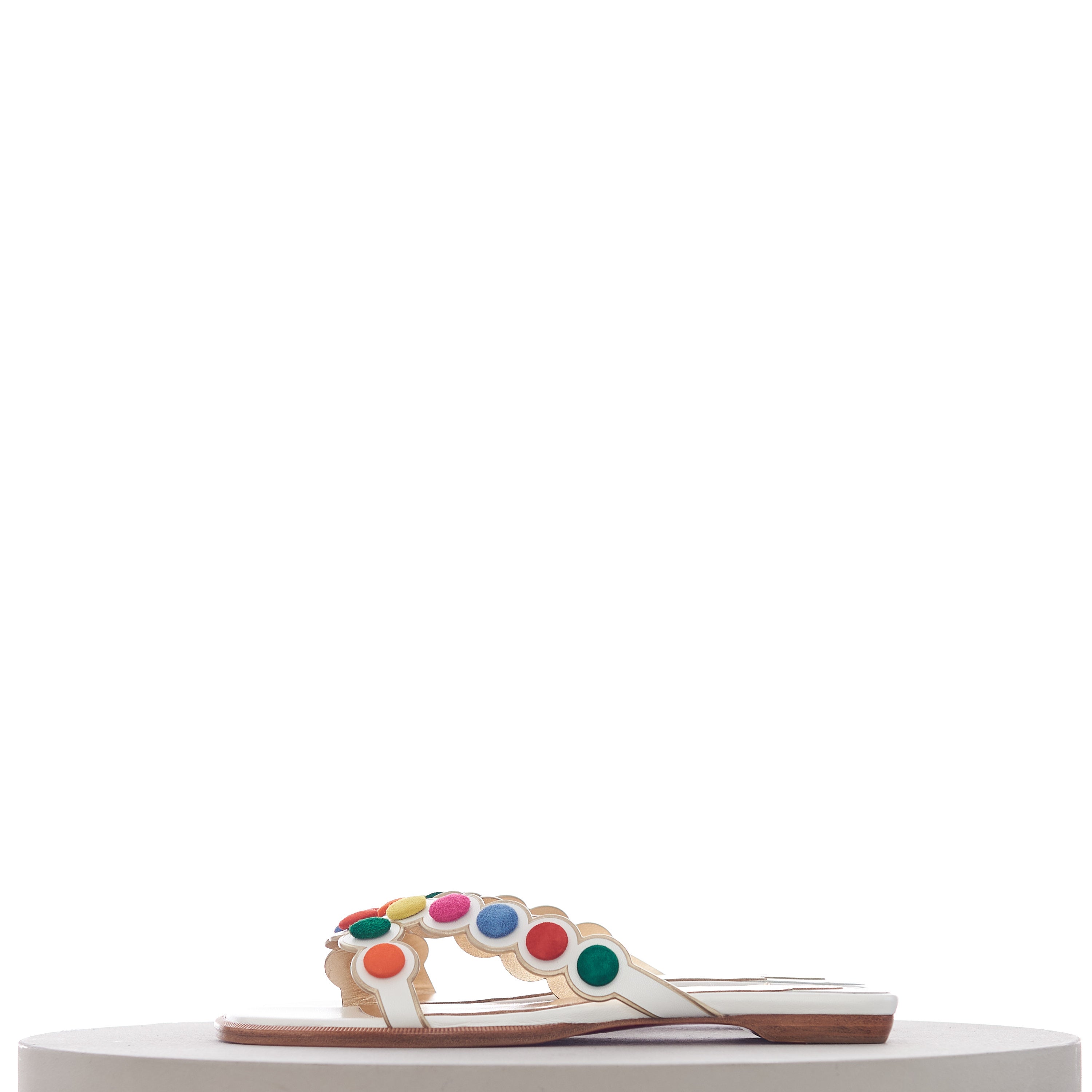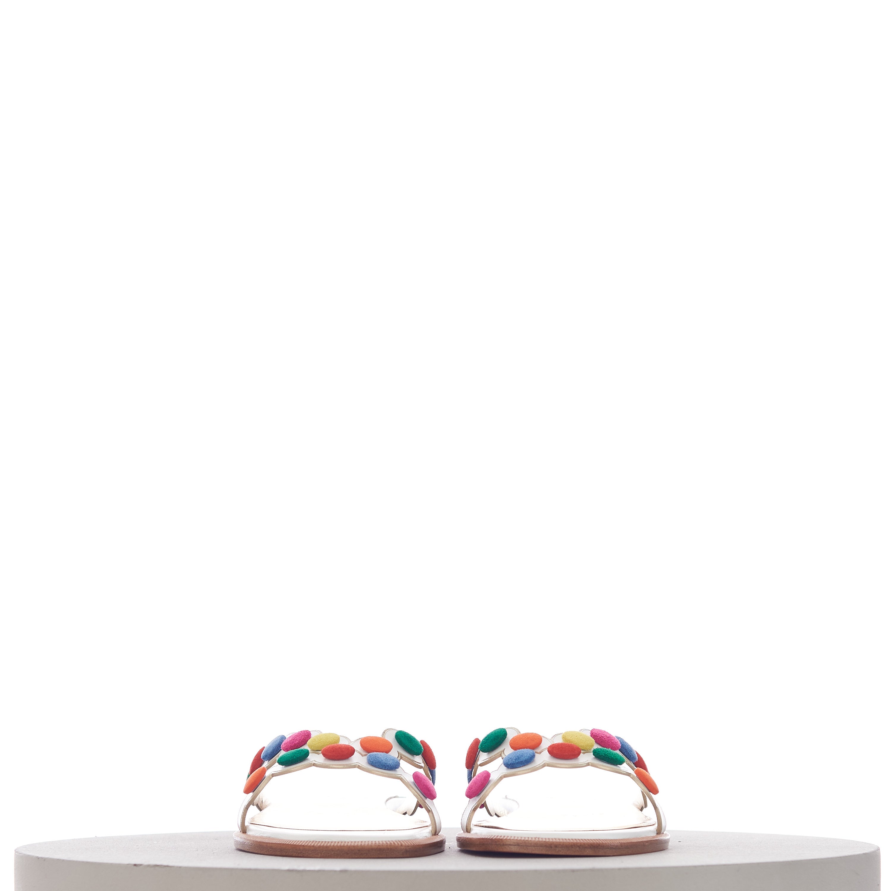 Minimalist leather slides topped with circular embellishment in a vibrant multicolor suede finish. Leather upper Open toe Slip-on style Leather sole Made in Italy