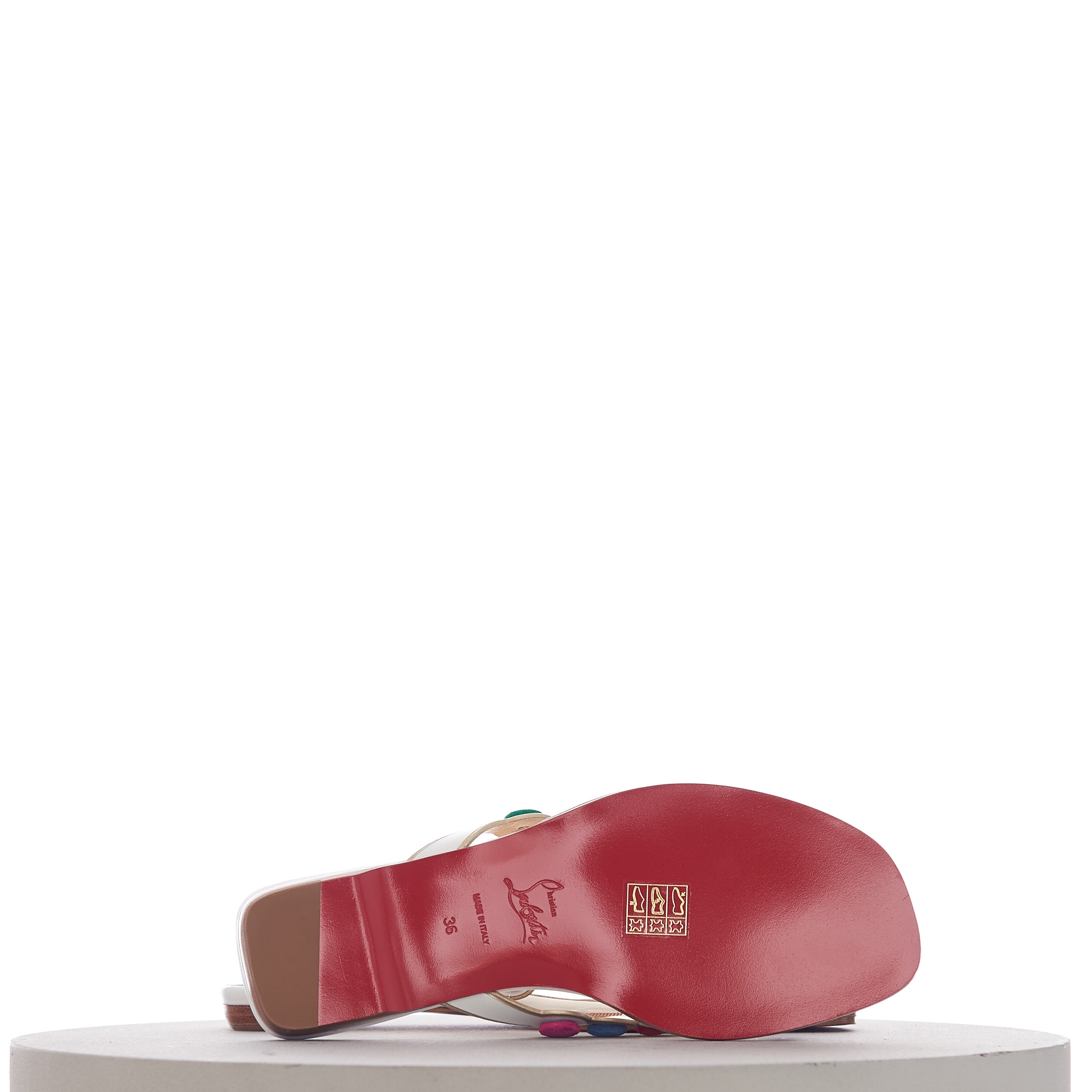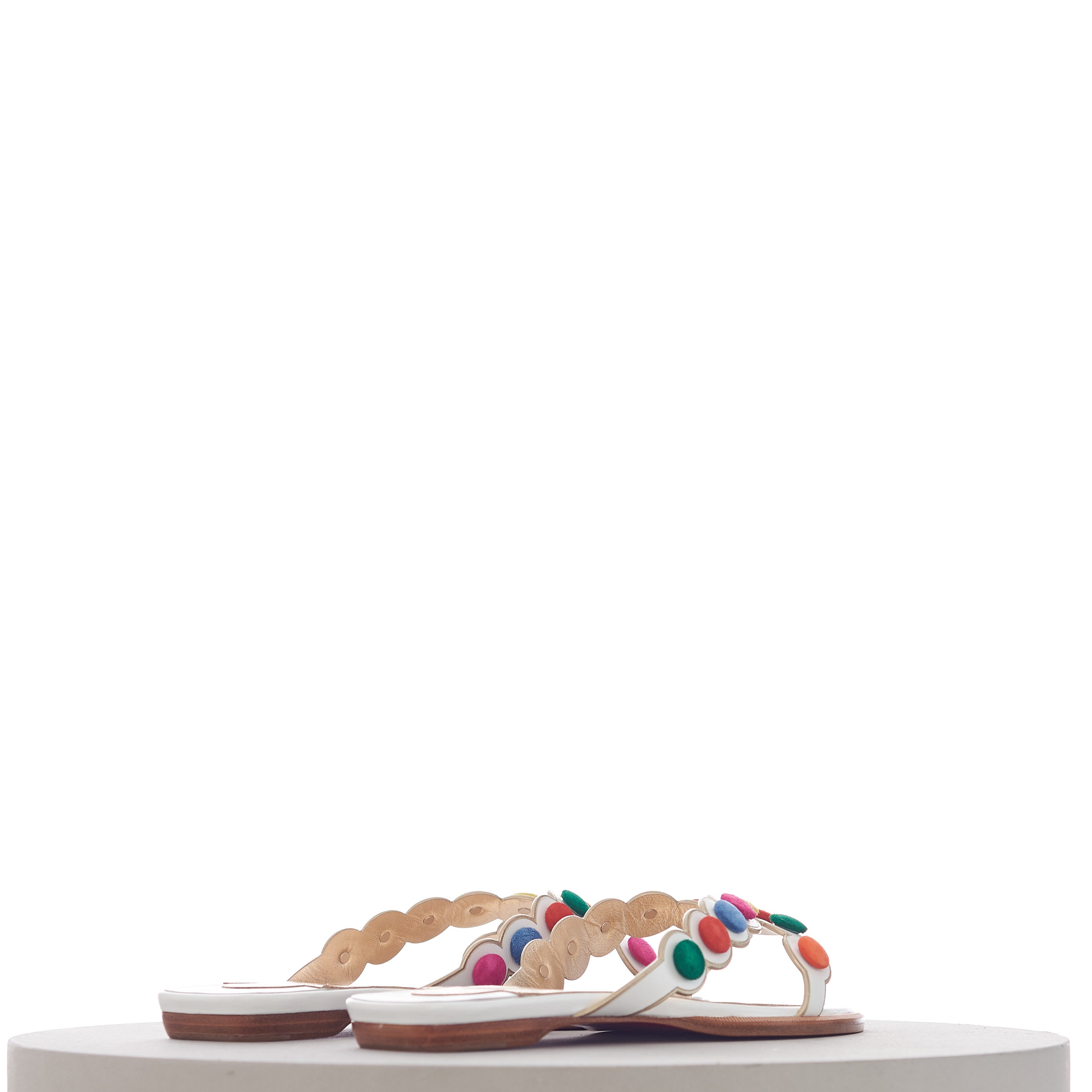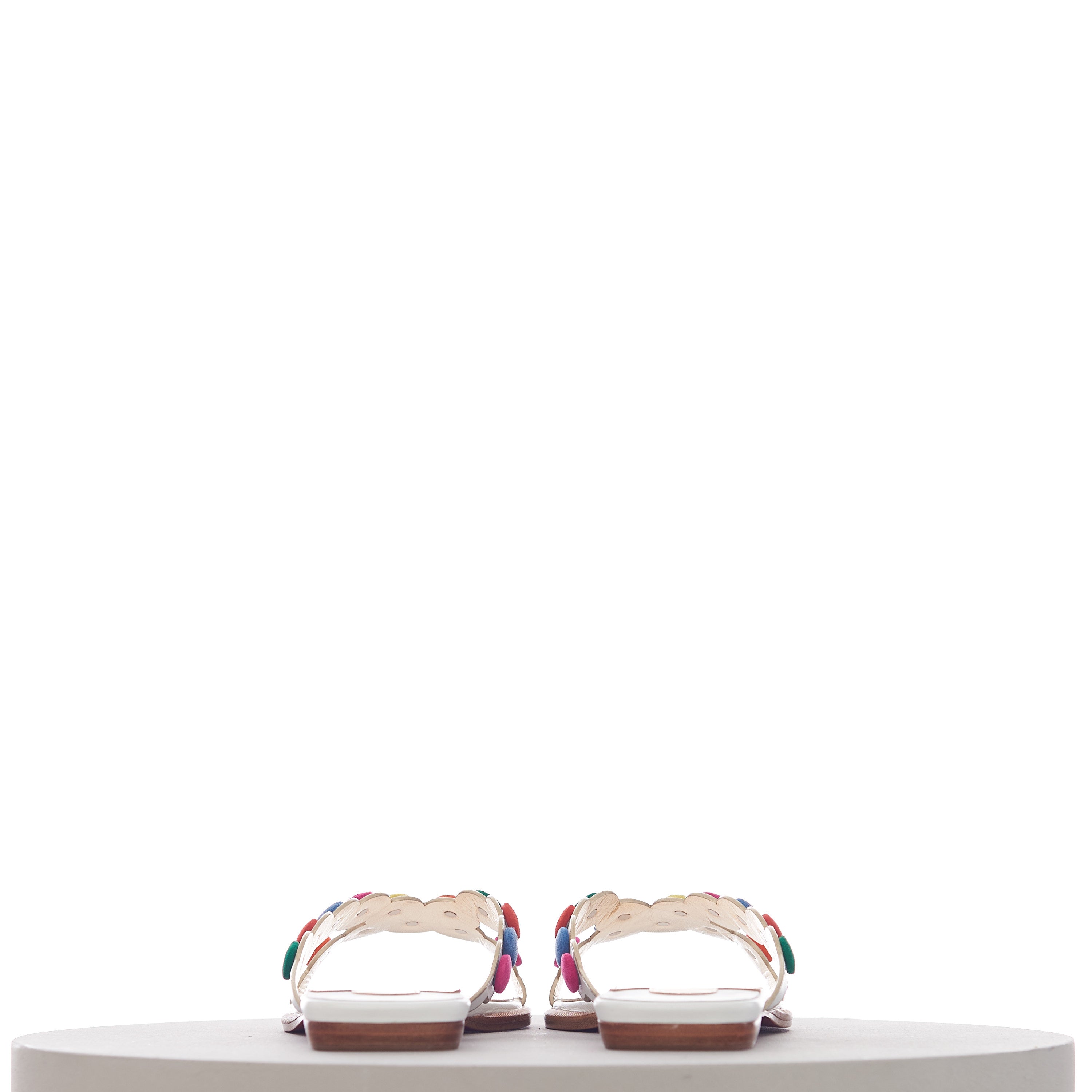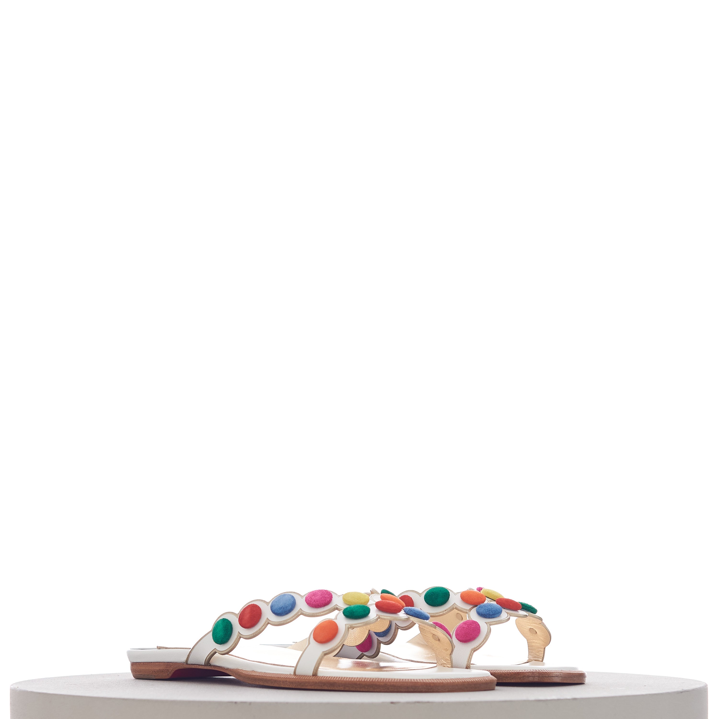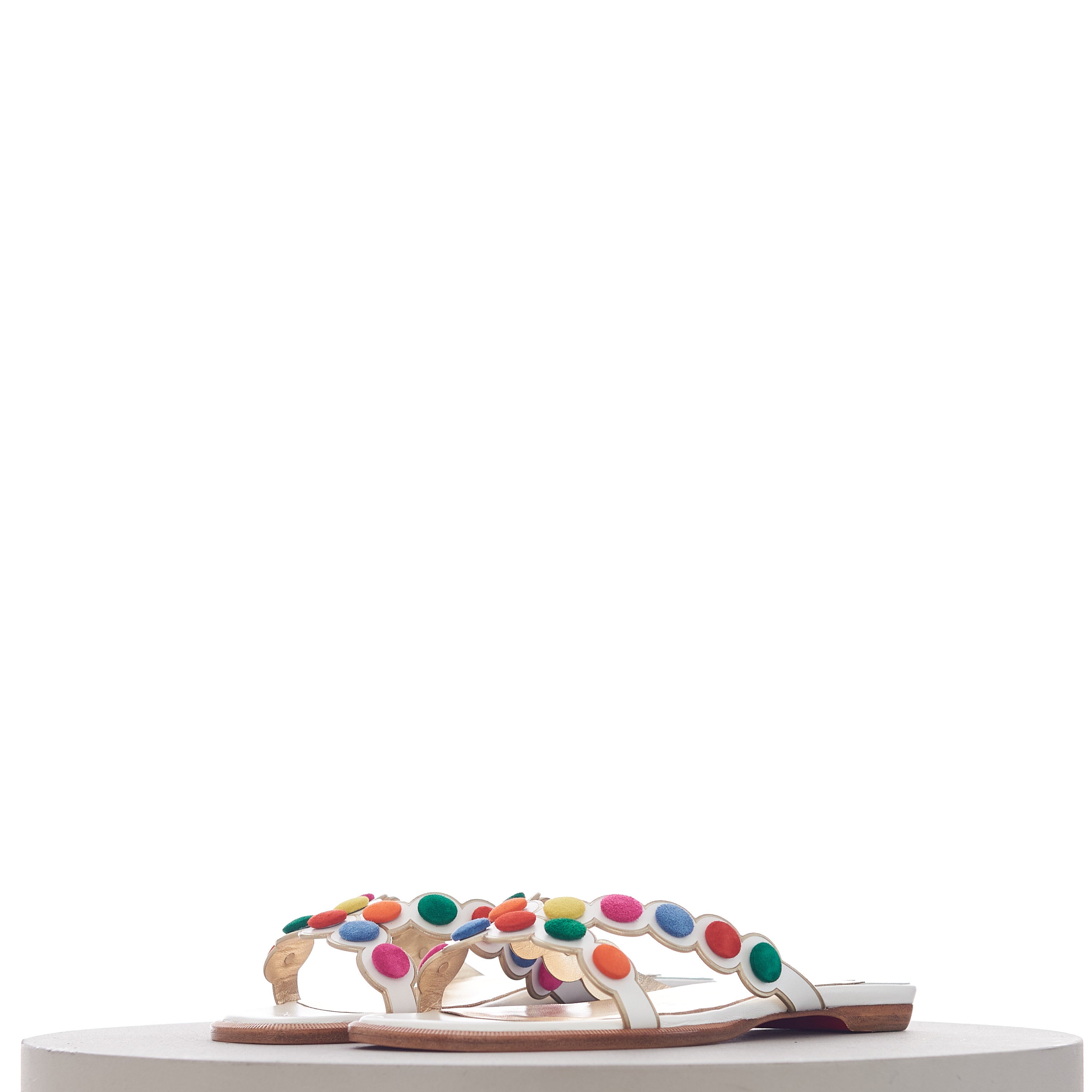 Minimalist leather slides topped with circular embellishment in a vibrant multicolor suede finish. Leather upper Open toe Slip-on style Leather sole Made in Italy