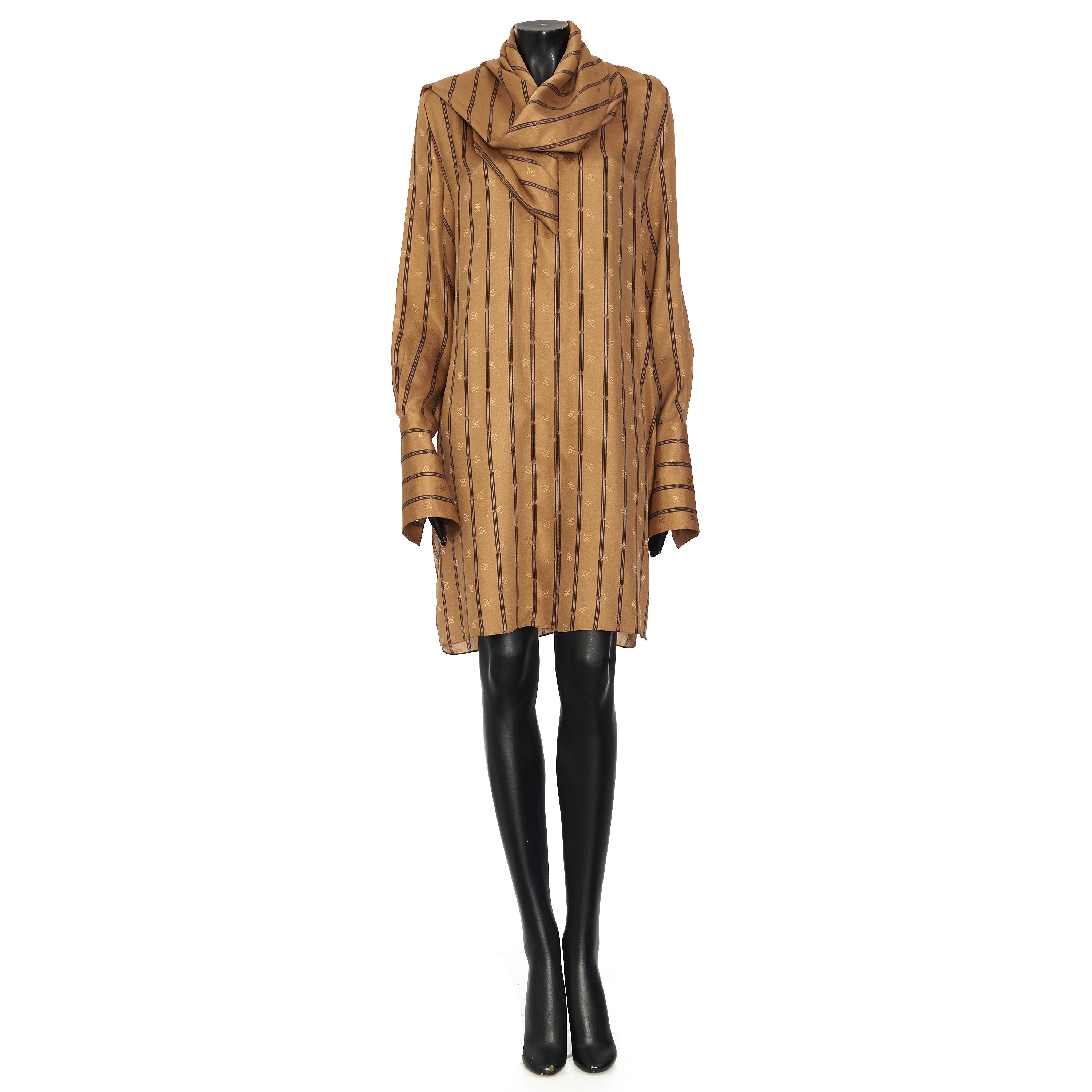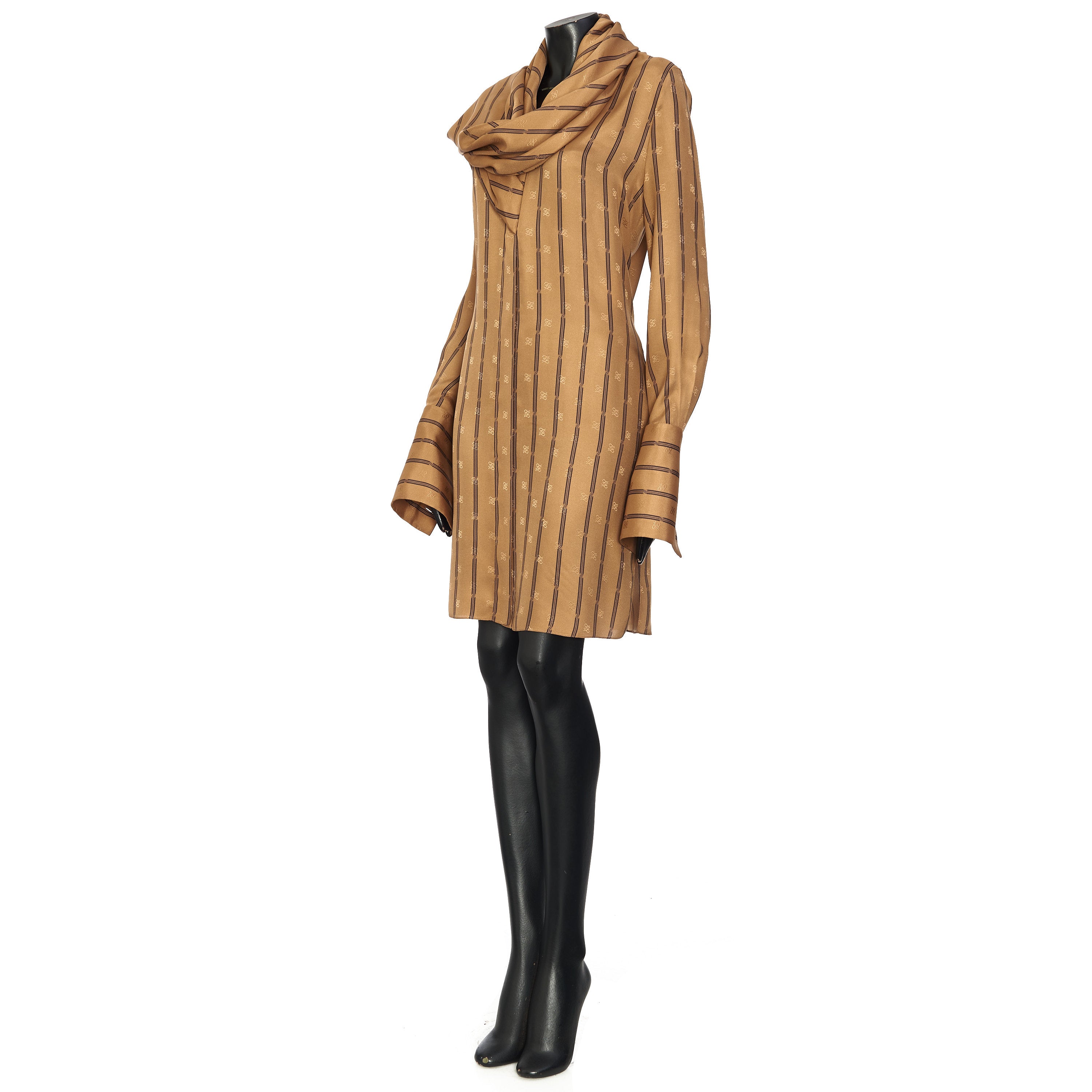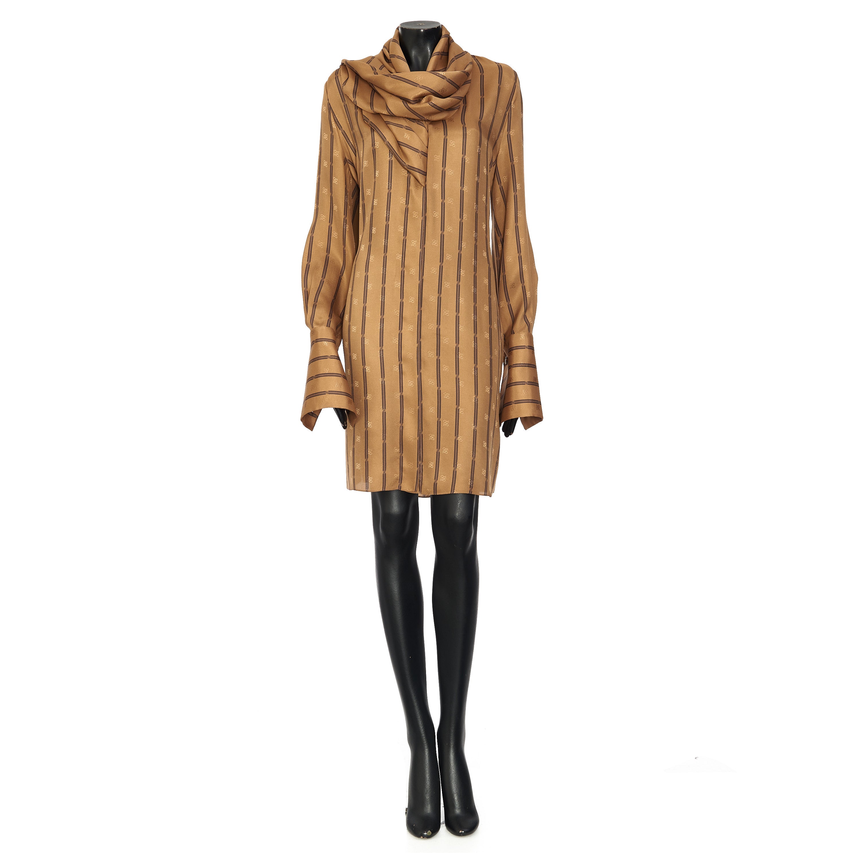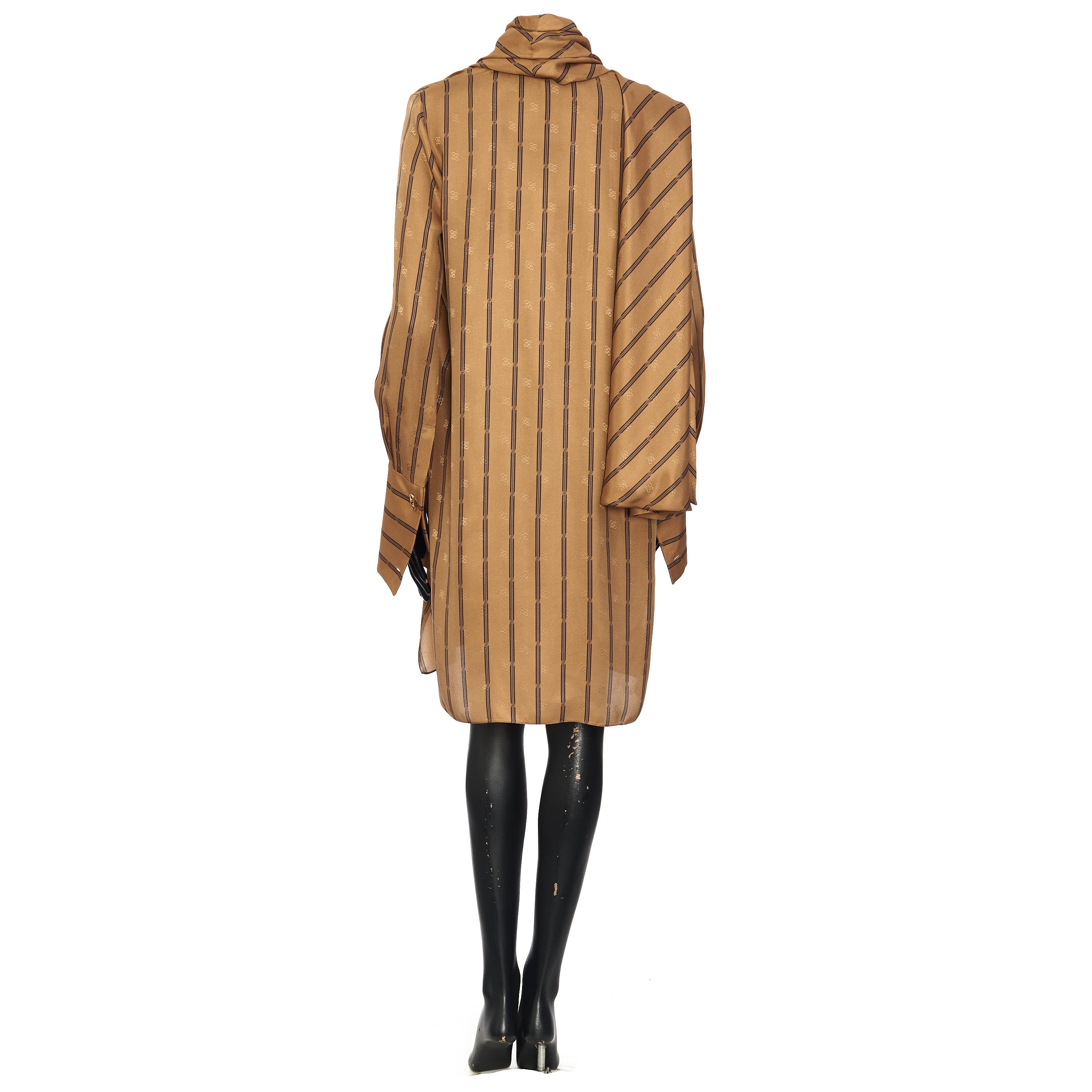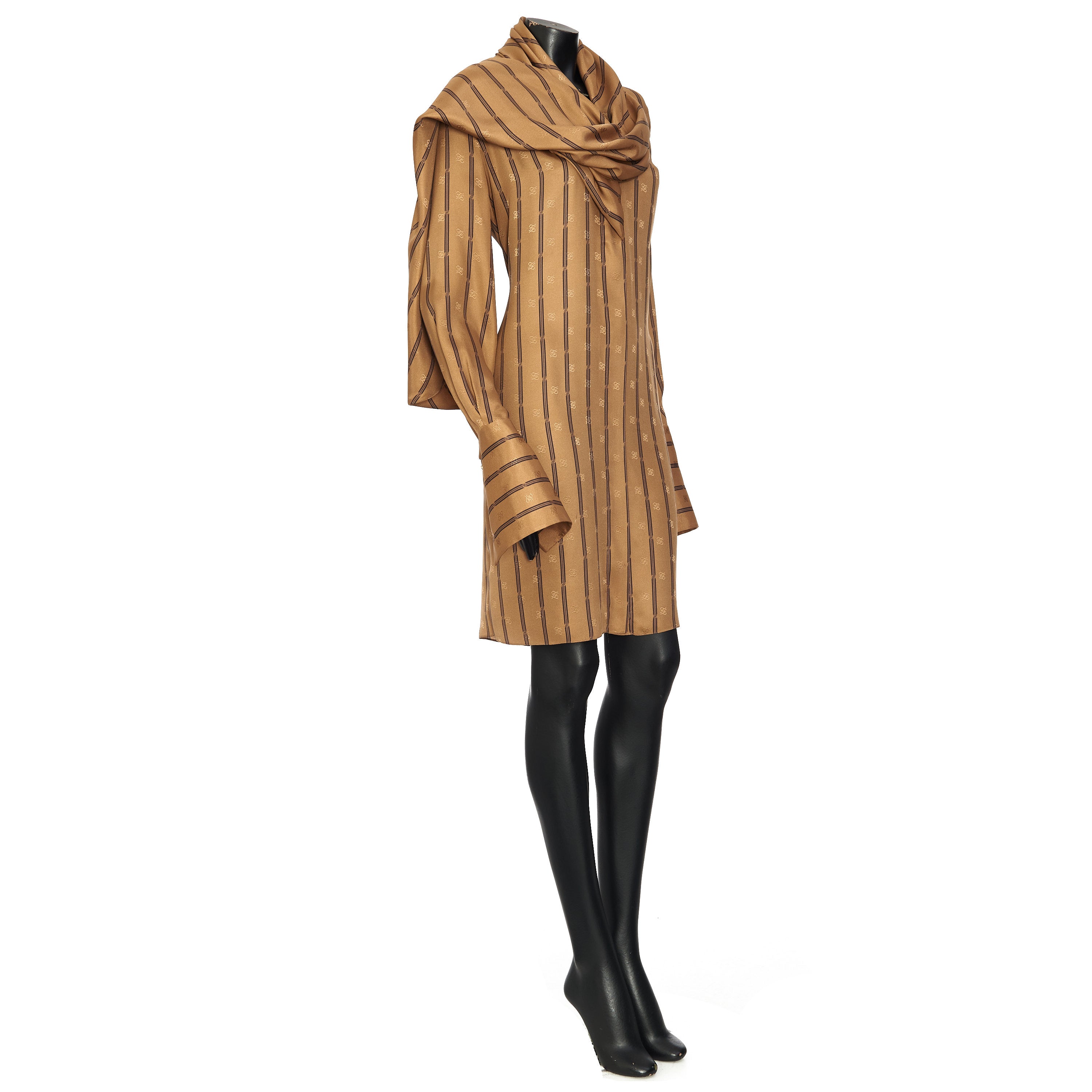 Short dress with V neck and long foulard. Made of light brown satin crêpe.