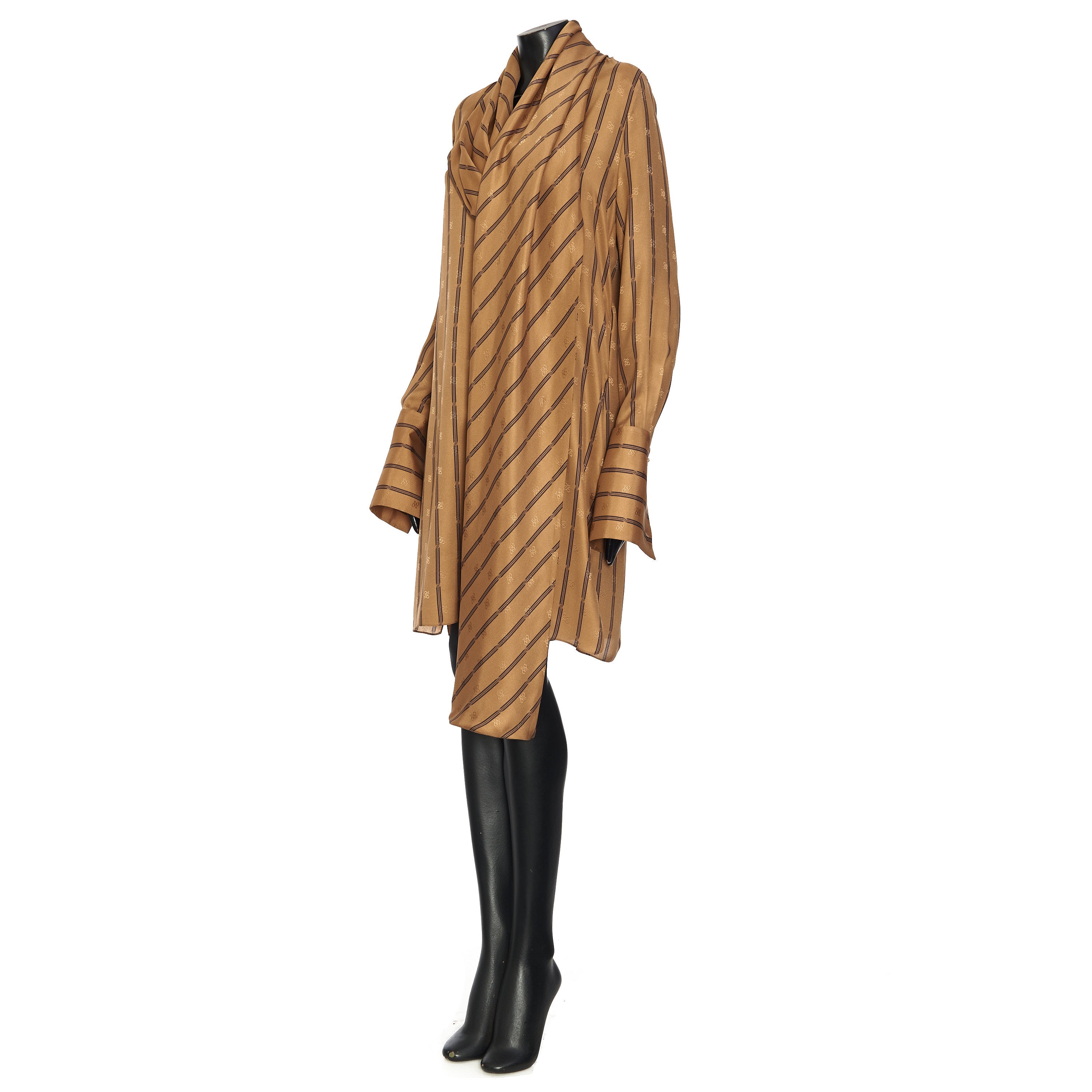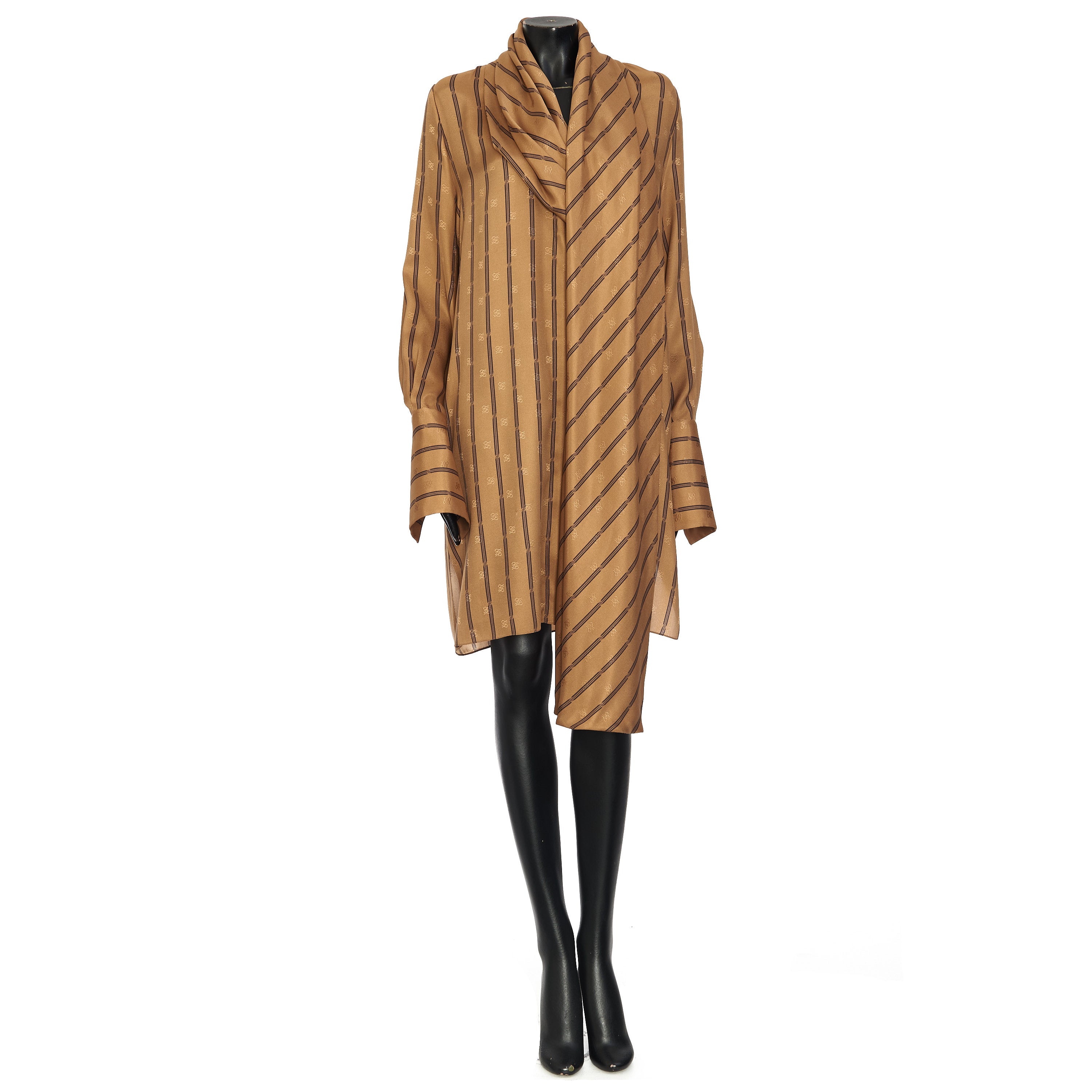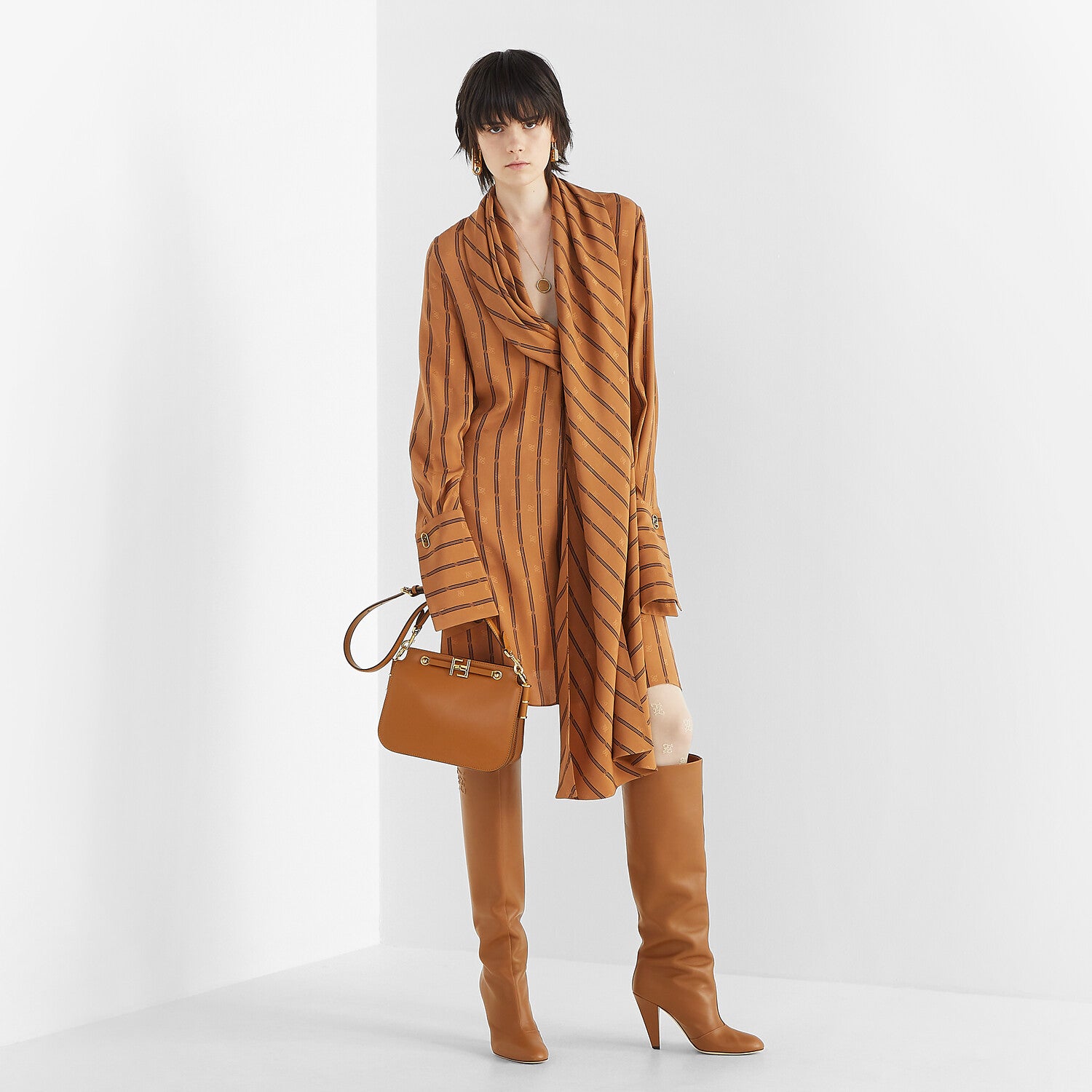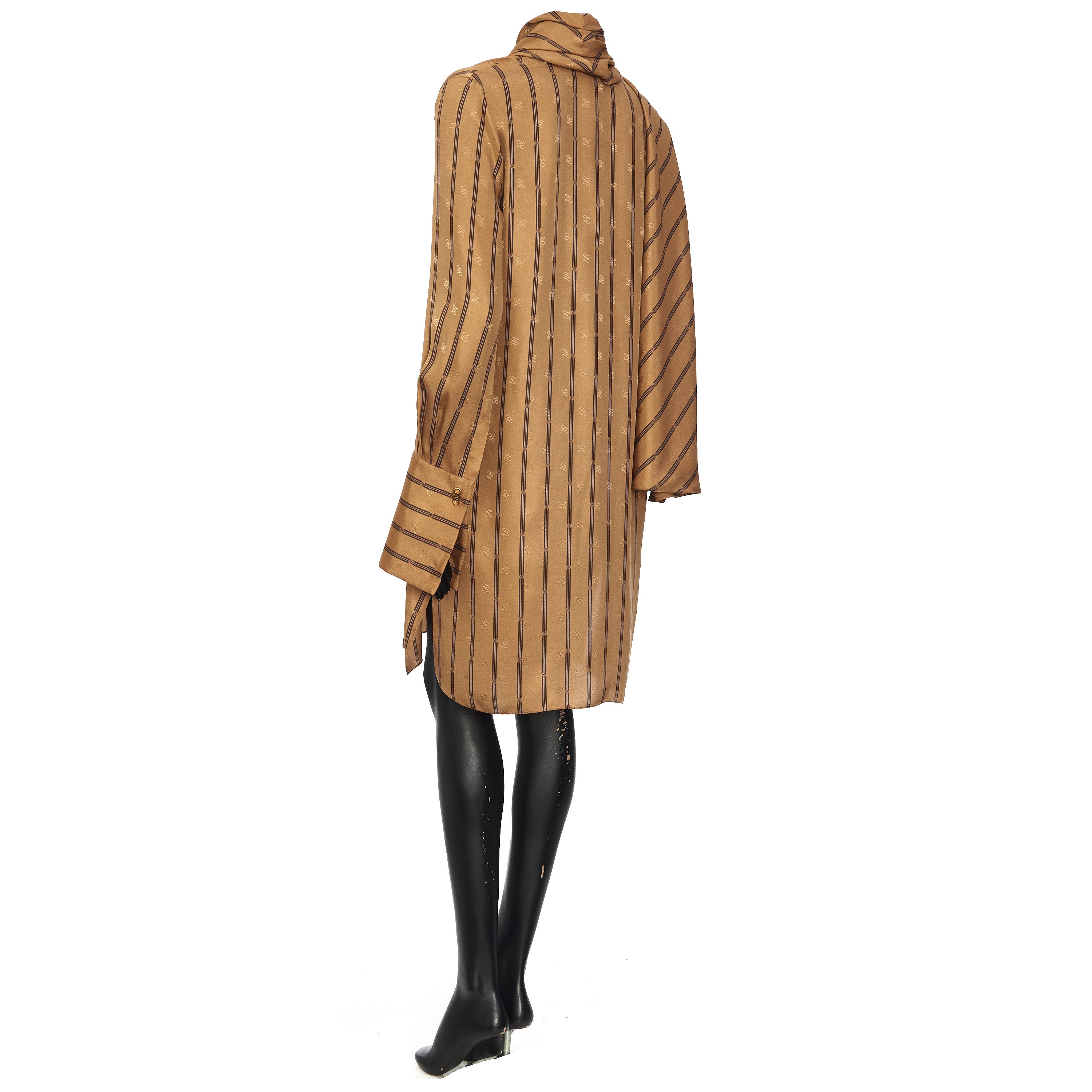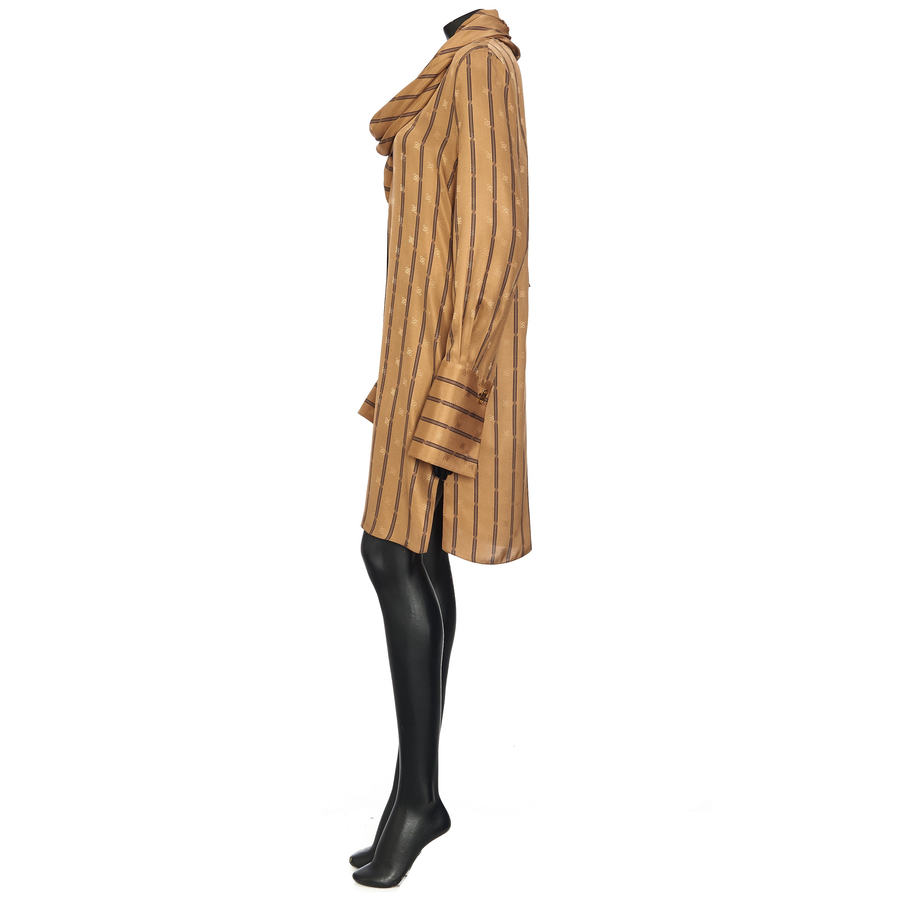 Short dress with V neck and long foulard. Made of light brown satin crêpe.