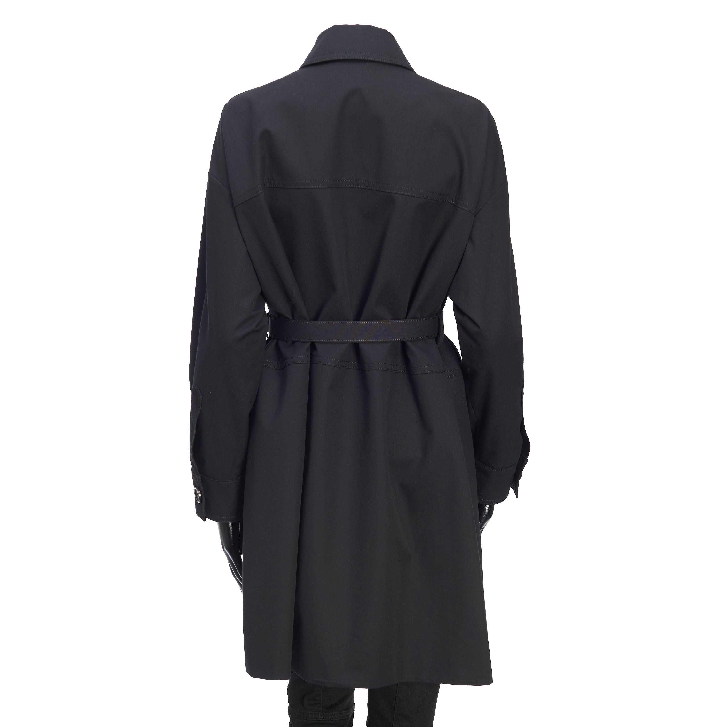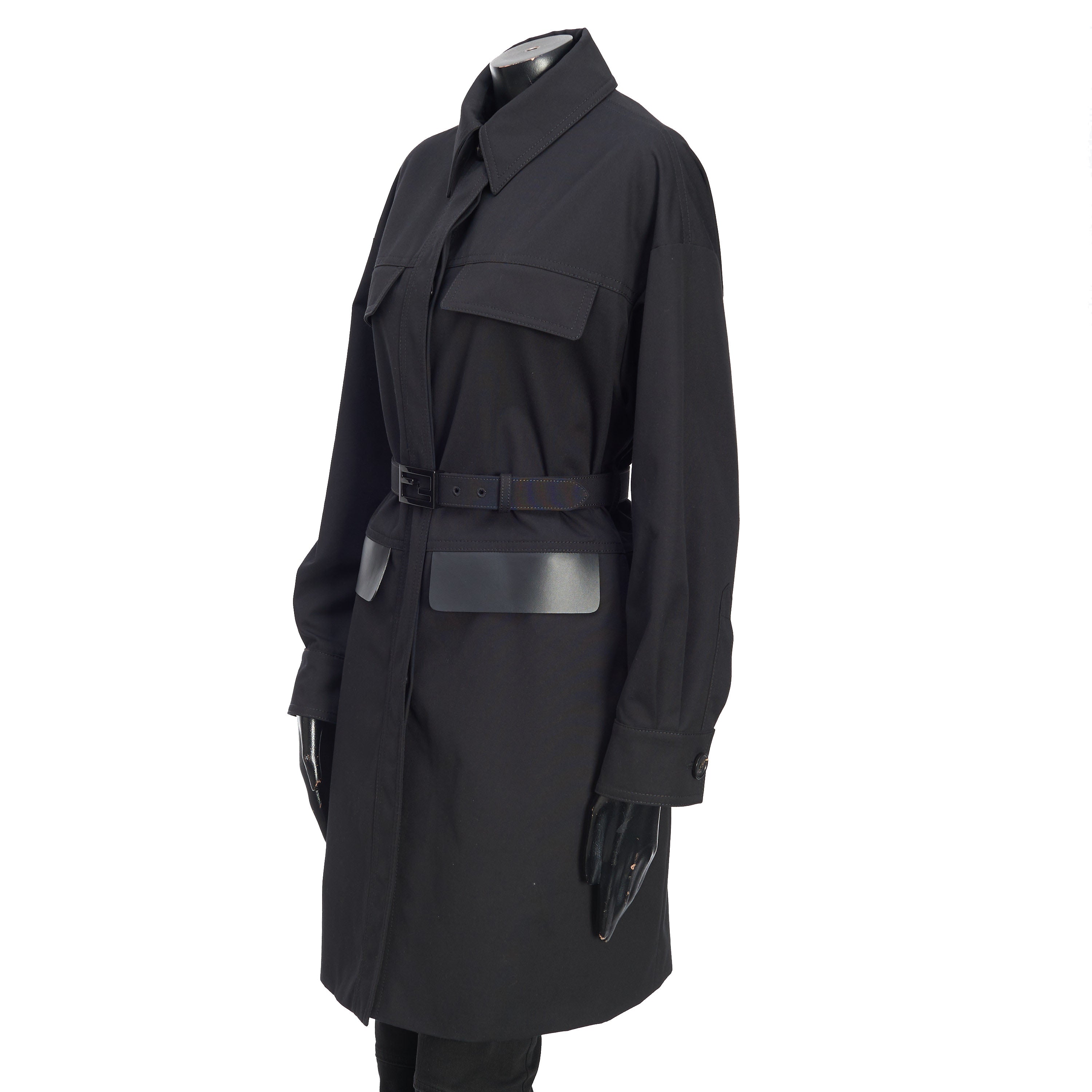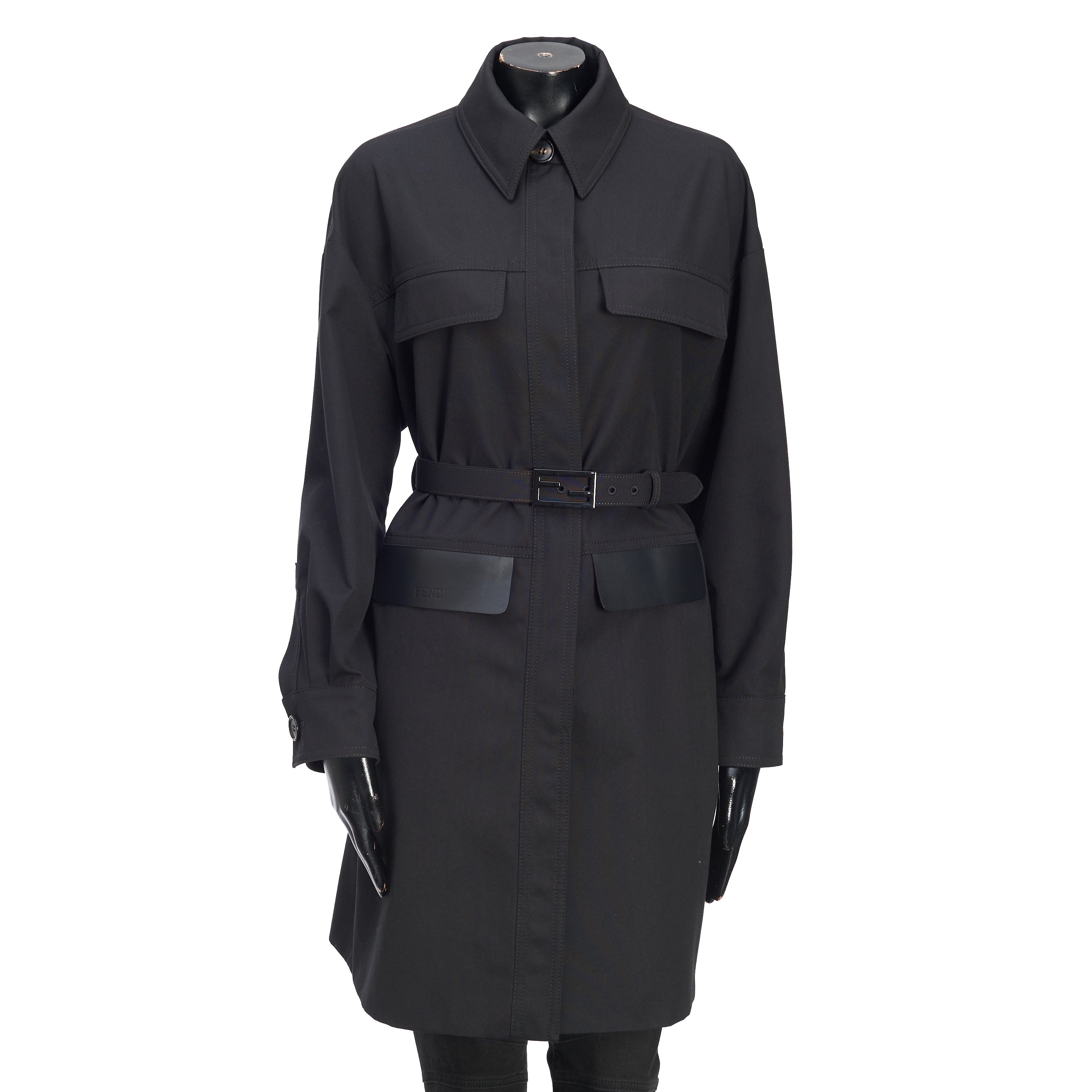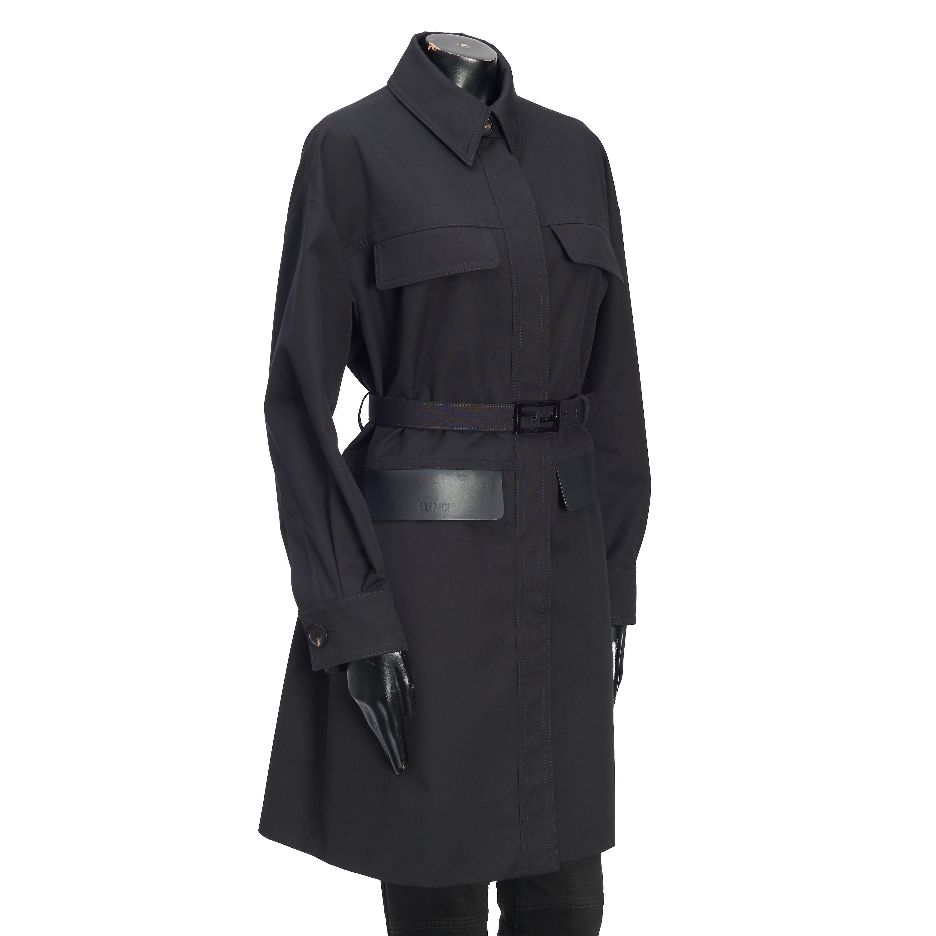 Black cotton-blend belted-waist single-breasted coat from FENDI featuring debossed logo, logo-buckle detail, classic collar, concealed front fastening, long sleeves, two chest flap pockets, two side flap pockets, buttoned cuffs and mid-length.