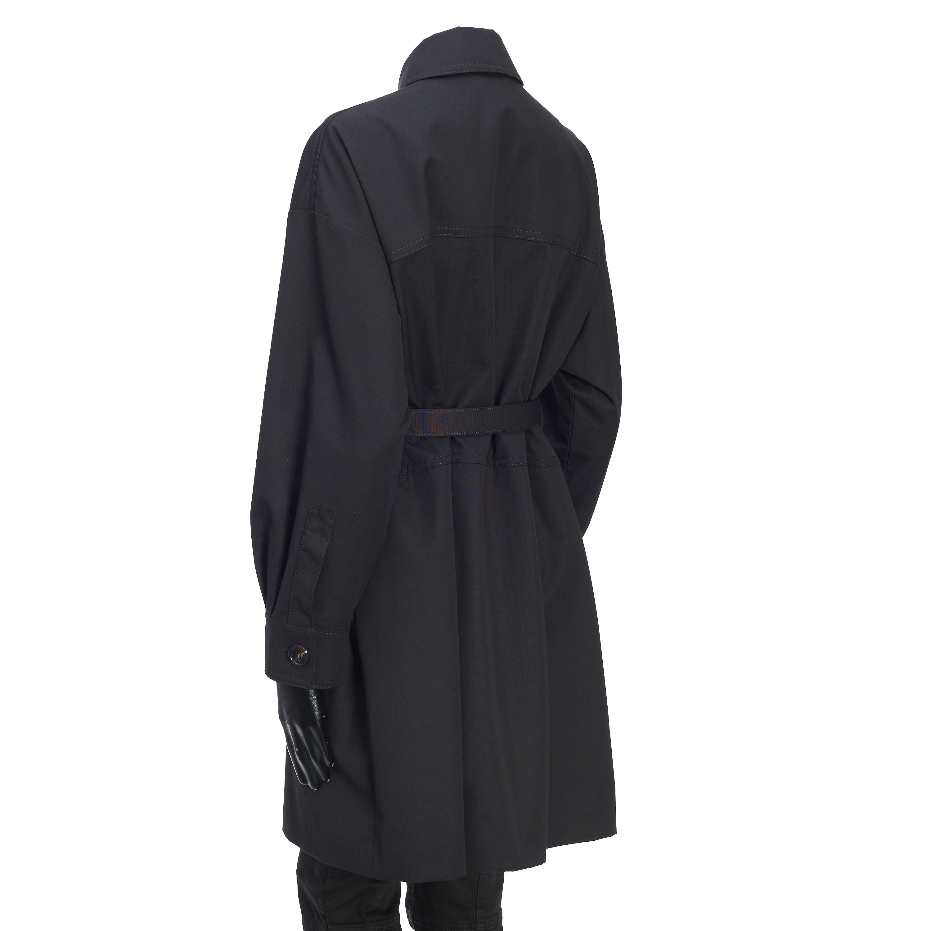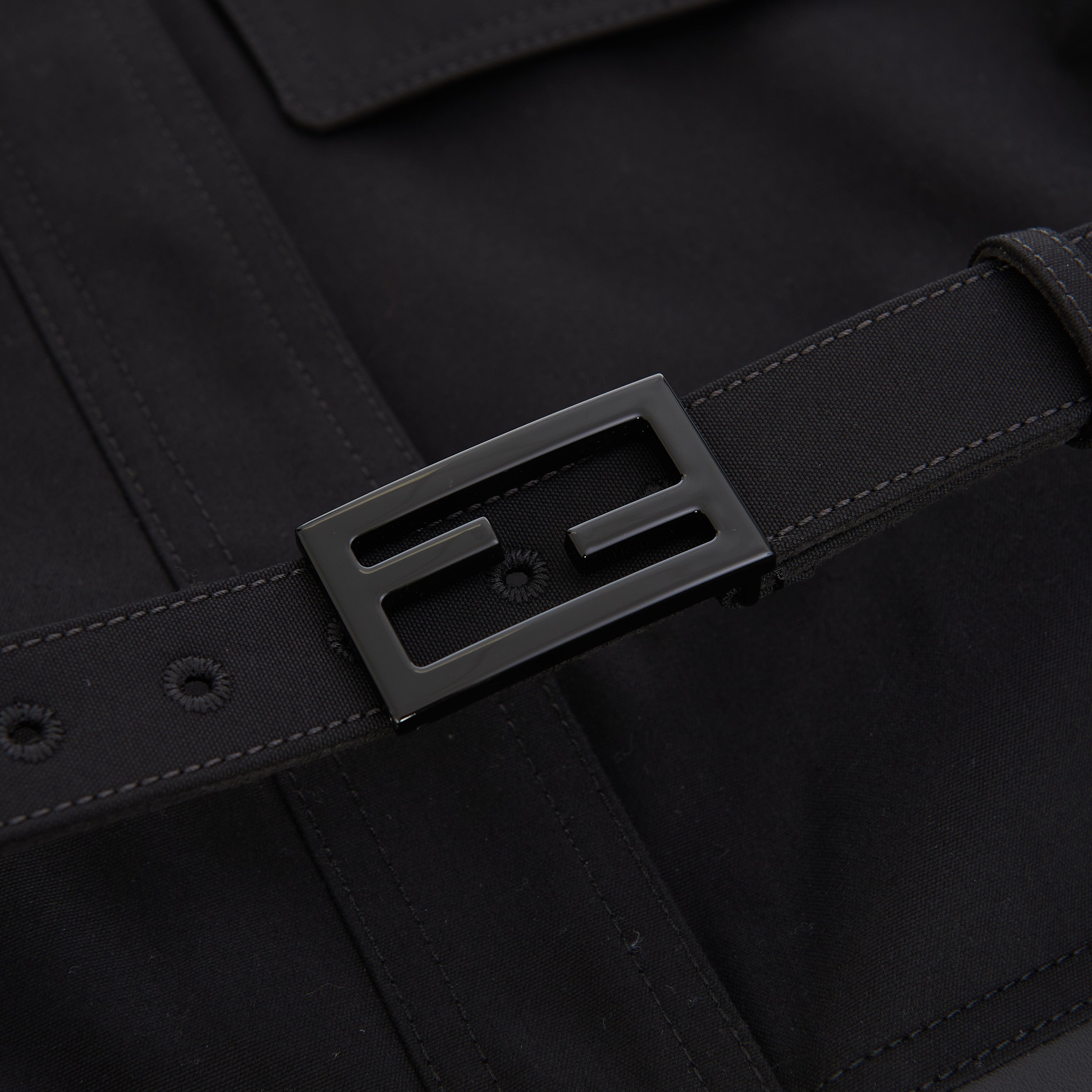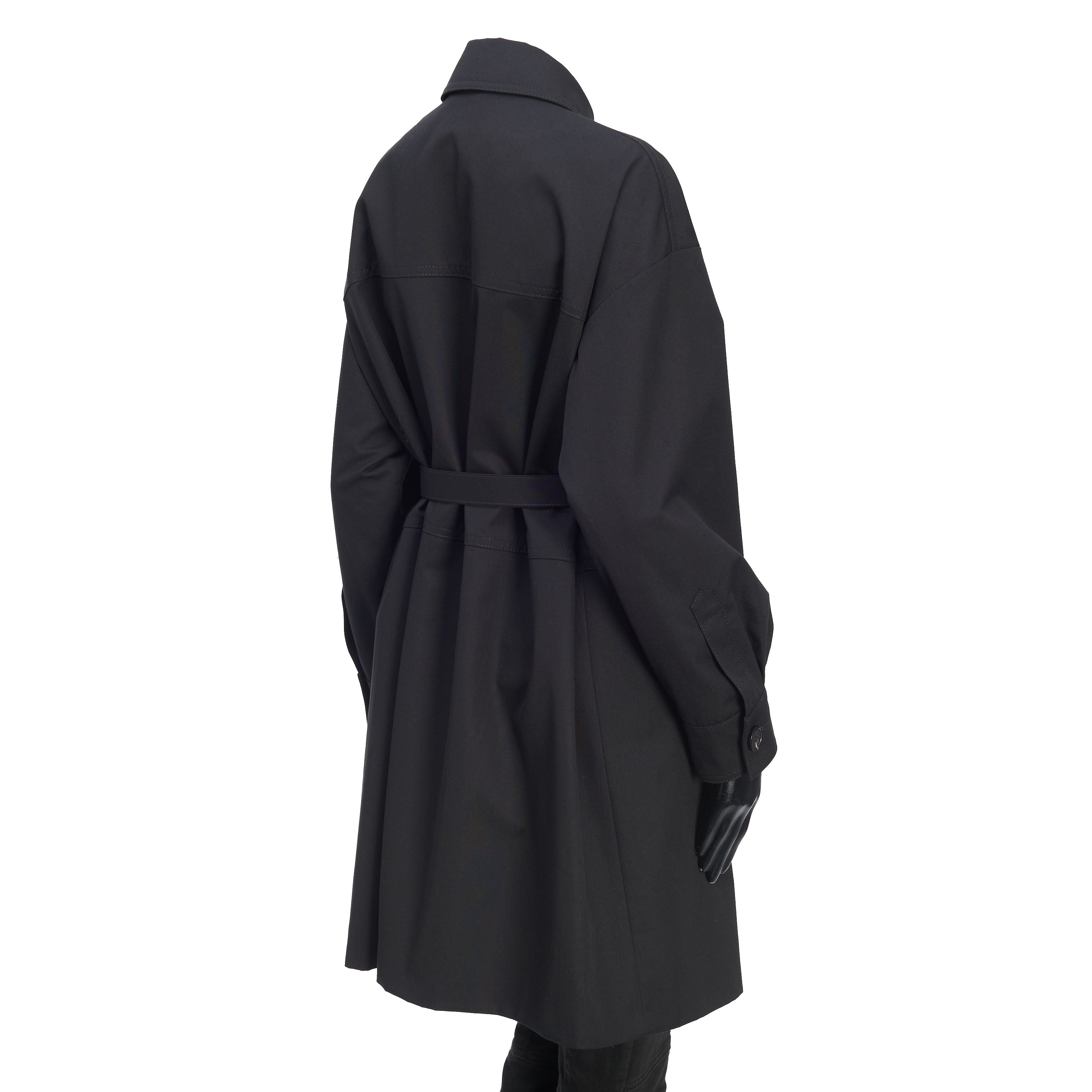 Black cotton-blend belted-waist single-breasted coat from FENDI featuring debossed logo, logo-buckle detail, classic collar, concealed front fastening, long sleeves, two chest flap pockets, two side flap pockets, buttoned cuffs and mid-length.