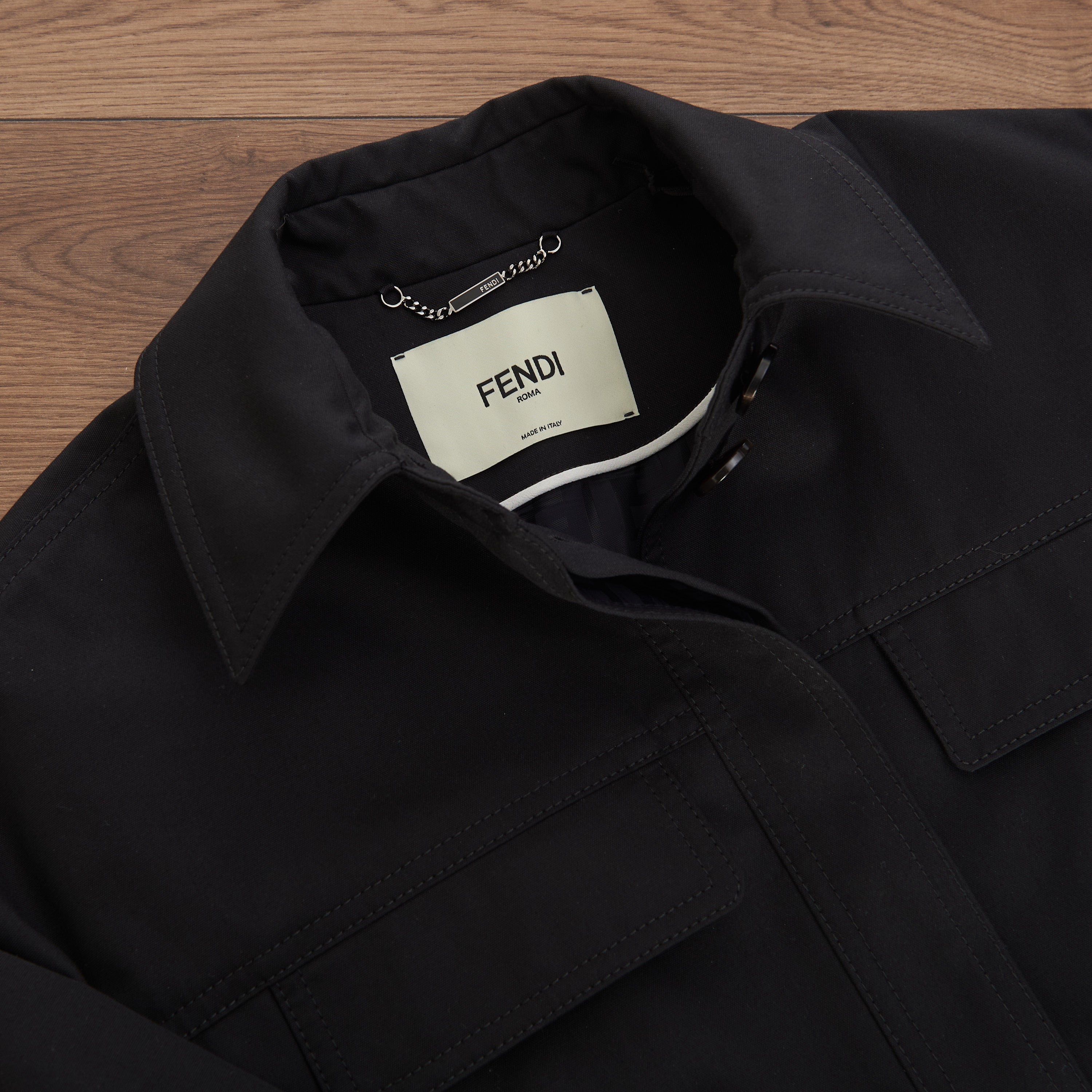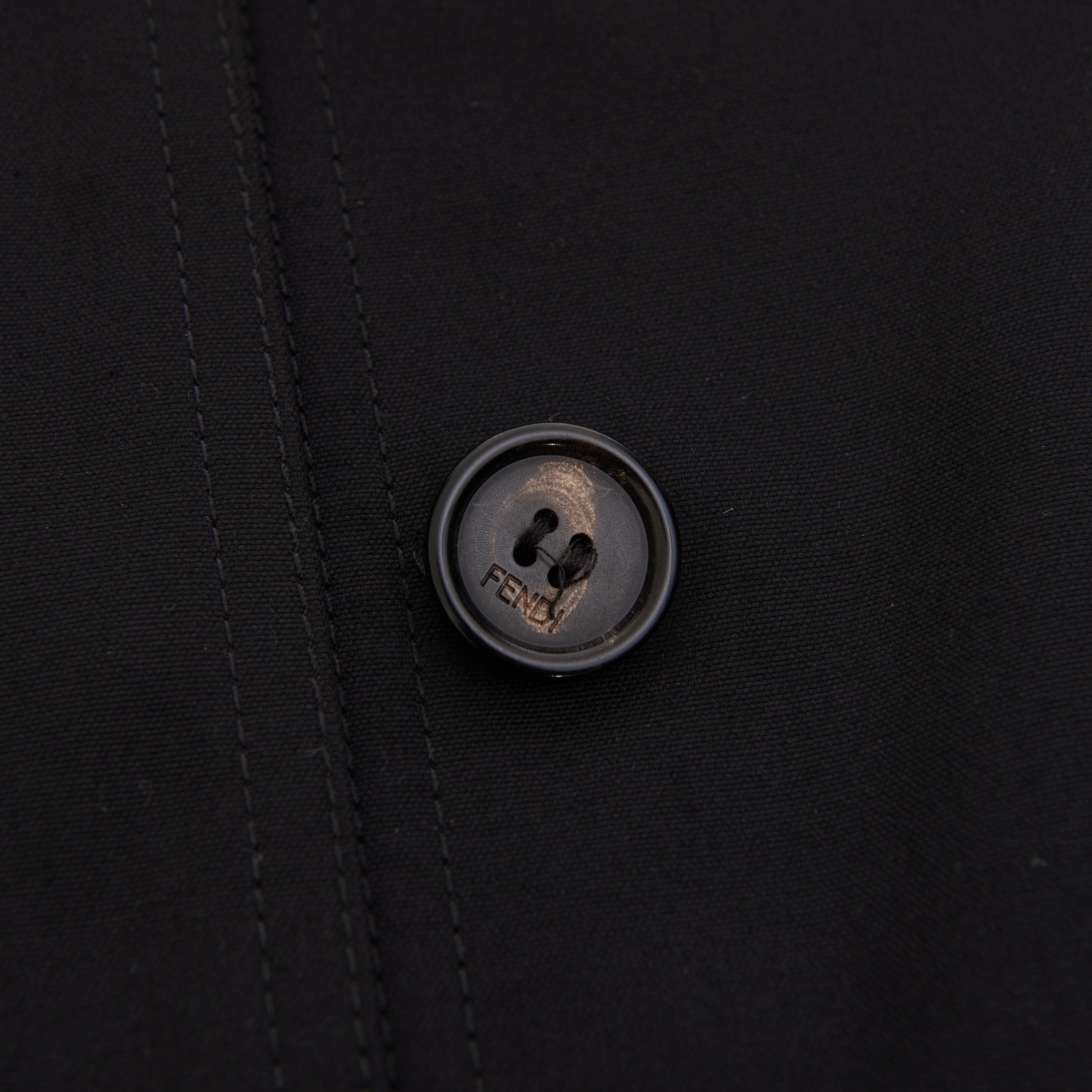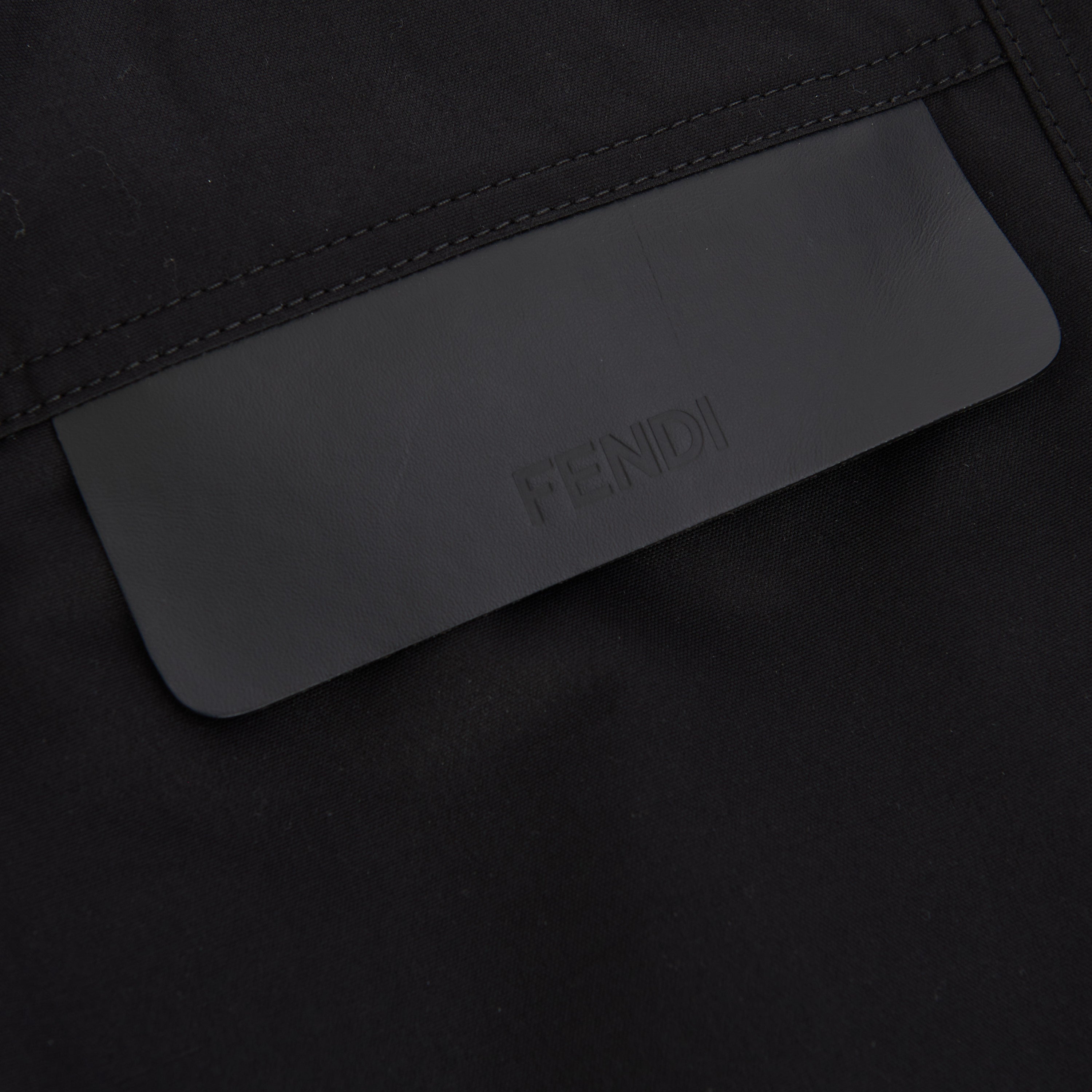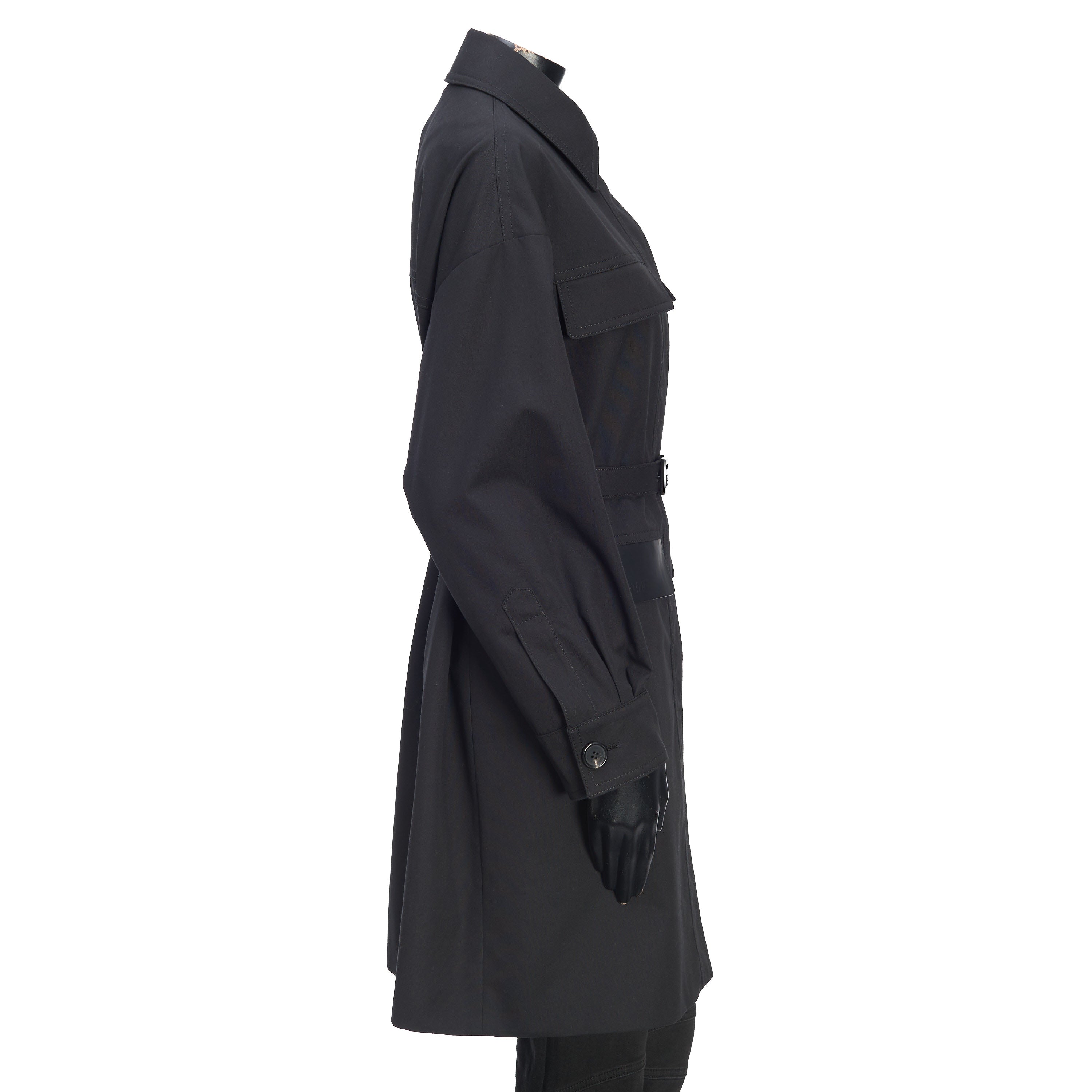 Black cotton-blend belted-waist single-breasted coat from FENDI featuring debossed logo, logo-buckle detail, classic collar, concealed front fastening, long sleeves, two chest flap pockets, two side flap pockets, buttoned cuffs and mid-length.