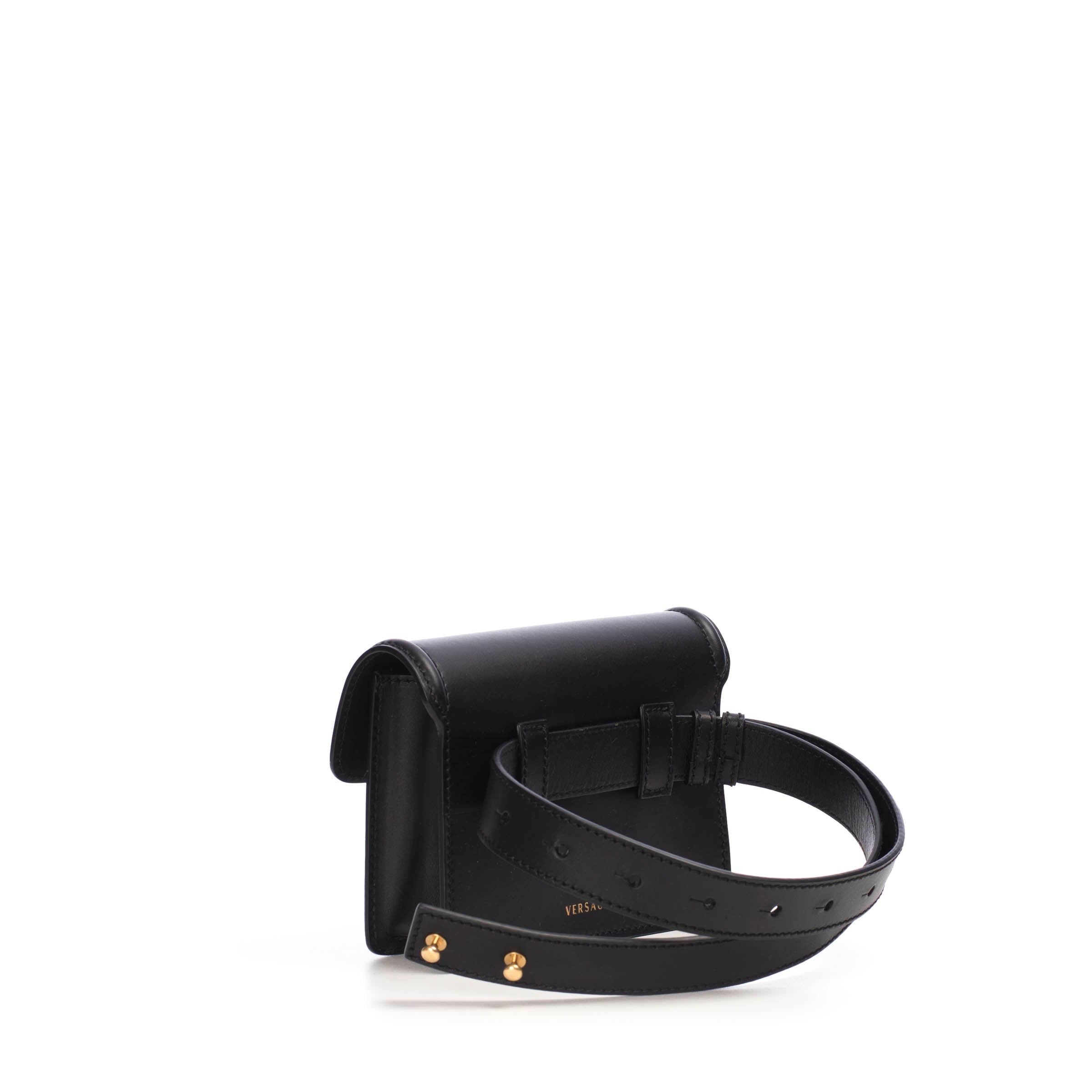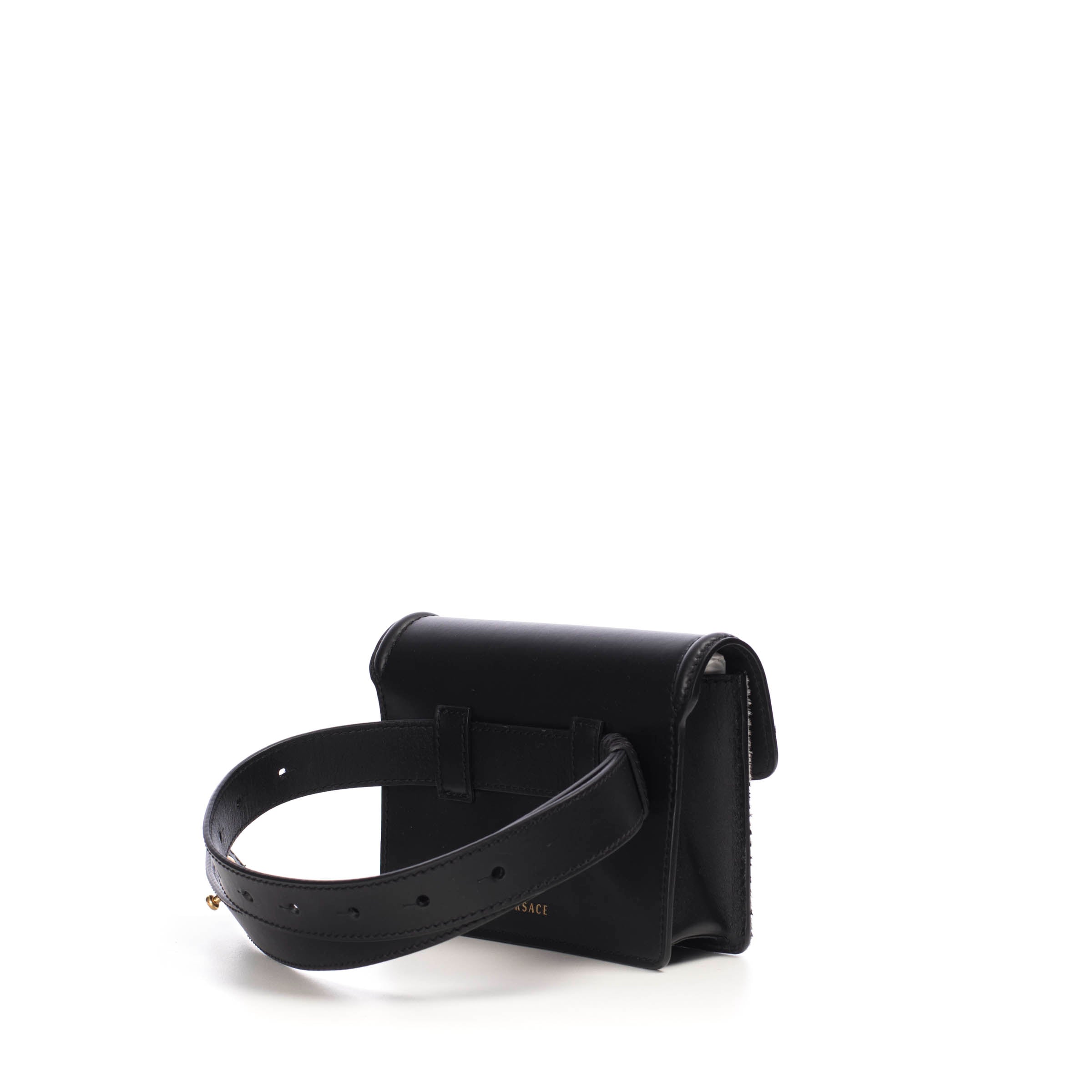 Supple calf leather belt bag with a Zebra motif calf hair cavallino insert. Features flap over closure with a Medusa medallion and an adjustable waist belt.